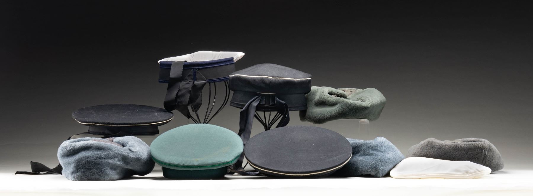This lot consists of 8 varied Cold War era Com-Bloc hats mostly East German & Russian. Hats appear to be a mix of both army & navy. CONDITION: one East German naval cap is missing much of its top. Other hats appear generally very good. (02-24217/MJC). $200-400 for lot.