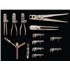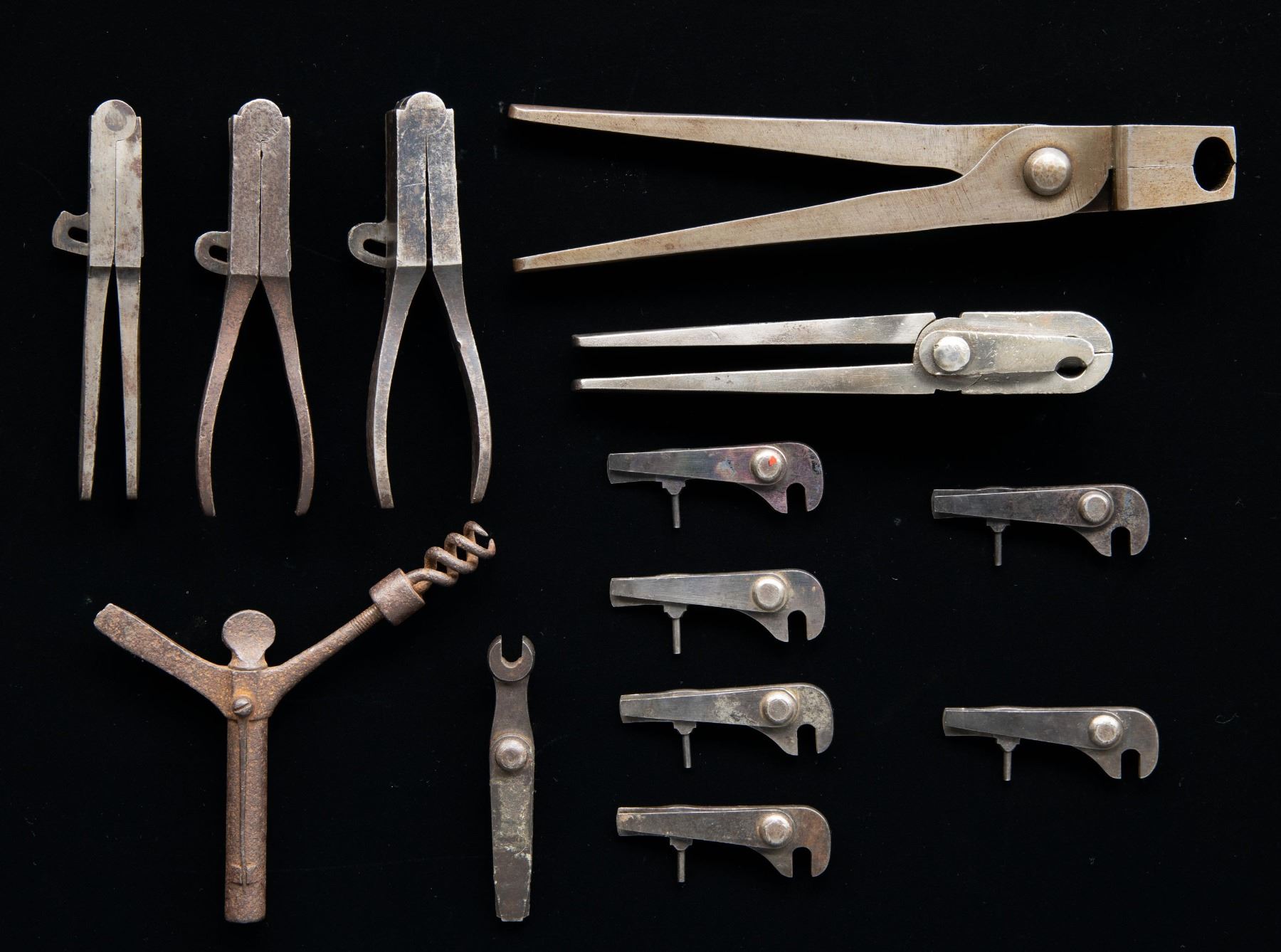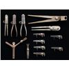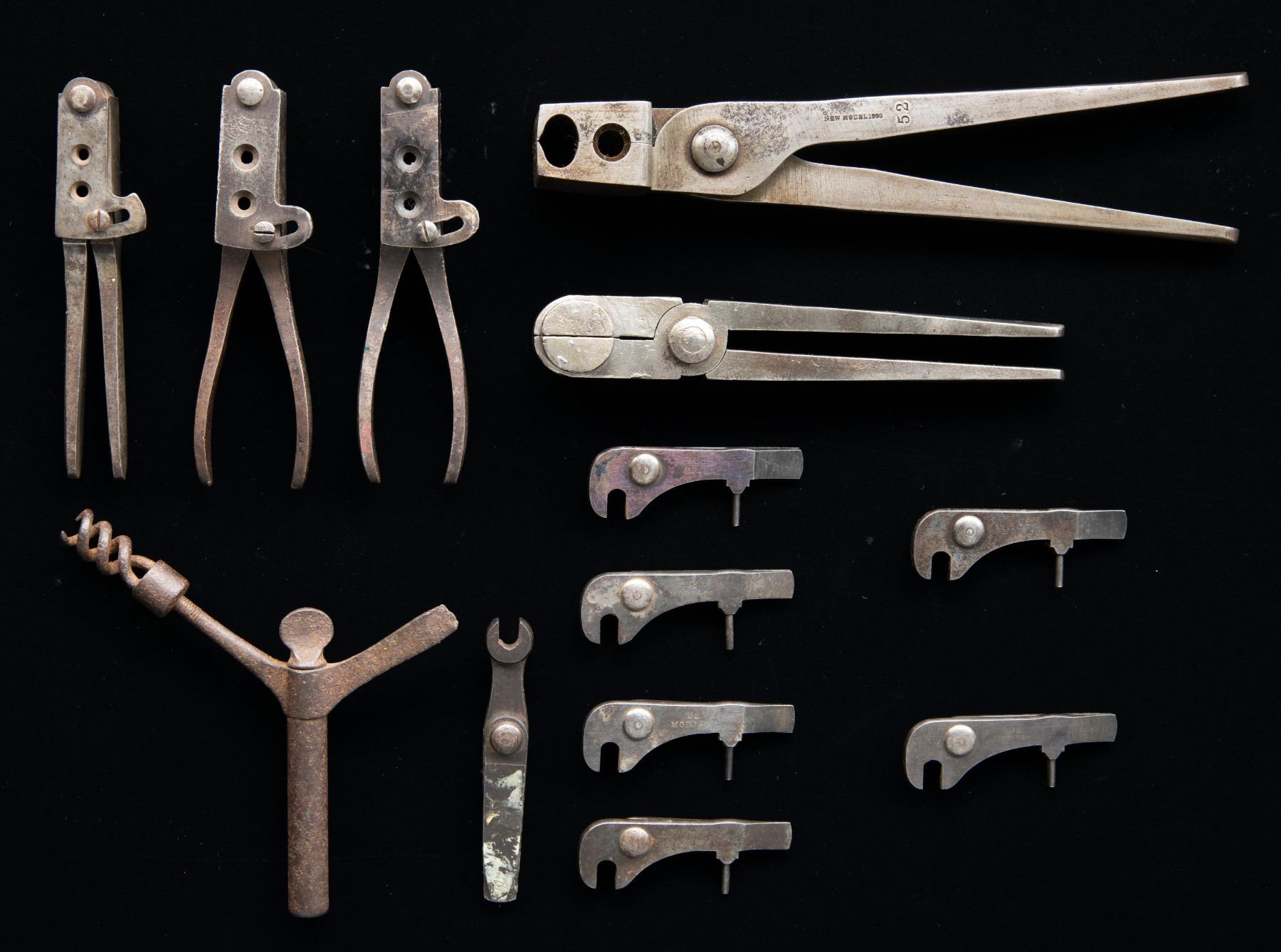 Lot of desirable bullet molds and capping tools, including: 1) Sharps New Model 1863 .52 caliber bullet mold. Right leg is marked "NEW MODEL 1863" vertically above a horizontal "52". Iron construction with single cavity bullet mold and sprue trimmer. CONDITION: good, with metal having faded to a gray patina, exhibiting patches of mild pitting and age related discoloration. 2) Burnside Model 1864 .54 caliber bullet mold. No markings present. Iron construction with single conical bullet mold cavity. CONDITION: good, with metal having faded to a gray patina, exhibiting scattered spots and patches of light to mild pitting, as well as scattered handling marks and impressions. 3) Colt Model 1860 .44 caliber bullet mold. Front of sprue cutter plate is marked "COLT'S/ PATENT". Side of the right block is marked "44H" above a "B" proof. Iron construction with blued finish and dual cavity molds (ball and conical bullet). Ball mold measures approx. 0.4585". CONDITION: metal retains fair to good amounts of its original blue finish, exhibiting areas of wear fading to gray patina, scattered patches of dark mild surface oxidation, as well as scattered handling marks and impressions. 4) Colt .44 caliber bullet mold. Front of sprue cutter plate is marked "COLT'S/ PATENT". Side of right block is stamped with an "H", followed by a mostly visible "44H". Iron construction with dual cavity molds (ball and conical bullet). Ball mold measures approx. 0.5600". CONDITION: metal has faded to a mottled gray patina, exhibiting scattered patches of light to mild surface oxidation and pitting, with scattered marks and impressions present overall. 5) Colt (apparent) Model 1849 Pocket .31 caliber bullet mold. Front of sprue cutter plate is marked "COLT'S/ PATENT". Blocks are unmarked. Iron construction with 2 cavity molds (ball and conical bullet). CONDITION: metal has faded to a mottled gray patina, exhibiting patches / areas of light to mild pitting and age related discoloration, as well as scattered marks and impressions from handling and storage. 6) x6 U.S. Model 1879 Trapdoor combination tools. Exterior flat of main bodies are marked "US./ MOD. 1879". Steel construction. Tools consist of 2 screwdrivers, a mainspring clamp, and band spring punch. CONDITION: combination tools exhibit varying degrees of wear, with scattered spots of light to mild surface oxidation and pitting. 7) U.S. Model 1855 musket combination tool. Iron construction, featuring 3 screwdriver heads and a nipple wrench. CONDITION: metal has faded to a dark gray patina, exhibiting consistent dark oxidation, with scattered patches of adhesive and an unidentified substance. 8) Unidentified percussion combination tool. Iron construction consisting of a helical auger, screwdriver head, and nipple removal wrench on the base. CONDITION: metal has faded to a dark gray / brown patina, exhibiting consistent moderate pitting overall. PROVENANCE: Estate Collection of John "Jack" Dhooghe. (02-25567/MLW). NON-GUN. $400-600.