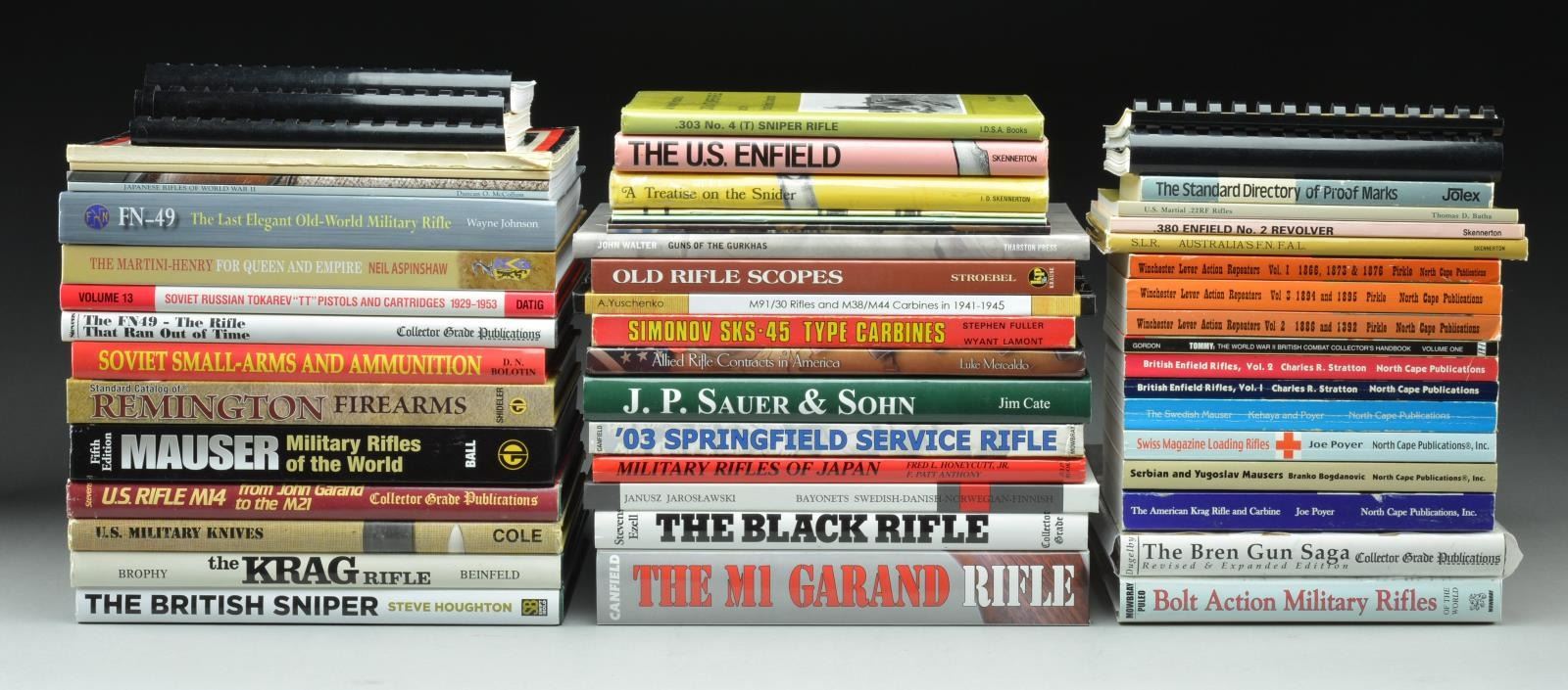 Over 50 Hardbound & softbound firearm books over a variety of subjects. Notable examples include: The Bren Gun Saga by Collector Grade Publications. / The Black Rifle by Collector Grade Publications. / FN49 The Last Elegant Old World MIlitary Rifle by Wayne Johnson. / The FN49- The Rifle That Ran Out of Time by Collector Grade Publications. / 5th Edition Mauser MIlitary Rifles of the World. / Allied Rifle Contacts in America by Mercaldo. / US Rifle M14 from John Garand to the M21 by Collector Grade Publications. CONDITION: good to very good overall w/ wear, sm. tears & general use. (02-16814-9/MD). $500-1000.