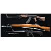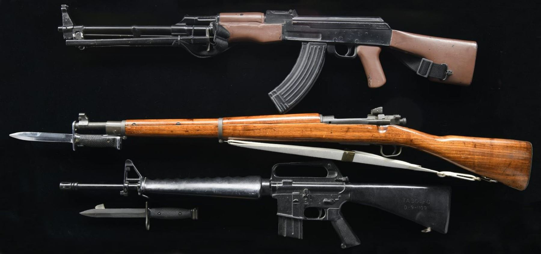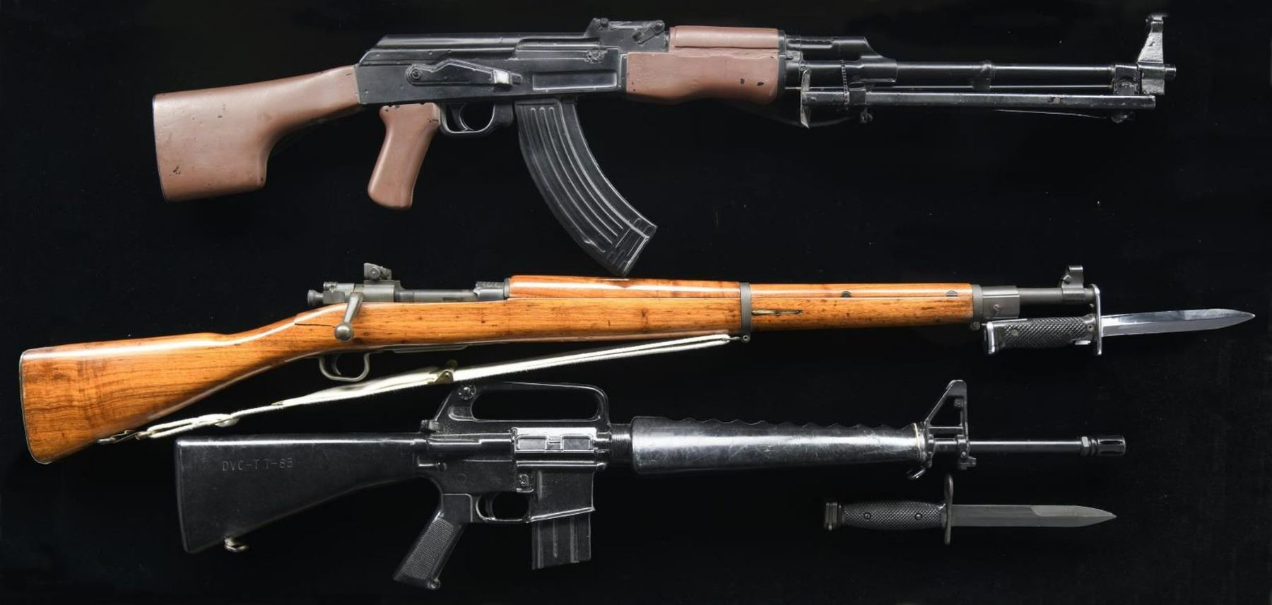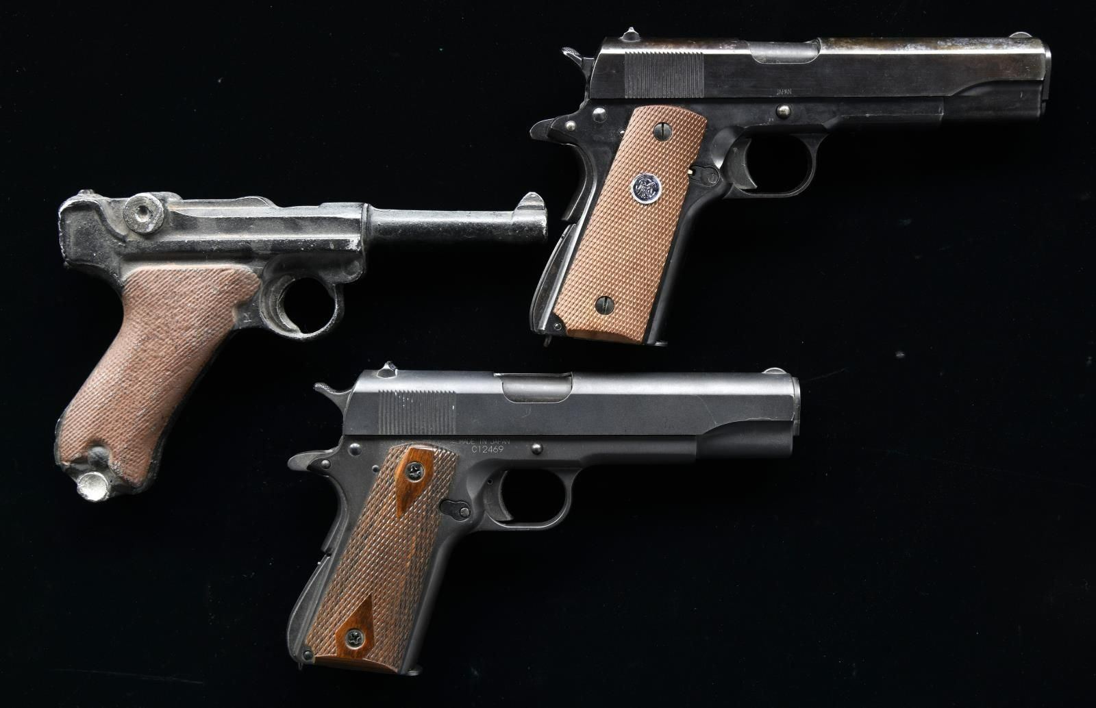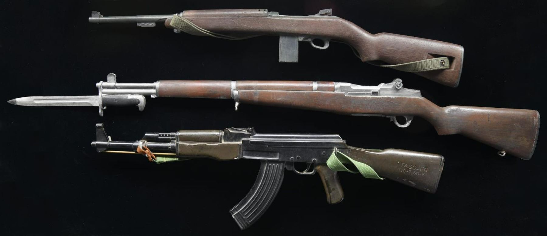This lot consists of the following dummy & training guns: 1. US Military Chinese Type 56 AK47 Dummy Gun. Dummy milled AK47 that resembles a Chinese Type 56. Left side of receiver has faux Arsenal "66" markings, Chinese characters & "TRAINING AIDS CENTER FT LEWIS WA" marking .Charging handle broken off. Green paint furniture. CONDITION: paint shows overall flaking, some chipping & scattered pitting. 2. RPK Dummy Gun Trainer. Milled RPK training gun. Left side of rear sight base marked "VIET-NAM TUL-1 1970 (Tula Star) 0640". Charging handle appears broken off. Black & green paint finish. Black nylon sling present. CONDITION: paint shows scattered flaking, some pitting & chipping. 3. AK47 Style Dummy Trainer. Milled AK47 style dummy trainer. Left side of butt marked "TASC-FG C-T 30-6" for the Training Aid Support Center at Fort Gordon, Georgia. Green & black paint finish. Green canvas sling. CONDITION: paint shows scattered flaking & bubbling. 4. M16A1 DUMMY TRAINER. M16A1 style dummy training rifle w/ BOC marked M7 bayonet. Right side of butt marked "DVC-T 7-83". Left side of receiver has Colt & M16A1 markings. Black paint finish. CONDITION: black paint shows scattered flaking & scuffing. 6. 1903 Springfield Dummy Trainer. US Navy 1903 style training rifle w/ USN MKI training bayonet & scabbard. Right side of butt is numbered "3152". CONDITION: gun has thickly added crude finish w/ a notable crack on left side in wrist, scattered flaking, bubbling & dings. 7. M1 Carbine Dummy Trainer. Unmarked dummy training gun that resembles a late production M1 Carbine. Green canvas sling present. CONDITION: there are several long notable cracks along the seam lines, some chipping, scattered dings & handling wear. 8. 1903A3 MK5-0 Dummy Trainer. 1903A3 style training rifle w/ white canvas sling & chrome plated M5 Imperial bayonet. CONDITION: stock has thickly added varnish w/ a large crack running from upper tang to under the bolt handle that is turning into a big chip. Stock otherwise shows a couple other smaller cracks, scattered dings & handling wear. Metal shows scattered silvering & light oxidation. 9. MKIII* SMLE Dummy Training Rifle. Unmarked Lee Enfield MKIII* training rifle. Bolt cycles & mag release like a real SMLE. CONDITION: stock set shows some dings & handling wear. Metal shows some silvering & light oxidation. 10. M1 Garand Dummy Training Rifle. M1 Garand style dummy training rifle w/ fixed non-removable 1942 style dummy bayonet. Receiver & bolt have H&R style markings. Charging handle broken off. Silver & brown painted finishes. CONDITION: safety appears chipped, seams are cracking, other parts show scattered flaking & chipping. 11. Japanese Made 1911A1 Dummy Gun. Japanese made 1911A1 replica gun. Slide cycles, trigger fires, safety & mag release operate like a real pistol. MAGS: 1 dummy mag. CONDITION: metal shows scattered scratches & handling wear. 12. MGC Japan 1911A1-67 Replica Pistol. MGC made 1911A1-67 pistol Action, safety & mag release all operate like a real 1911. MAGS: 1 dummy mag. CONDITION: metal shows scattered flaking black enamel & oxidation. 13. Dummy Luger P08 Pistol. Unmarked dummy replica metal Luger pistol. CONDITION: paint shows overall flaking, some staining & scattered oxidation. PROVENANCE: From the Lifelong Collection of Glen E. Mattox. (02-18679/MJC). $400-600.