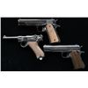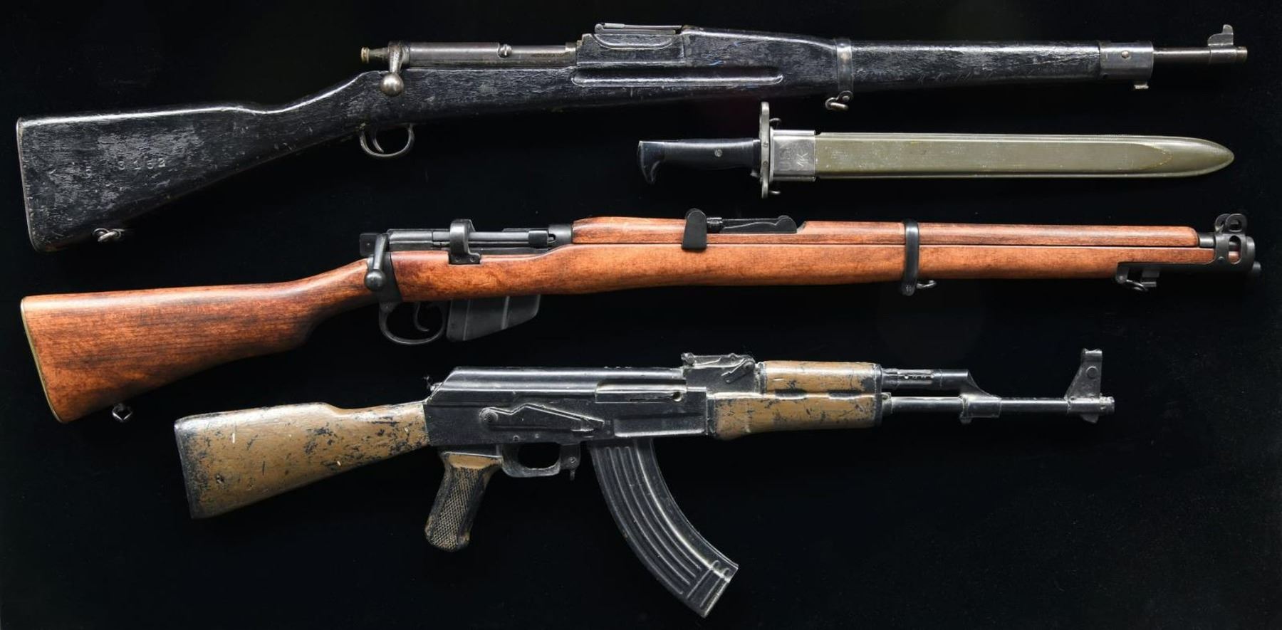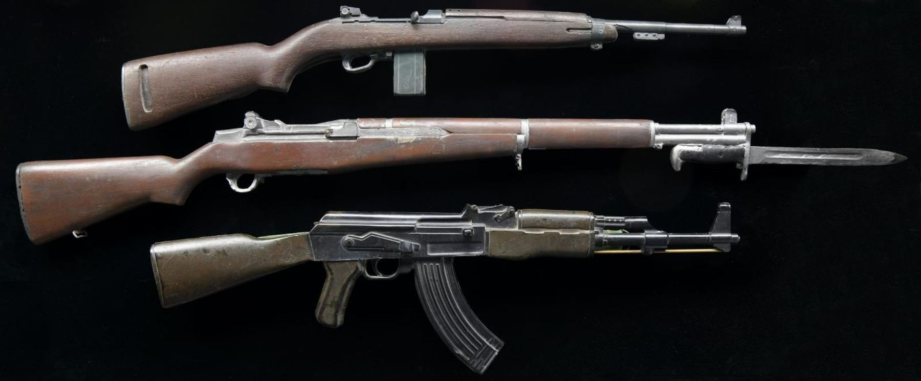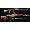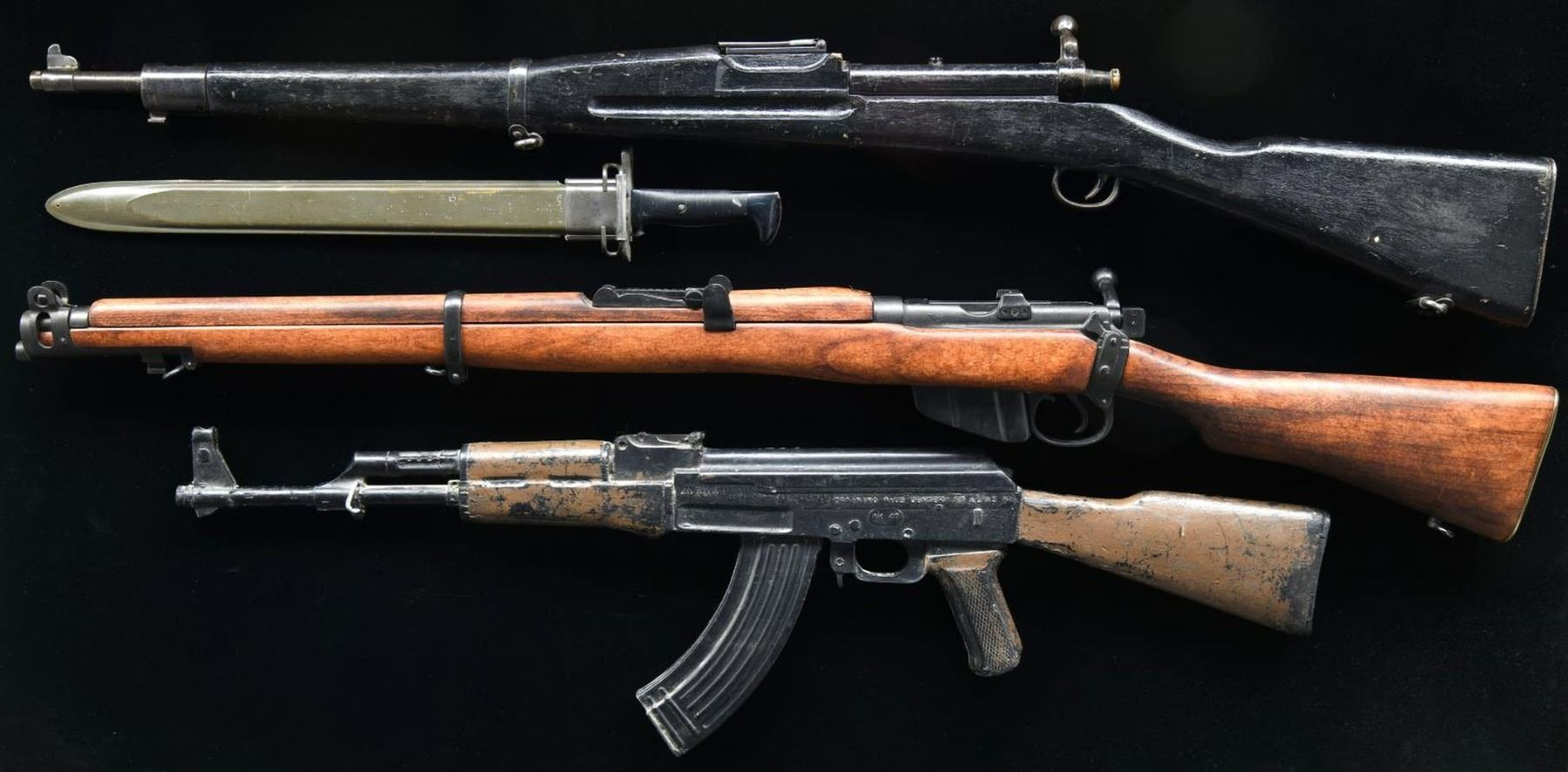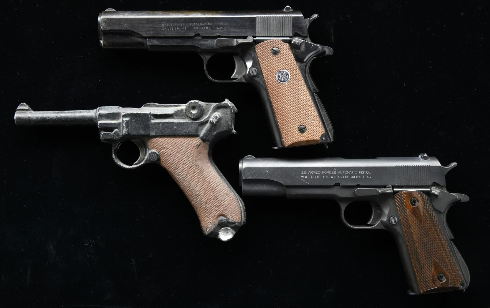 This lot consists of the following dummy & training guns: 1. US Military Chinese Type 56 AK47 Dummy Gun. Dummy milled AK47 that resembles a Chinese Type 56. Left side of receiver has faux Arsenal "66" markings, Chinese characters & "TRAINING AIDS CENTER FT LEWIS WA" marking .Charging handle broken off. Green paint furniture. CONDITION: paint shows overall flaking, some chipping & scattered pitting. 2. RPK Dummy Gun Trainer. Milled RPK training gun. Left side of rear sight base marked "VIET-NAM TUL-1 1970 (Tula Star) 0640". Charging handle appears broken off. Black & green paint finish. Black nylon sling present. CONDITION: paint shows scattered flaking, some pitting & chipping. 3. AK47 Style Dummy Trainer. Milled AK47 style dummy trainer. Left side of butt marked "TASC-FG C-T 30-6" for the Training Aid Support Center at Fort Gordon, Georgia. Green & black paint finish. Green canvas sling. CONDITION: paint shows scattered flaking & bubbling. 4. M16A1 DUMMY TRAINER. M16A1 style dummy training rifle w/ BOC marked M7 bayonet. Right side of butt marked "DVC-T 7-83". Left side of receiver has Colt & M16A1 markings. Black paint finish. CONDITION: black paint shows scattered flaking & scuffing. 6. 1903 Springfield Dummy Trainer. US Navy 1903 style training rifle w/ USN MKI training bayonet & scabbard. Right side of butt is numbered "3152". CONDITION: gun has thickly added crude finish w/ a notable crack on left side in wrist, scattered flaking, bubbling & dings. 7. M1 Carbine Dummy Trainer. Unmarked dummy training gun that resembles a late production M1 Carbine. Green canvas sling present. CONDITION: there are several long notable cracks along the seam lines, some chipping, scattered dings & handling wear. 8. 1903A3 MK5-0 Dummy Trainer. 1903A3 style training rifle w/ white canvas sling & chrome plated M5 Imperial bayonet. CONDITION: stock has thickly added varnish w/ a large crack running from upper tang to under the bolt handle that is turning into a big chip. Stock otherwise shows a couple other smaller cracks, scattered dings & handling wear. Metal shows scattered silvering & light oxidation. 9. MKIII* SMLE Dummy Training Rifle. Unmarked Lee Enfield MKIII* training rifle. Bolt cycles & mag release like a real SMLE. CONDITION: stock set shows some dings & handling wear. Metal shows some silvering & light oxidation. 10. M1 Garand Dummy Training Rifle. M1 Garand style dummy training rifle w/ fixed non-removable 1942 style dummy bayonet. Receiver & bolt have H&R style markings. Charging handle broken off. Silver & brown painted finishes. CONDITION: safety appears chipped, seams are cracking, other parts show scattered flaking & chipping. 11. Japanese Made 1911A1 Dummy Gun. Japanese made 1911A1 replica gun. Slide cycles, trigger fires, safety & mag release operate like a real pistol. MAGS: 1 dummy mag. CONDITION: metal shows scattered scratches & handling wear. 12. MGC Japan 1911A1-67 Replica Pistol. MGC made 1911A1-67 pistol Action, safety & mag release all operate like a real 1911. MAGS: 1 dummy mag. CONDITION: metal shows scattered flaking black enamel & oxidation. 13. Dummy Luger P08 Pistol. Unmarked dummy replica metal Luger pistol. CONDITION: paint shows overall flaking, some staining & scattered oxidation. PROVENANCE: From the Lifelong Collection of Glen E. Mattox. (02-18679/MJC). $400-600.