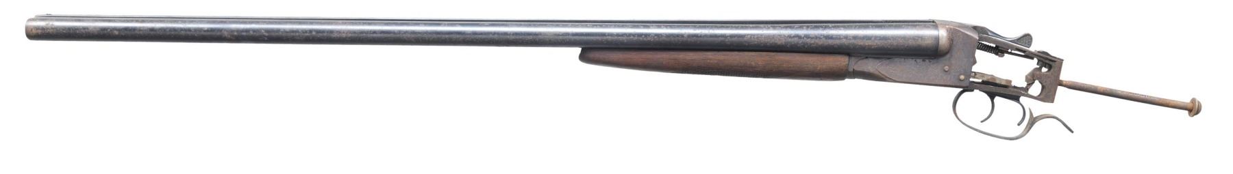1) AMERICAN SXS HAMMER SHOTGUN. Cal. 10 Ga. NSN. Bbls. 32 1/2". Bead front sight. Hammer shotgun that appears to be of American mfg. Hardwood stock set. CONDITION: stock set shows overall staining, scattered cracks & chips. Metal shows overall oxidation with some pitting. Action not functioning properly. Dark oxidized bores. (24-4875/MJC). CURIO. 2) BELGIAN SXS HAMMER SHOTGUN. Cal. 20 Ga. NSN. Bbls. 27". Underlever sidehammer shotgun that appears to be missing a few small parts. Bottom half of buttplate missing. CONDITION: stock shows a few large chips, some cracks & notable staining. metal is an overall oxidized patina. Action not functioning & locks are loose of stock. Oxidized bores. (24-4879/MJC). CURIO. 3) FOX B BBL ACTION SXS SHOTGUN. Cal. 12 Ga 2 3/4. NSN. Bbls. 30". Bead front sight. Parts lot with frame, bbls., lever, safety, both triggers & trigger guard. CONDITION: metal shows overall oxidation & traces of original blue. Bores show scattered oxidation. (24-4886/MJC). MODERN. 4) KEYSTONE ARMS SXS SHOTGUN. Cal. 12 Ga. NSN. Bbls. 28". Bead front sight. Markings on bbl. obscured by oxidation. CONDITION: stock set shows outline of a sticker on left side, scattered flaking & staining. Metal shows overall oxidation with some pitting. Action not opening. Oxidized poor bores. (24-4893/MJC). CURIO. 5) BELGIAN HAMMER SXS SHOTGUN. Cal. 16 Ga. S# 9800. Bbls. 30". Bead front sight. Bbl. marked in part "BELGIUM PATENT" but markings obscured by oxidation. Parts gun that includes frame, bbls., stock set trigger assembly & lever. Lock assemblies not present. CONDITION: stock set shows overall staining, rot & some cracks. Metal shows overall oxidation. Action not functioning. Dark pitted bores. (24-4899/MJC). CURIO. $250-400 for lot.