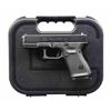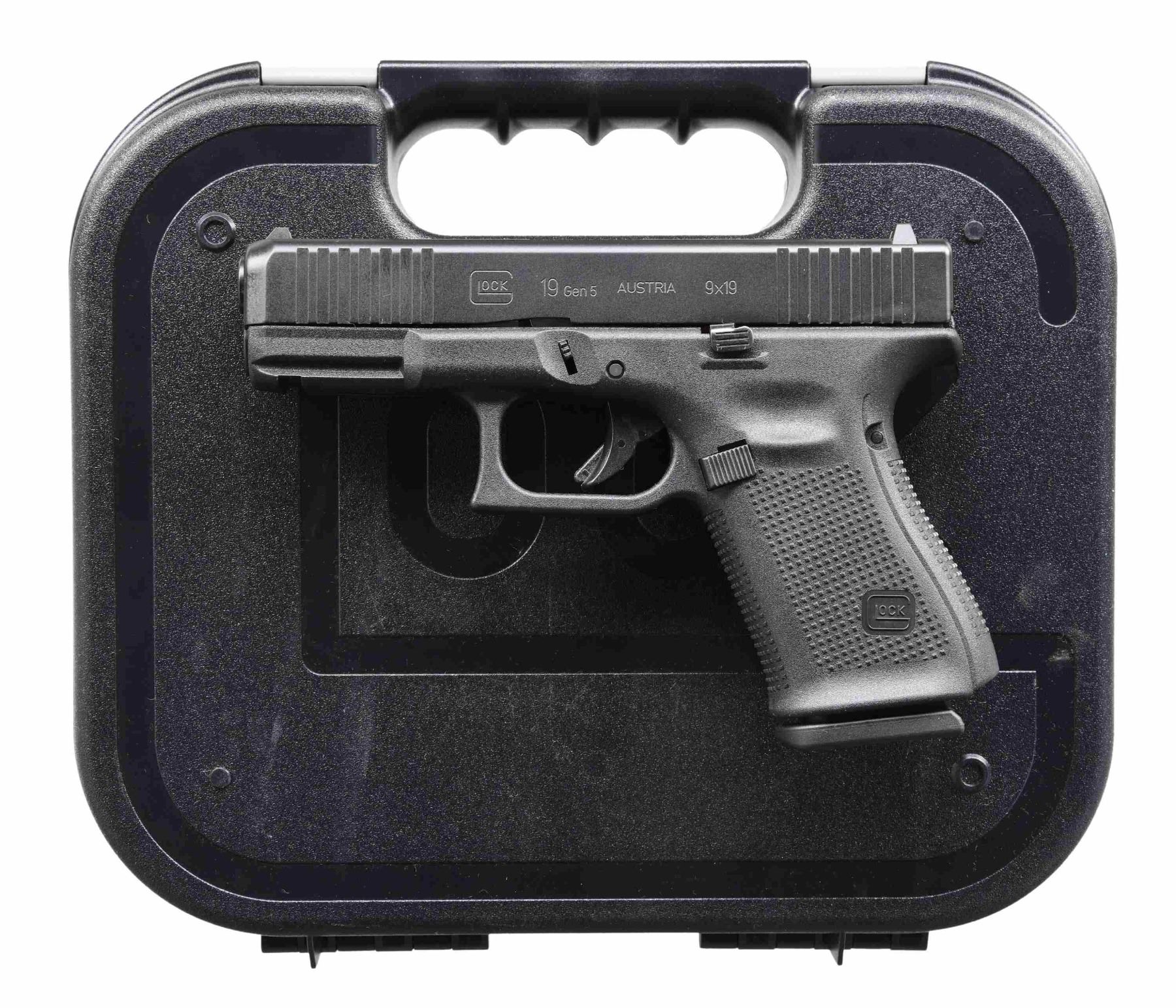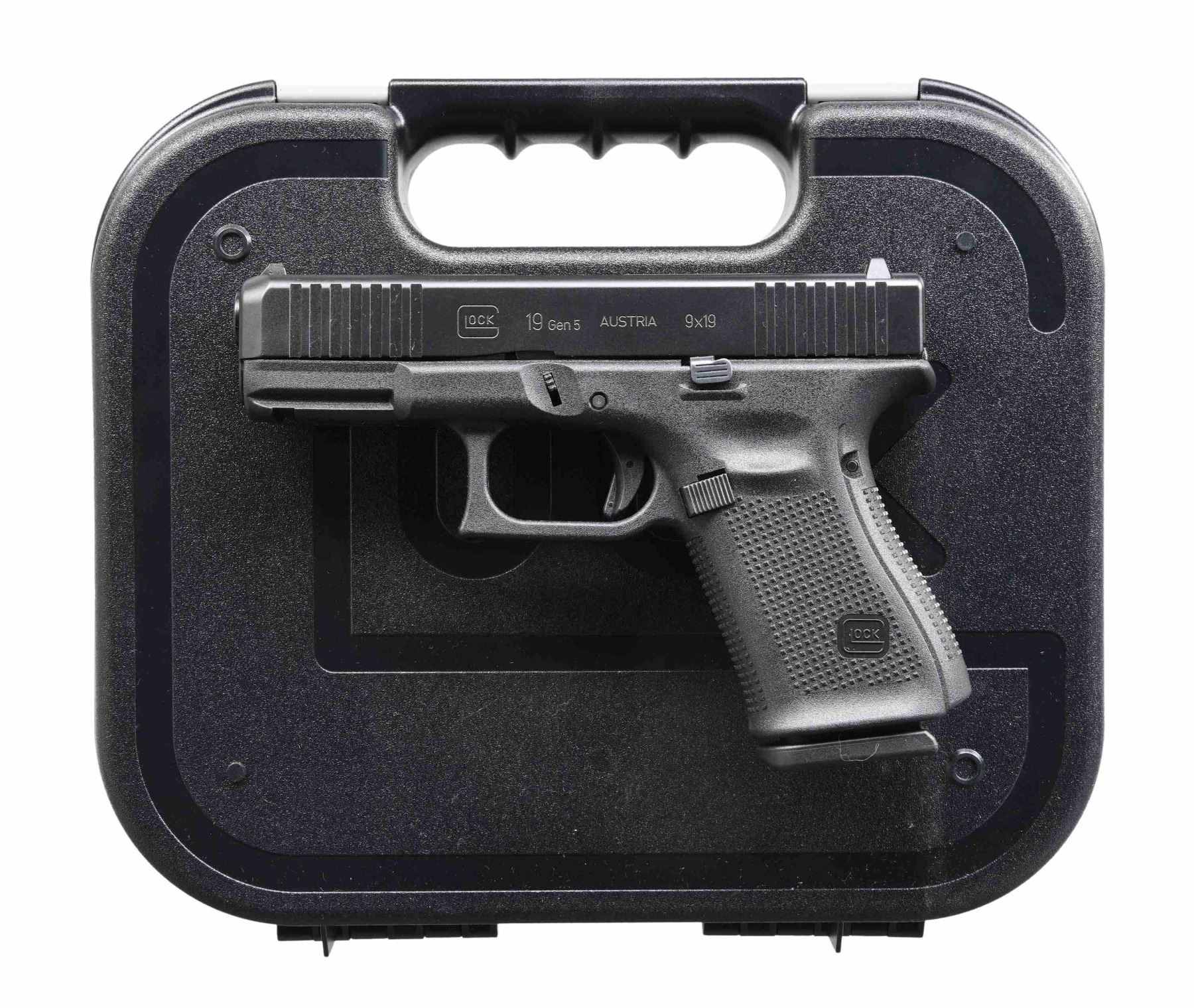 PISTOLS. All Cal. 9mm Luger. S#'s BUYP901, BUYP902, BUYP903 & BUYP904. Bbls. 4". Standard white outline Glock sights. Austrian made Gen 5 Glock 19 pistols. Matte black finish. Front & rear slide serrations. Polymer frames with accessory rails. MAGS: 12-15 rd. UNATTACHED ACCESSORIES: four matching numbered factory hardcases each with cable lock, cleaning rods, mag loader & manual, two grip straps. CONDITION: all aspects near excellent. (24-2249, 24-2250, 24-2251 & 24-2252/MJC). ALL MODERN. $1200-2400 for lot.