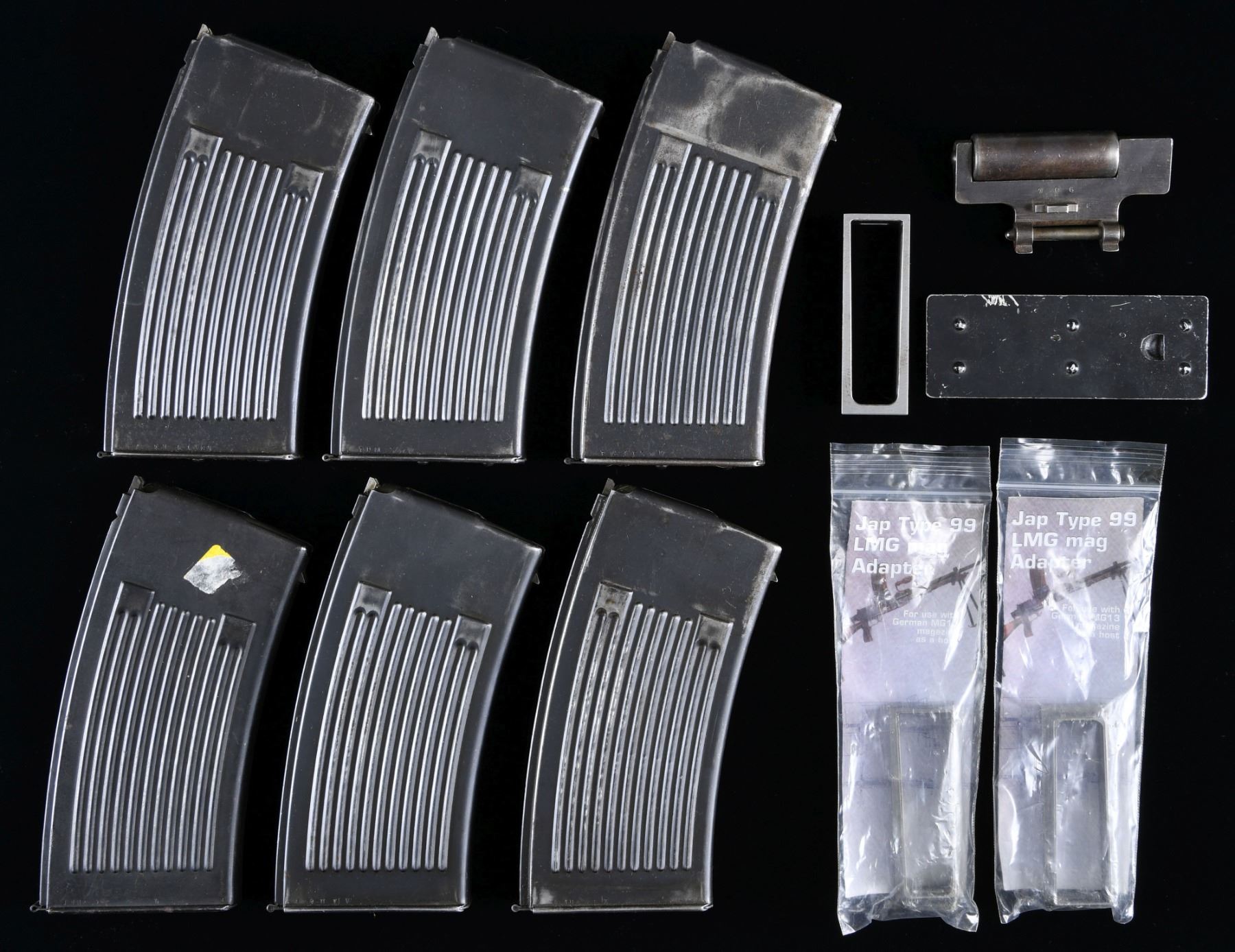 This lot consists of the following items: 1) Three Troy Edhlund Type 99 LMG MG-13 adapters. One mag is loose & other two in plastic. 2) Six 25 rd. MG-13 Mags. 3) Type 92 HMG Roller Feedblock numbered "706". 4) Type 92 HMG Rear sight cover. CONDITION: mags & adapters rate very good or better. Type 92 parts show expected wear with some light oxidation. PROVENANCE: From the Lifelong Collection of Brian Linde. (02-23926-16/MJC). $200-400.
