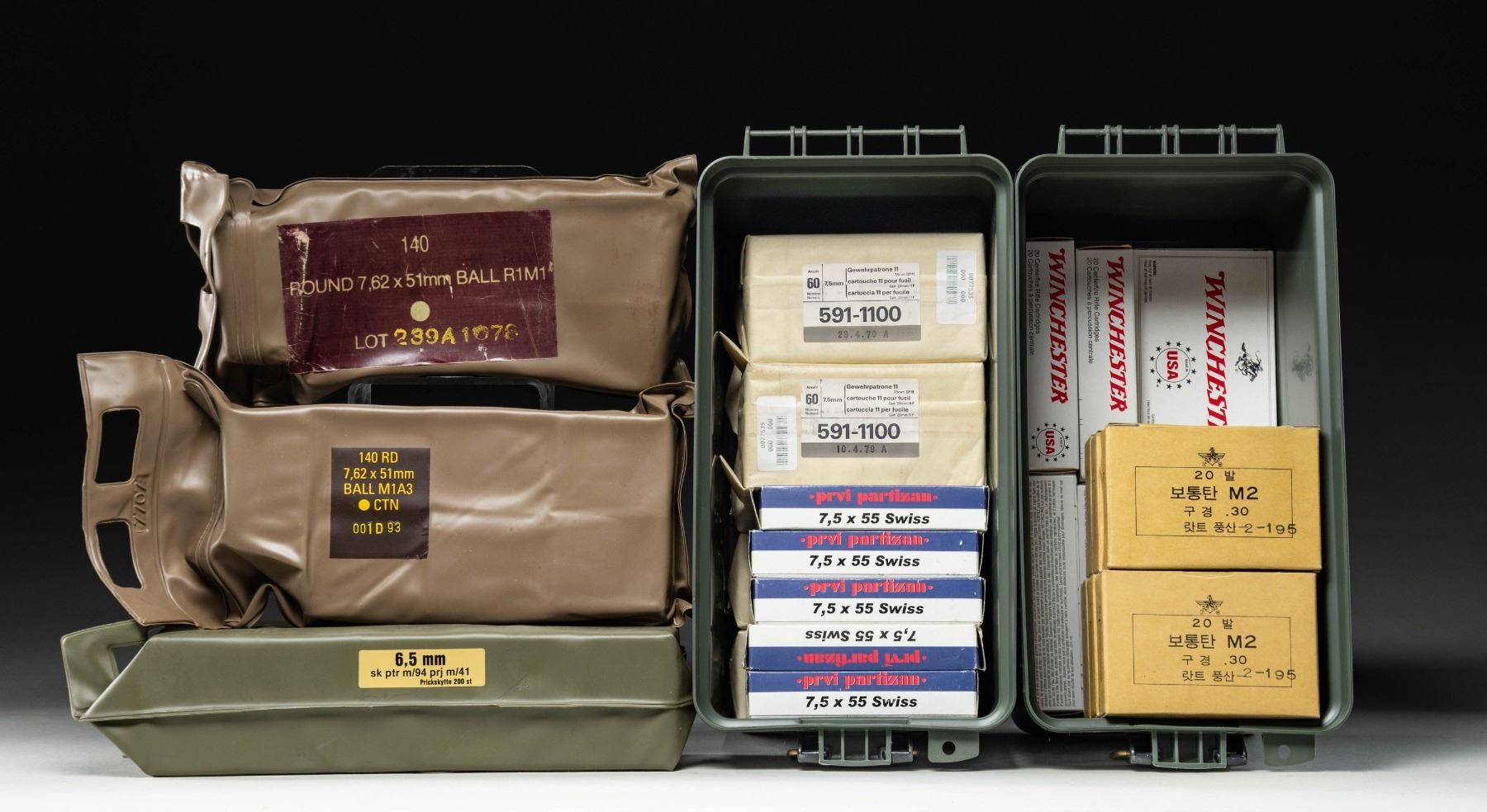 •30-06: 120 rds. Korean War era 152 gr. FMJ flat based ammo in original cardboard 20 rd. boxes. Stored in plastic Cabela's ammo can.