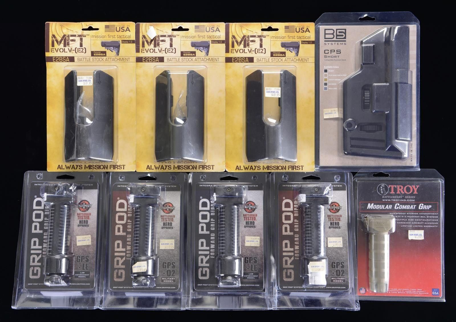Lot of parts including the following: 1) 2 Grip Pod Forward Grip Bipods. GPS LE. Law Enforcement Model. 2) 2 Grip Pod Forward Grip Bipods. GPS 02. Military Model. 3) 1 Troy Modular Combat Grip. Part #SGRI-TRG-A0FT-00. 4) 1 B5 Systems CPS Short Collapsible Precision Stock. Part #CPS-1400 308-BLACK. 5) 3 MFT EVOLV-(EZ) Battle Stock Attachments. CONDITION: All parts appear to be new, in factory retail packaging. PROVENANCE: The Collection of Gun Sport Ltd owned by Jon R. Thomas. (02-20847-3/JZ) $600-1,200.