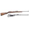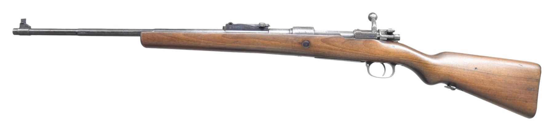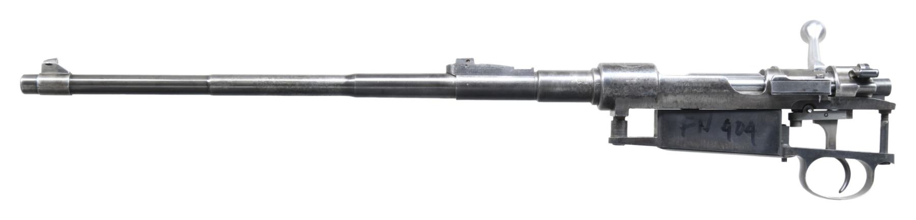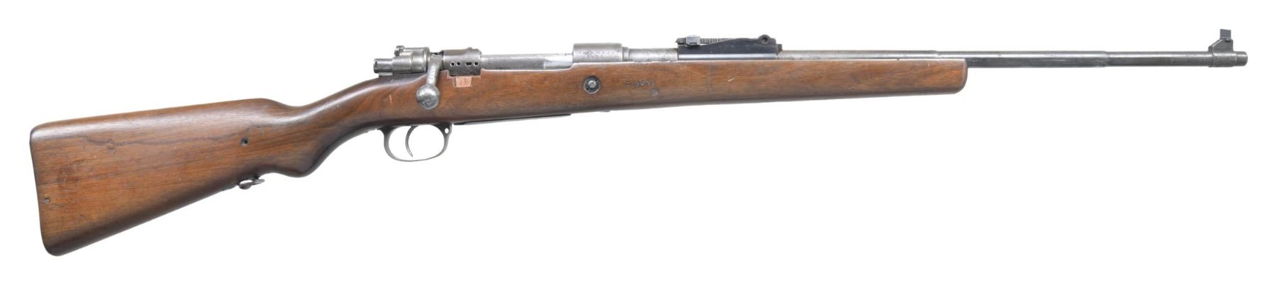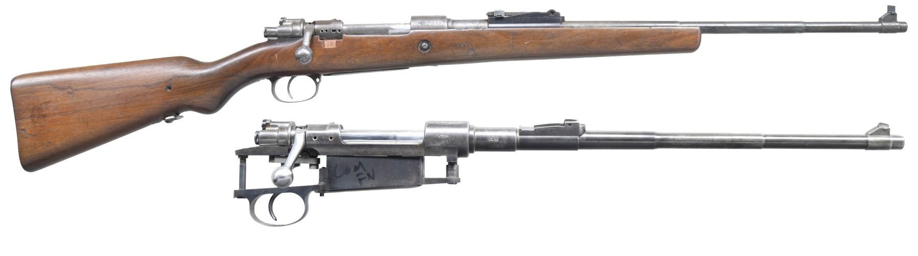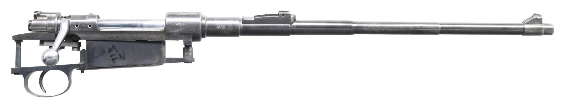 This lot consists of the following Columbian Mauser rifles both in Cal. 30-06: 1) S# 4186. Bbl. 17 1/2". FN 1950 Carbine Barreled Action. Blade front sight. No rear sight assembly present. Receiver drilled & tapped for aperture sight. Bbl. & receiver have matching numbers. Bbl. is loose & will require tightening. Turned down bolt assembly present that is marked with a Farsi number. Also present are a CZ marked trigger, mag assembly, trigger guard, bolt release & both action screws. CONDITION: metal shows scattered thinning to gray & light oxidation. Safety requires extra force to engage but action is otherwise functional when hand cycled. Good bore with some frosting & light pitting but strong rifling. (25-2567/MJC). 2) S# P05842. Bbl. 23 1/2". Aftermarket tall blade front sight. Tangent rear sight graduated to 2000m. Receiver is drilled & tapped for both aperture sight & optical sights . Mismatched numbers throughout. Right side of receiver is marked "R.FAMAGE/1952". Locking screws are missing. Cutdown walnut stock with cutout for aperture rear sight. CONDITION: stock shows a few circular dents, some dings & handling marks. Metal is mostly gray with scattered oxidation, handling marks & some light pitting. Action functions properly when hand cycled. Very good bore with scattered light pitting & frosting but strong rifling. (25-2568/MJC). BOTH MODERN. $300-500 for pair.