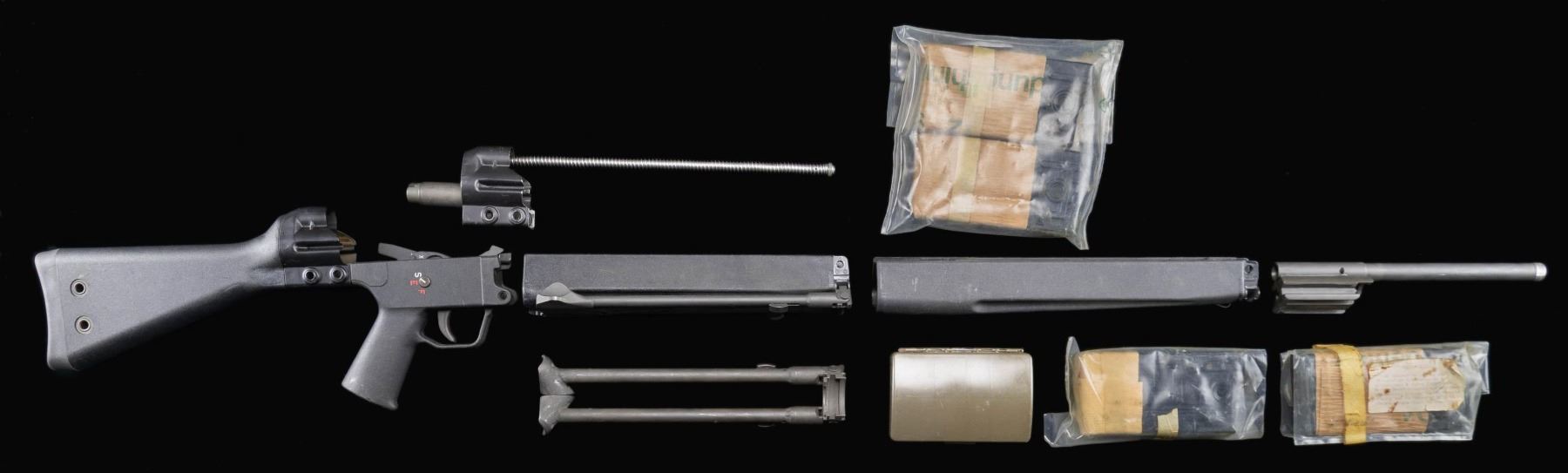 & FURNITURE. Lot of primarily Heckler & Koch HK91/G3 parts and furniture, including: 1) x1 HK91/G3 black polymer 3-position (S,E,F) trigger pack housing with full auto trigger pack group. 2) x1 HK91/G3 fixed black polymer buttstock (push pins absent). 3) x1 HK91/G3 buttstock socket with recoil spring guide rod assembly and stock buffer. 4) x1 HK91/G3 13 7/8" black polymer forearm with grooves for bipod. 5) x1 HK33 11 1/2" black polymer forearm mounted with a phosphate finished steel folding bipod. 6) x1 HK91/G3 full auto bolt carrier, marked "N-IB" on left. 7) x1 HK11/21E/23E phosphate finished steel folding bipod. 8) x4 virtually new HK91/G3 20-rd. mags. 3 mags. remain sealed in their original plastic packaging. 9) x1 German green synthetic cleaning kit. CONDITION: parts and furniture are all very good, showing some light wear and superficial handling marks. (02-25030/MLW). NON-GUN. $800-1,200.