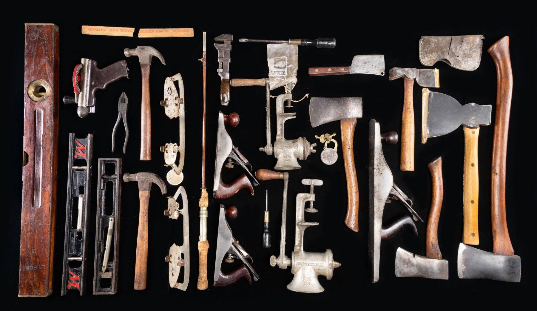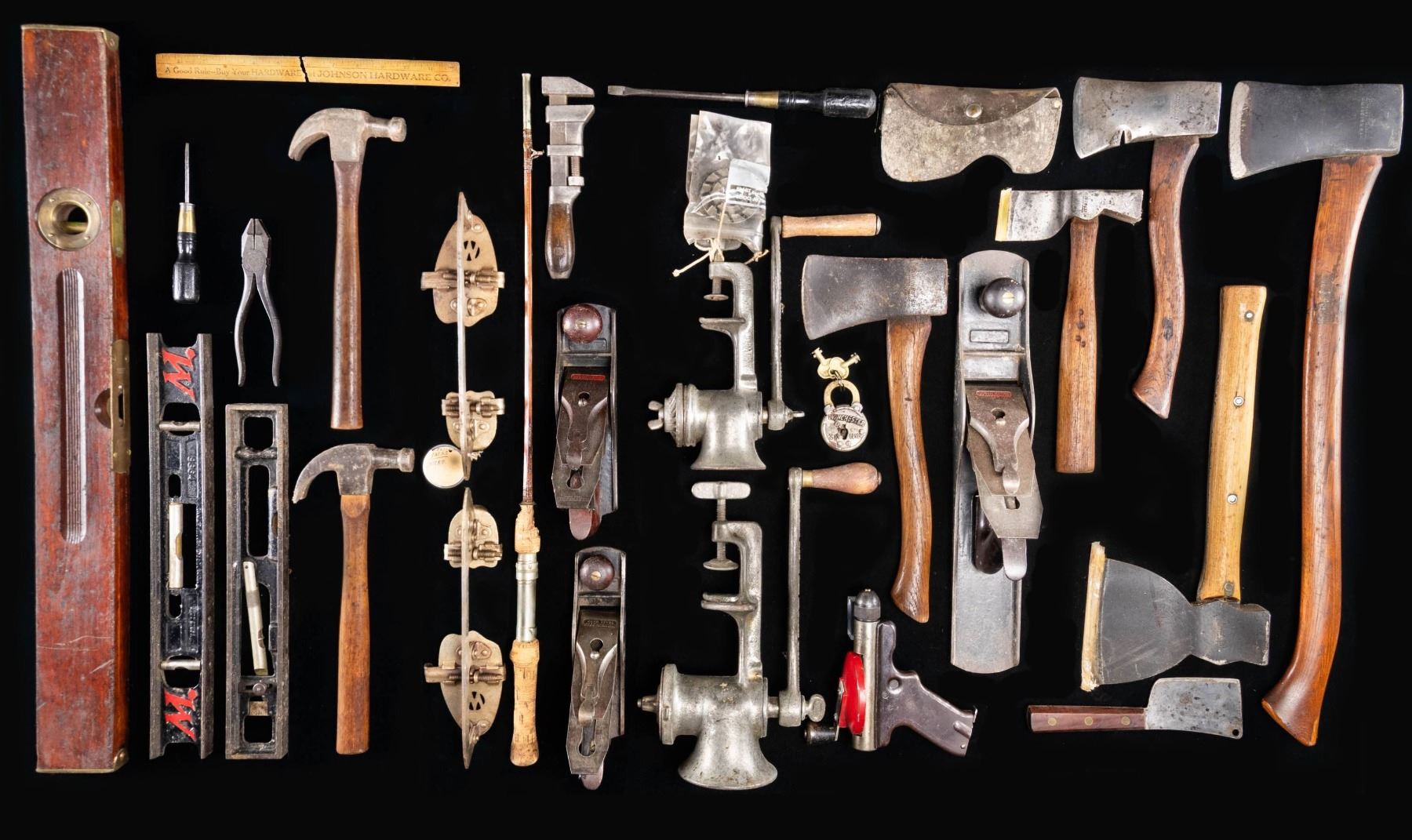 Large lot of primarily Winchester related ephemera consisting of: 1) x3 assorted Winchester hatchets. 2) x1 Winchester hatchet / mallet. 3) x1 Winchester wood splitting axe. 4) x2 Winchester claw hammers. 5) x3 assorted Winchester bubble levels (x1 wood, x2 steel). 6) x3 assorted size Winchester fore planes. 7) x2 Winchester (No. W12 & No. W13) meat grinders. 8) x1 Winchester pipe wrench. 9) x1 Winchester set of pliers. 10) x2 assorted size Winchester screwdrivers. 11) x1 small Winchester meat cleaver. 12) x1 Winchester Six Lever padlock with 2 brass keys. 13) x1 pair of Winchester ice skates. 14) x1 lower section of a Winchester fishing rod. 15) x1 Ruger hand drill. CONDITION: items exhibit varying degrees of wear, oxidation, and pitting, with all appearing to remain serviceable. Fishing rod shows losses to its cork handles. PROVENANCE: Estate of Russell Dickerman. (02-24459/MLW). NON-GUN. $300-600.