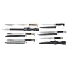 This lot consists of the following: 1) Alex Coppel German Dress Bayonet. One side of blade has scale logo & other Alex Coppel name & logo. Pommel & crossguard have leaf engraving. Bone grips with party eagle & symbol. Leather scabbard & frog present. CONDITION: leather shows scattered crazing, denting & flaking. Metal parts & handles very good overall. 2) CG Haenel Dress Bayonet. 1914 dated blade. Black rubber grip panels. Scabbard present. CONDITION: blade shows scattered edge wear & oxidation. Other metal parts of bayonet show overall oxidation & flaking. Grips show heavy checkering wear with some cracks. Scabbard shows overall flaking black paint with some oxidation. 3) Eickhorn Dress Bayonet. Blade has Eickhorn marking & logo. Nickel finish. Checkered black handles. Metal scabbard present. CONDITION: metal shows scattered moderate flaking & oxidation. Handles show checkering & handling wear. Scabbard shows scattered flaking with some oxidation. 4) WW1 German Dress Bayonet. Blade marked "GES GESCH". Grips have Saxon cipher. Pommel has eagle shape. Black scabbard. CONDITION: metal of bayonet & scabbard show scattered flaking with some oxidation. Grip panels show staining & light handling wear. 5) FW Holler Dress bayonet. Blade has FW Holler logo. Leather frog & steel scabbard present. CONDITION: metal parts of bayonet show light flaking & oxidation. Leather frog shows crazing & flaking. Scabbard shows light flaking, dings & oxidation. 6) WK&G Dress Bayonet. Sawback blade WK&G trademark. Bone grips panels. Scabbard present. CONDITION: metal parts of bayonet show scattered flaking & oxidation. Grips show light wear. Scabbard shows scattered flaking & oxidation. (02-25778/MJC). $700-1,000 for lot.