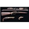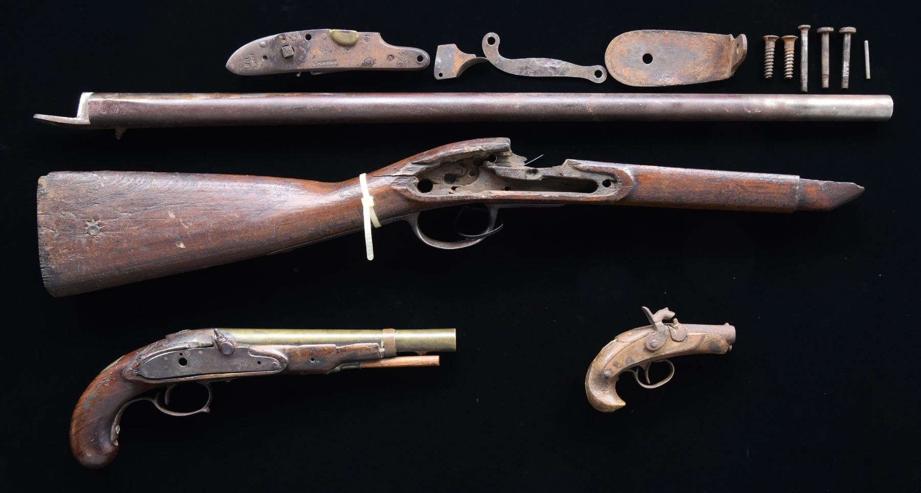 This lot consists of the following antique parts guns: 1) W. Ketland Percussion pistol. Cal. 58. NSN. Bbl. 8" brass smoothbore. Bbl. has London marking & British proofs. Lock marked "W. KETLAND". Pistol is missing several parts including hammer, most of band & several screws causing action to be loose from stock. Hardwood stock with brass thimble & hardwood ramrod. CONDITION: stock shows several large cracks & chips. Bbl. is a dull yellow patina with dings & oxidation. Other parts are a dull gray patina with oxidation & pitting. Pitted bore. 2) Derringer Style Pistol. Cal. about 44. NSN. Bbl. 2 1/2". Blade front sight. Unmarked Peanut Derringer style pistol. Hardwood stock that is missing its shield on top of wrist. CONDITION: stock shows several cracks some with brass repairs & scattered flaking. Metal is a dull gray oxidized patina. Hammer & action not functioning. Oxidized bore. 3) Cutdown 1816 Pomeroy Musket Parts Gun. Cal. 69. NSN. Bbl. 26 1/2" cut down. No sights present & bbl. appears bored out possibly for fowling. The following parts are present: Bare Pomeroy lock, cut down stock, trigger guard, buttplate & a few screws. No other parts present. CONDITION: stock has several carvings, cracks, dings, chips & heavy handling wear. Metal is mostly a gray oxidized patina with some cleaned areas & pitting. (01-26040/MJC) $100-300 for lot.