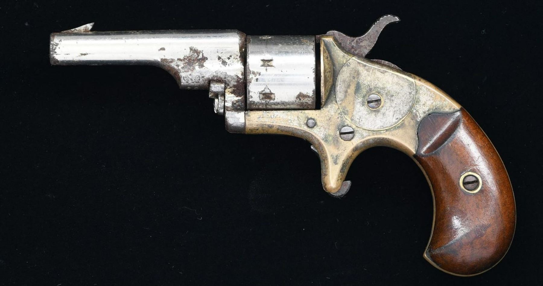 This lot consists of three pocket revolvers. 1. COLT OPEN TOP SA REVOLVER. Cal. 22 RF. S# 75655. Bbl. 2 3/4". Blade front sight. Nickel finish cyl. & bbl. Brass frame. Rear right part of frame is chipped off. Cyl. will not turn when hammer is cocked & will require attention to fix. Hardwood grips. CONDITION: grips show a light chip & scattered handling wear. Nickel parts show notable flaking & oxidation. Brass is a dull yellow patina w/ scattered oxidation & scratches. Dark pitted bore. (01-24540/MJC). ANTIQUE. 2. CHAMPION SPUR TRIGGER SA REVOLVER. Cal 22 RF. NSN. Bbl. 2 1/2". Round blade front sight. Nickel finish. Action not working properly & may require attention to fix. Checkered rubber grips w/ American shield & George Washington logo. CONDITION: grips show some dings & handling wear. Metal shows scattered light pitting, flaking, dings & oxidation. Dark pitted bore. (01-24541/MJC). ANTIQUE. 3. KOLB BABY HAMMERLESS REVOLVER. Cal. 22 RF. NSN. Bbl. 1 1/4". Folding trigger revolver produced 1910-16. Nickel finish. Action not working properly & may require attention. Checkered black grips w/ K logo. CONDITON: grips show some dings & scratches. Metal shows overall flaking w/ oxidation & some pitting. Dark oxidized bore. (23-5097/MJC). CURIO. $175-300 for lot.