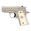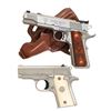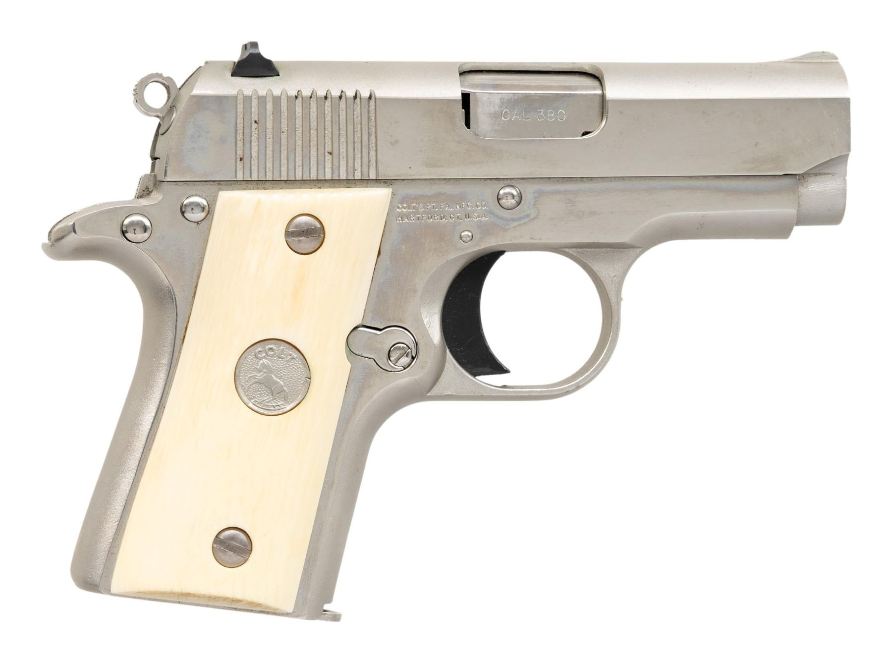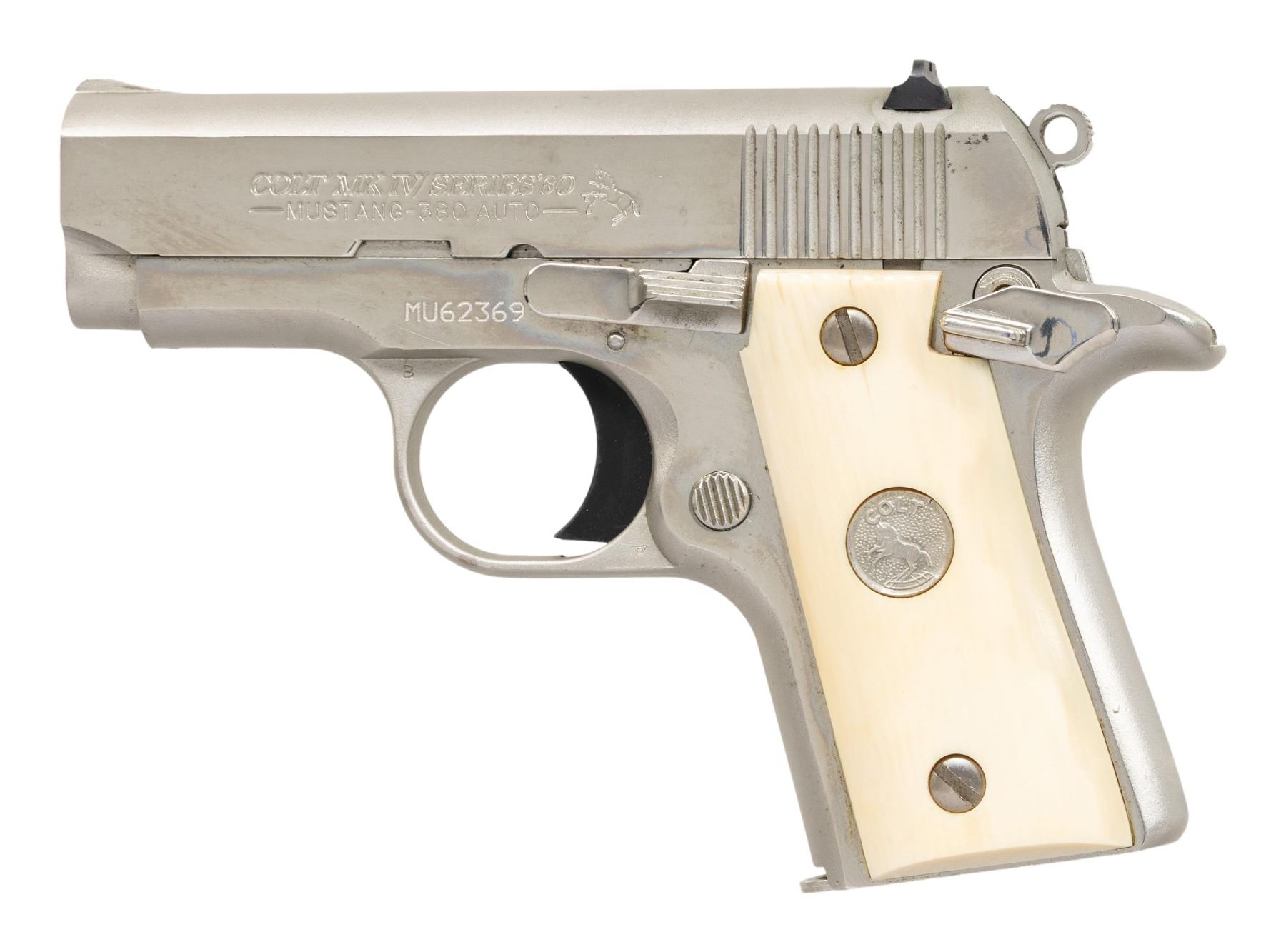 2) Colt MK IV Series 80 Mustang Pistol. Cal. 380 ACP. S# MU62369. Bbl. 2 3/4". Ramped blade front sight. Square notch rear sight. Nickel finish with blued trigger& rear sight. White colored grips with silver Rampant Colt medallions. MAGS: 1-6 rd. CONDITION: grips show light handling wear. Metal shows a light slide stop reassembly scratch, sparse scattered light oxidation & some handling marks. Action functions properly when hand cycled. Very good plus bore. (25-4656/MJC). BOTH MODERN. $800-1,300.