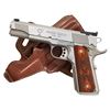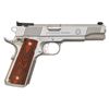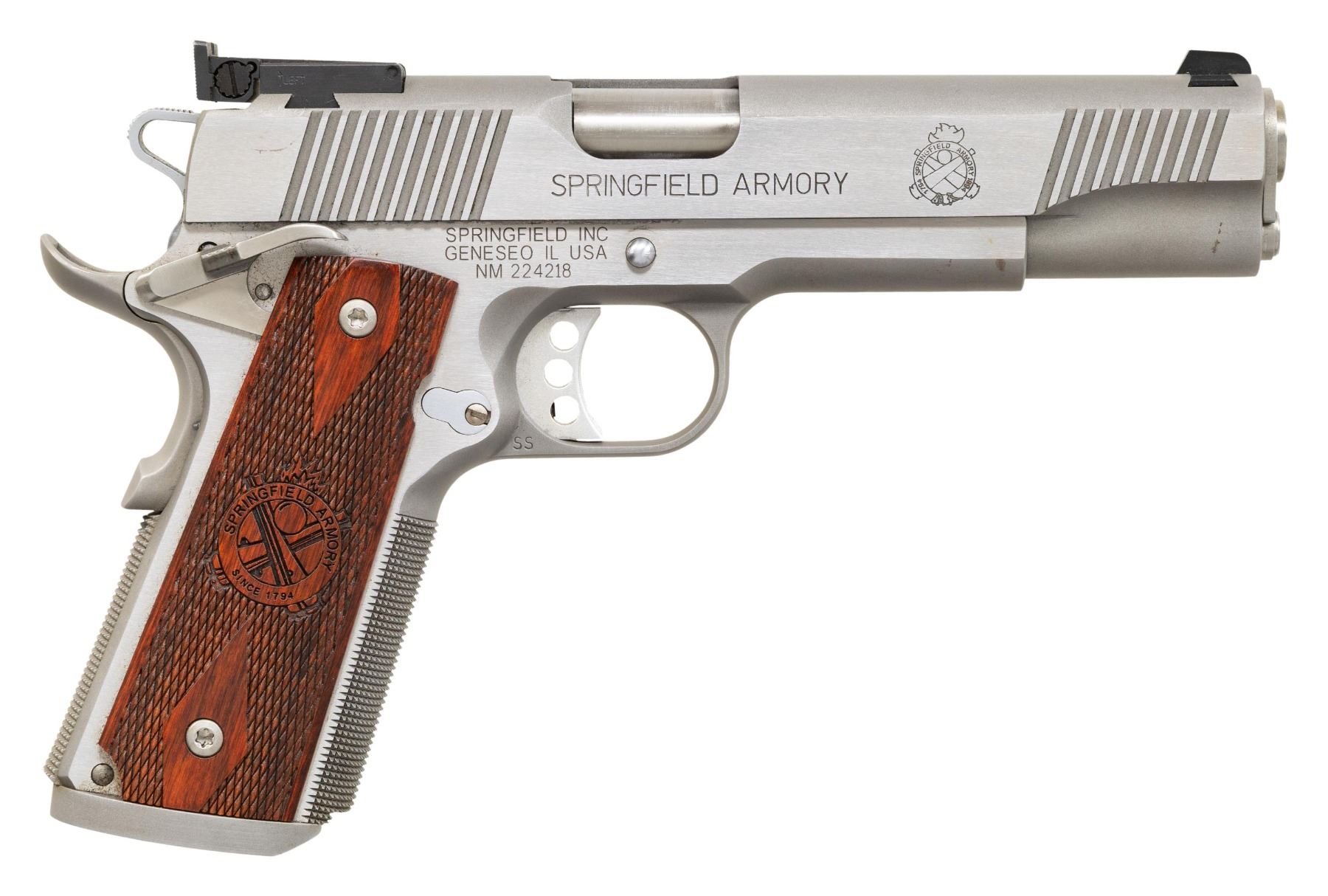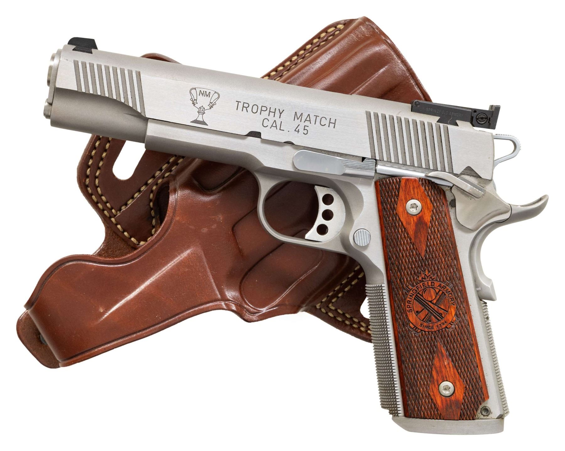 1) Springfield Armory Trophy Match 1911 Pistol. Cal. 45 ACP. S# NM224218. Bbl. 5". Blade front sight. Adjustable Springfield Bo-Mar style rear sight. Stippled grip straps. Enlarged mag well. Extended ambi manual safety. Extended beavertail grip safety. Front & rear slide serrations. Checkered hardwood grips with Springfield Armory logo. Stainless finish. MAGS: none present. UNATTACHED ACCESSORIES: right handed leather Galco holster. CONDITION: grips show light handling wear. Metal shows some magwell wear, light slide stop reassembly scratch on frame, a couple spots of light oxidation, some handling marks & edge wear. Action functions properly when hand cycled. Very good plus bright bore with strong rifling. (25-4644/MJC).