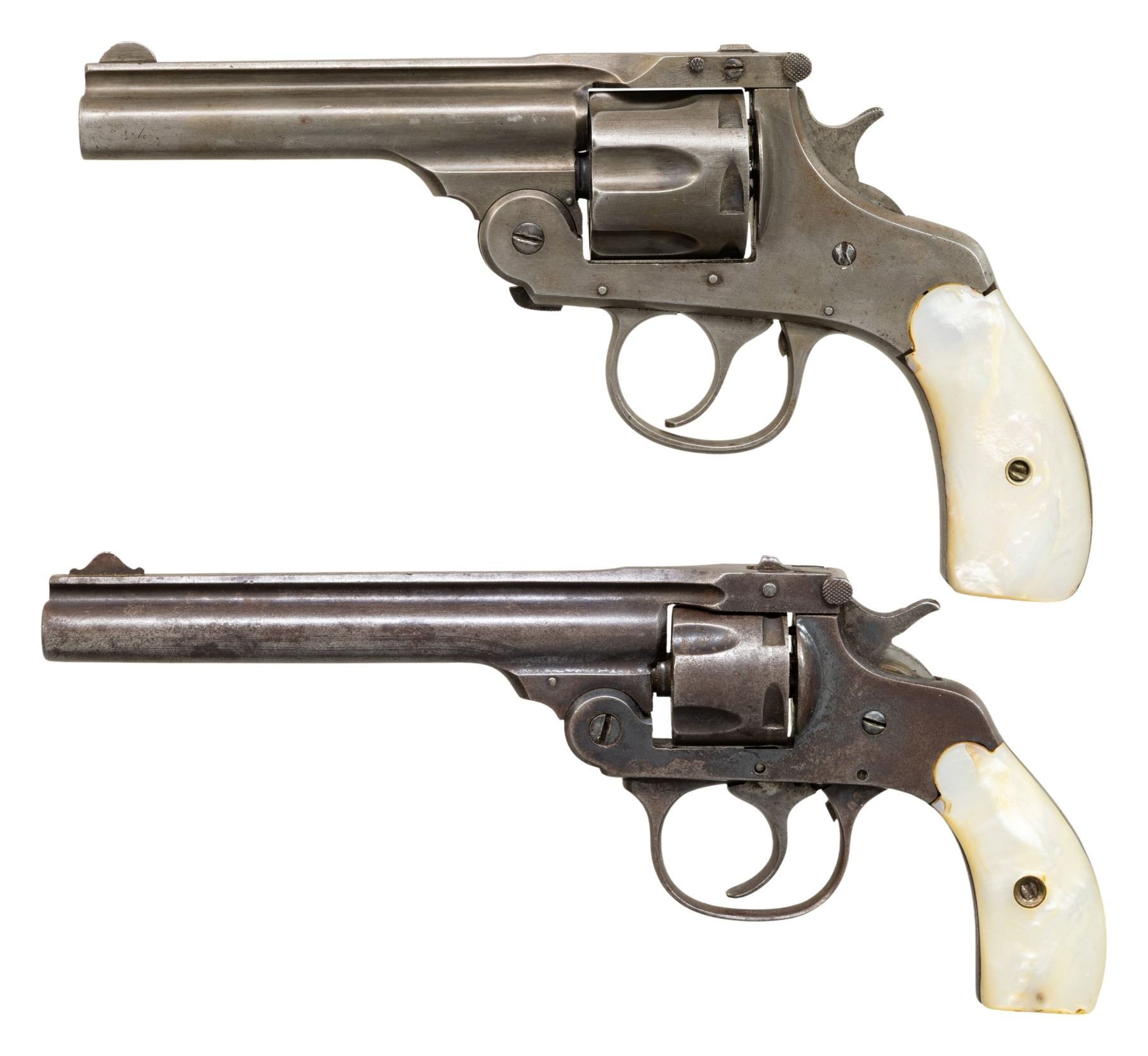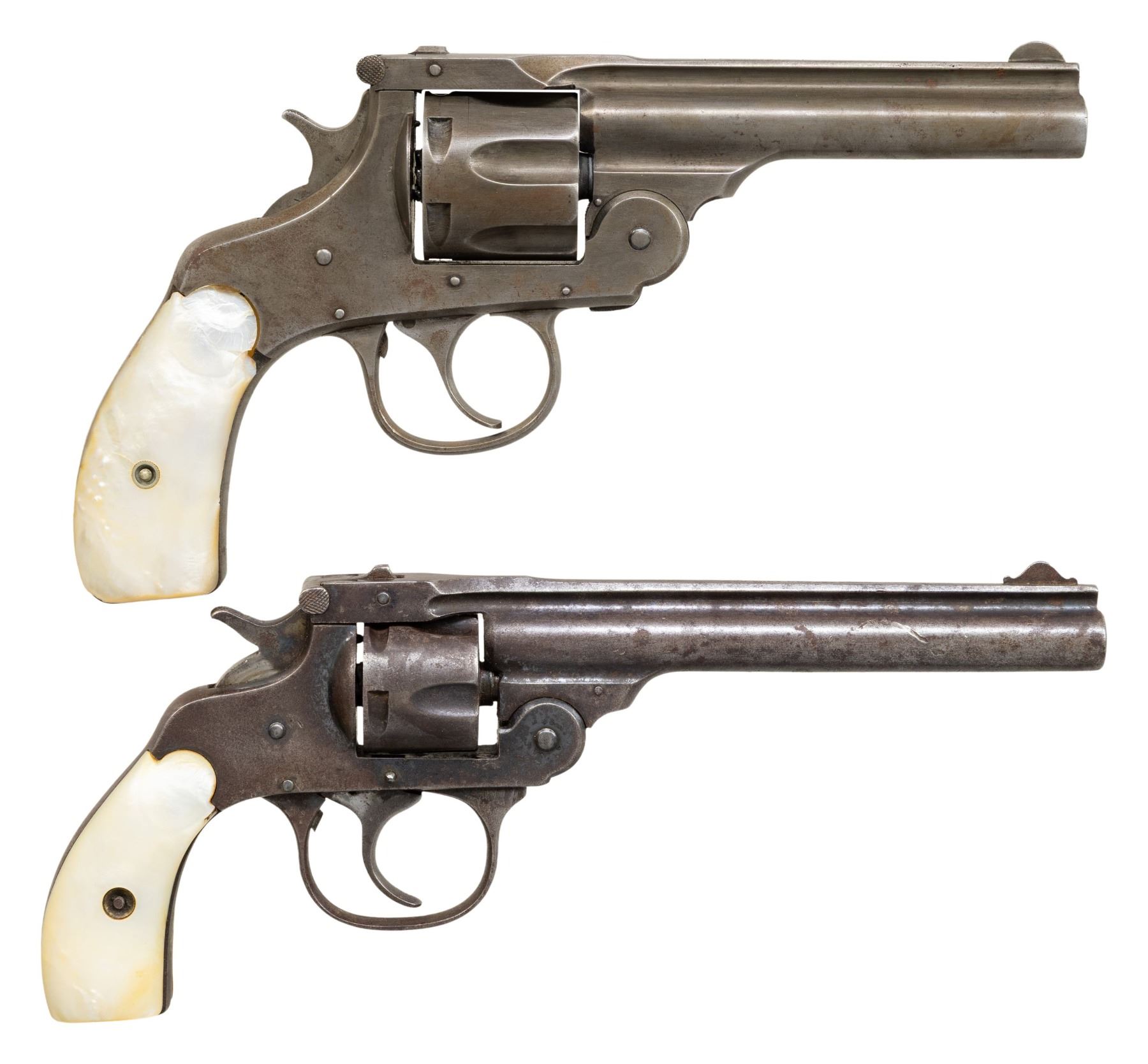 2) Eastern Arms 32 DA Revolver. S# 10224. Bbl. 5". Blade front sight. Fixed rear sight. Five shot-cyl. Pearl style grips. CONDITION: grips show some light chipping, dings, scratches & handling marks. Metal is an overall gray patina with traces of bluing & case colors with overall oxidation, some pitting, handling marks & dings. A couple frame pins are drifting out & will require attention. Extractor & SA mode not functioning & will require attention to fix. Poor oxidized & pitted bore. (25-4304/MJC). BOTH CURIO. $75-150 for pair.