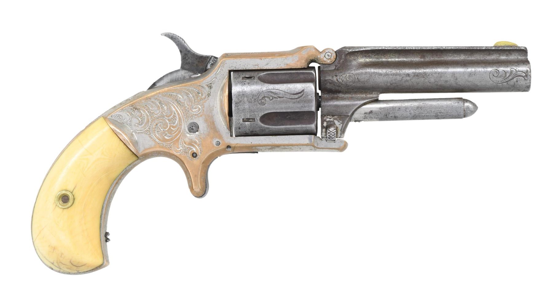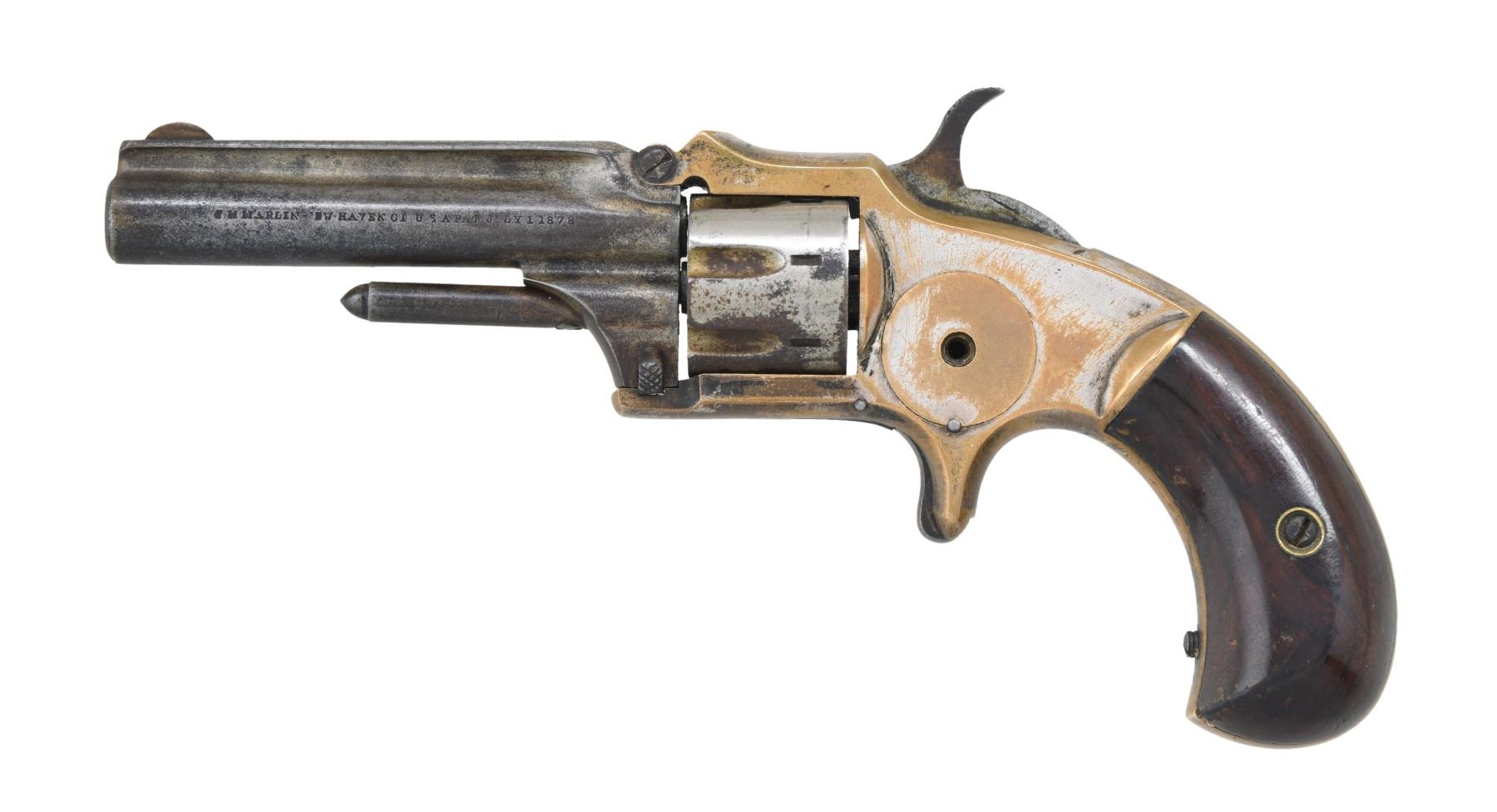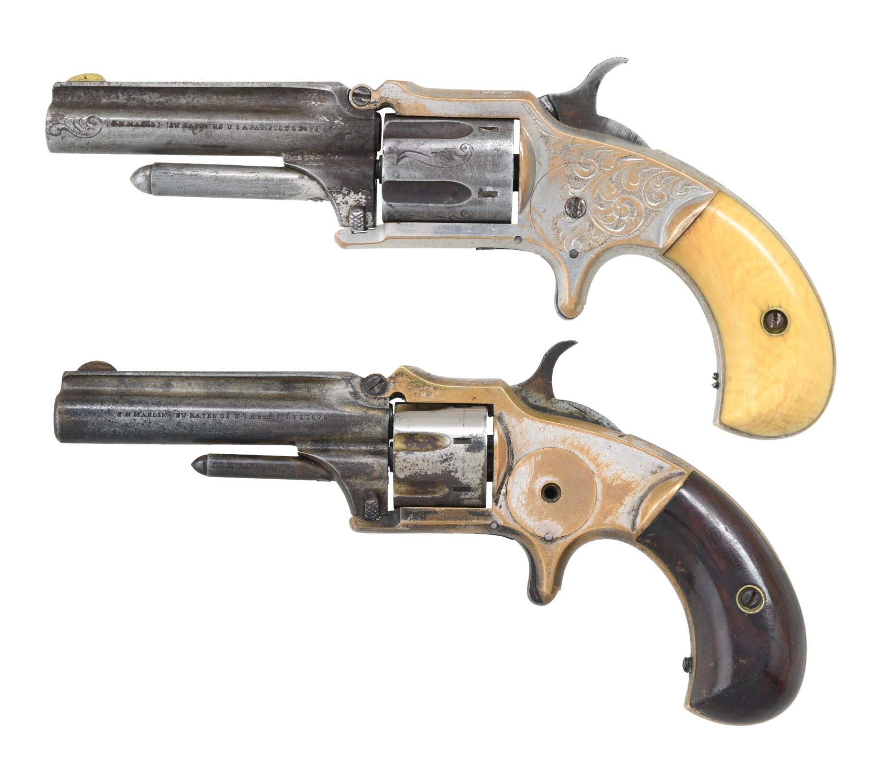 This lot consists of the following Marlin spur trigger revolvers: 1) STANDARD 1875 REVOLVER. Cal. 32 RF. S# 3729 (UNDER GRIPS). Bbl. 3". Round blade front sight. Nickel finish. Brass frame with vine engraving. Antique ivory grips. CONDITION: grips show some scratches & handling marks. Bbl., cyl. & ejector rod assemblies are silvery gray color with scattered oxidation & flaking. Frame shows scattered flaking nickel giving way to brass with some dings & oxidation. Bbl. assembly is loose & hammer will not cock. Pitted poor bore. (01-26244/MJC). 2) 1873 XX STANDARD REVOLVER. Cal. 22 RF. S# 4379 (Under grips). Bbl. 3". Round blade front sight. Brass frame. One of the frame screws is missing. Rosewood grips. CONDITION: grips have thickly added varnish with scattered flaking, some handling marks & light chips. Bbl. & ejector rod assemblies are a dull gray patina with oxidation staining. Cyl. shows overall flaking silver finish with oxidation & some pitting. Frame is mostly a yellow patina with traces of silver finish & scattered oxidation. Action functions when hand cycled. Worn bore with scattered pitting & oxidation. (01-26245/MJC). BOTH ANTIQUE. $400-700 for pair.