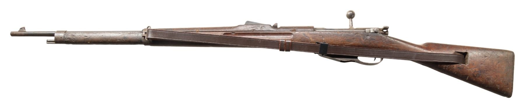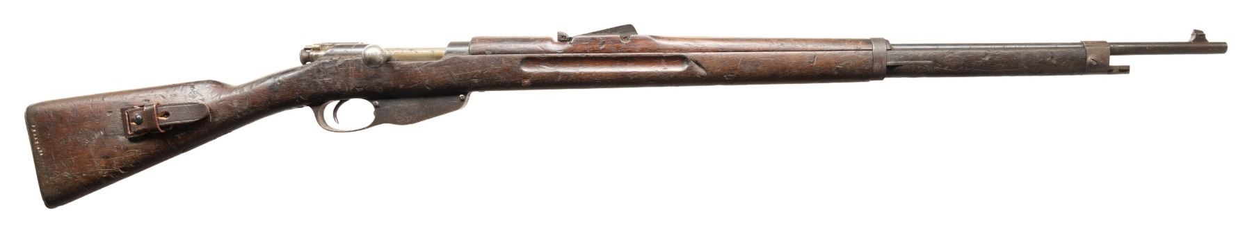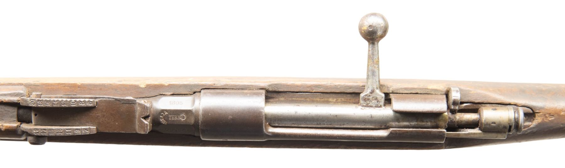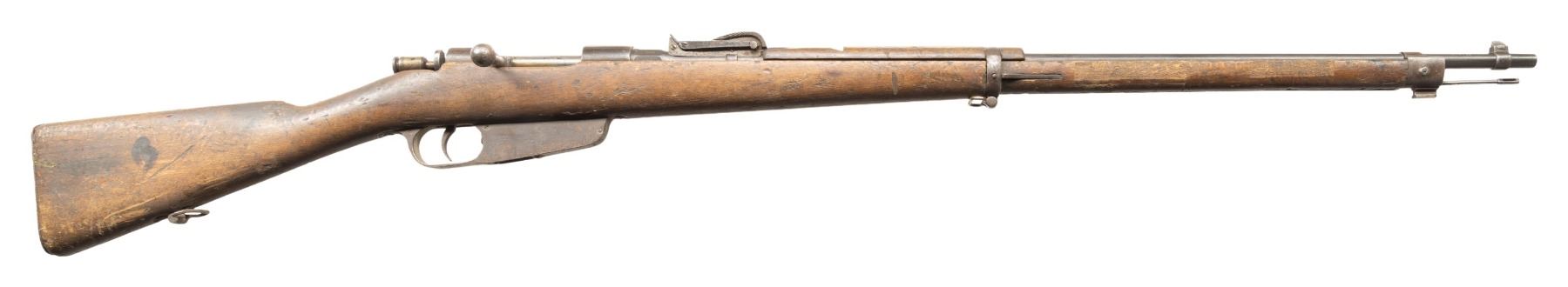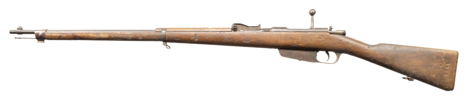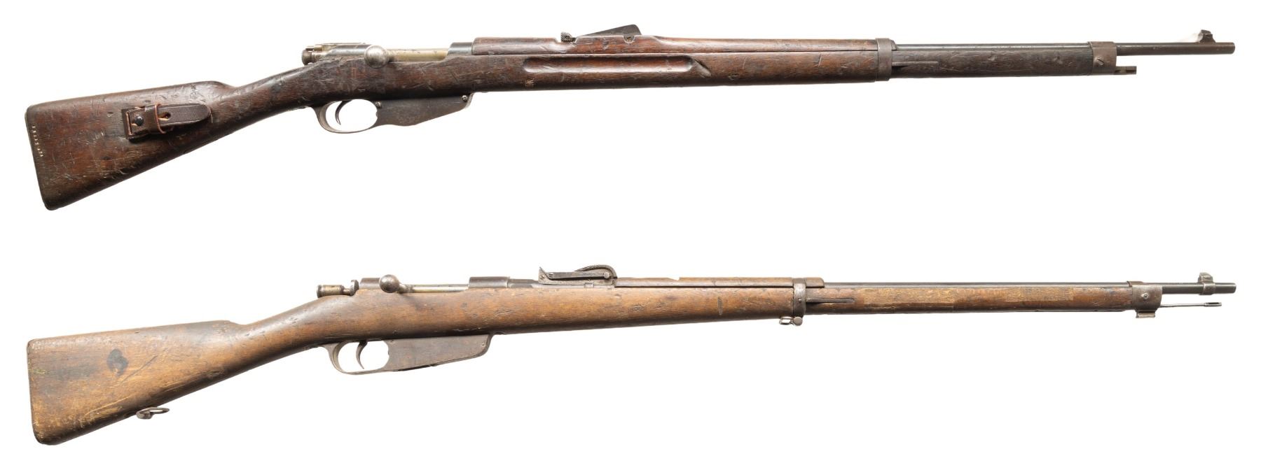 2) Early Terni 1891 Carcano Bolt Action Rifle. Cal. 6.5 Carcano. S# QH3088. Bbl. 30 3/4". Blade front sight. Tangent rear sight graduated to 2000m. Stock number is faint but does not appear to match bbl. number. Bolt is also mismatched. 1895 dated bbl. with Terni & "TUBATO" rifling rework marking. Arsenal blue finish. Hardwood stock set with bottom mounted sling swivels. Replacement cleaning rod present. Left side of stock has carved "X". CONDITION: stock set shows some adhesive residue on top of wrist, a few gouges, chips, a tight crack ahead of buttplate, scattered dings, finish loss, handling marks & scratches. Metal shows strong traces of arsenal blue with scattered oxidation, fading to gray, edge wear, handling marks, & light pitting. Action cycles properly when hand cycled but safety may require attention to fix. Bore shows light pitting but strong rifling. PROVENANCE: From the PMRB Collection.