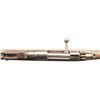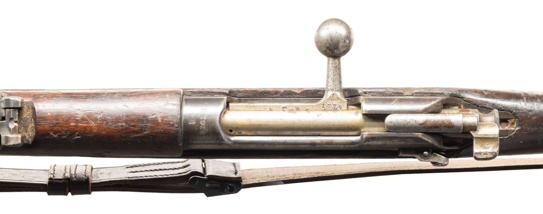 1) Dutch 1895 Mannlicher Bolt Action Rifle. Cal. 6.5 Dutch. S# 2361H. Bbl. 31 1/2". Blade front sight. Tangent rear sight graduated to 200m. Bolt parts, front band & bottom metal are all matching to receiver. Other visible parts are mismatched. 1897 dated & Steyr made Dutch M95 Mannlicher. Arsenal blue finish. Hardwood stock set that appears WW2 German modified with K98k style sling arrangement, plugged bottom slot & repro sling. Right side of butt has strong 1897 dated cartouche & faint added white numbers at rear. No cleaning rod present. CONDITION: stock set has a darkened appearance with a 3" crack behind upper tang, several gouges, some chipping in ramrod channel, scattered dings, abrasions, scratches & handling wear. Metal is turning gray with oxidation more heavy on front end, scattered edge wear & handling marks. Action functions properly when hand cycled. Bore has strong rifling but scattered pitting & oxidation. (01-28426/MJC).