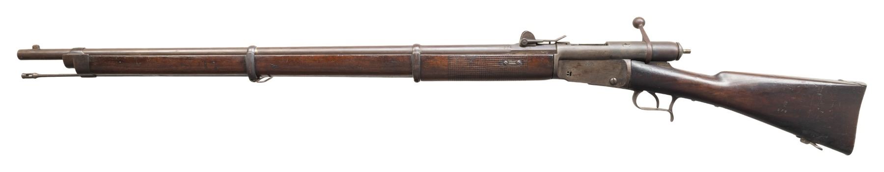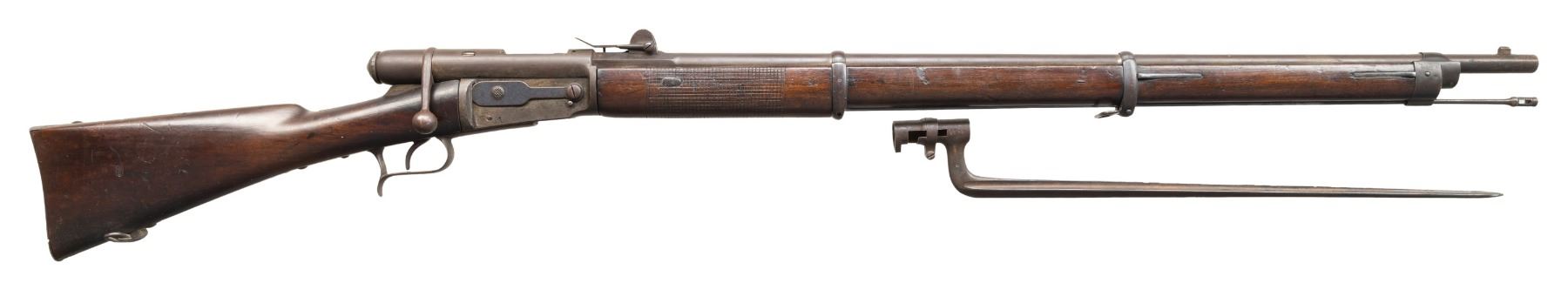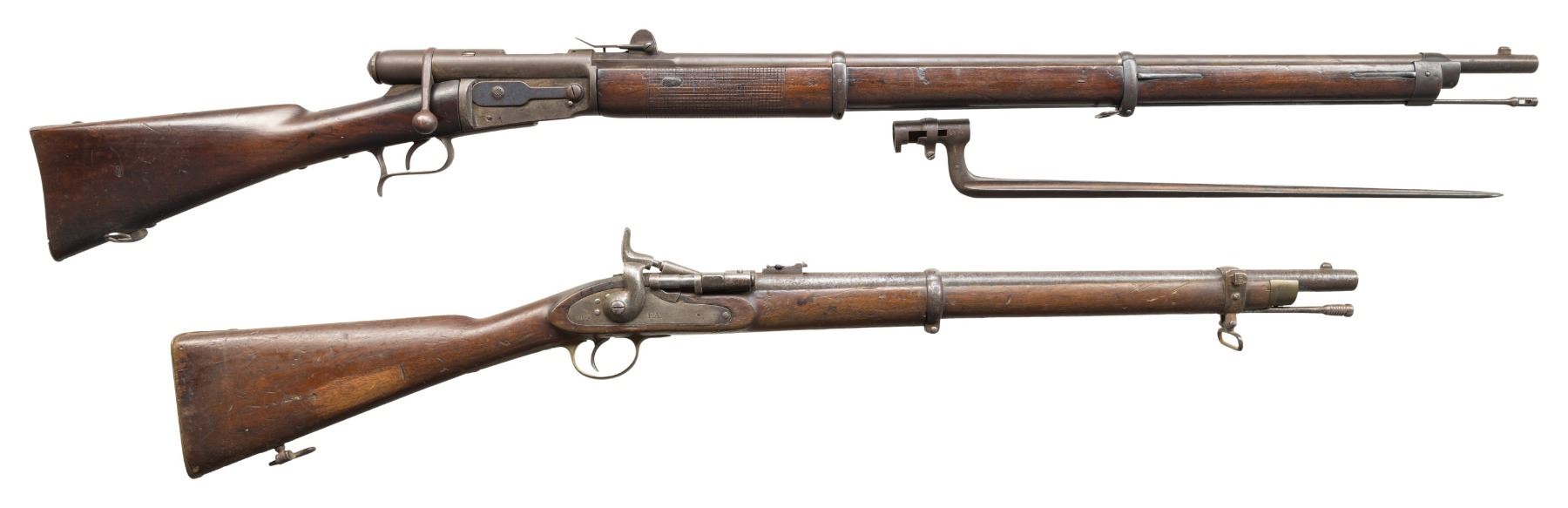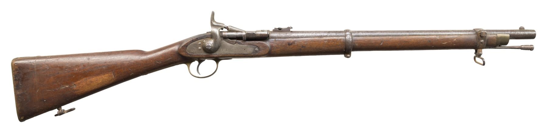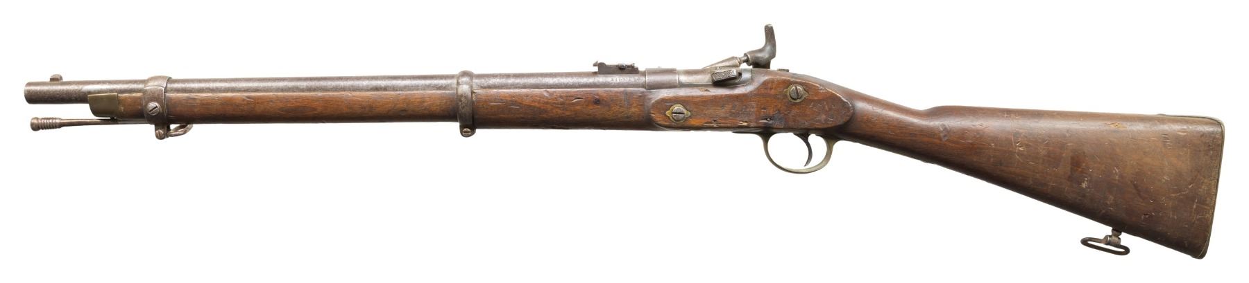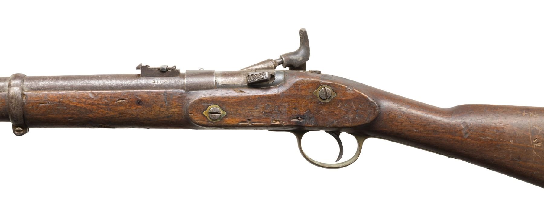 2) Portuguese Snider Artillery Carbine. Cal. 577 Snider. S# A107. Bbl. 21 1/2". Blade front sight. Ladder rear sight graduated to 600yds. Lock has 1877 date & "FA" Portuguese marking. Top of breechblock has Snider's patent marking. Hardwood stock with bottom mounted sling swivels. Brass hardware. Left side of stock has "F.A./1887" marking. Ramrod present. CONDITION: stock shows scattered finish loss with a notable patch on right side of butt, a few notable gouges, scattered dings, handling marks & scratches. Brass parts are a dull yellow color with scattered dings & oxidation. Balance of metal is a dull gray patina with old oxidation throughout. Action functions properly when hand cycled. Very good bore with strong rifling & some light oxidation.