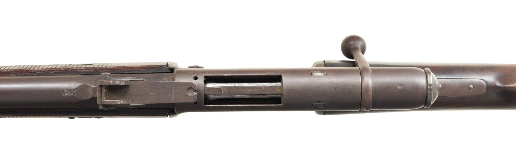 1) Keller Swiss Vetterli 1869 Bolt Action Rifle. Cal. 10.4 Swiss. S# 8325. Bbl. 33". Blade front sight. Tangent rear sight graduated to 1000m. Butt stock is numbered "375" possibly a factory error but other visible parts have matching numbers. Early & scarce Keller made 1869 Vetterli rifle with only 9700 made by that maker. Arsenal blue finish. Hardwood stock set with bottom mounted sling swivels & checked forend. Ramrod present. UNATTACHED ACCESSORIES: Swiss 1867 socket bayonet that is an overall gray patina with oxidation. CONDITION: stock set has arsenal type finish with some chipping, scattered dings, hand[ling marks & wear. Metal is mostly faded to gray more notable on action with scattered oxidation, handling marks, traces of bluing more heavy on bbl. & loading gate. Action may need attention as elevator will get stuck. Bore shows some oxidation & light pitting but strong rifling. (01-28395/MJC).