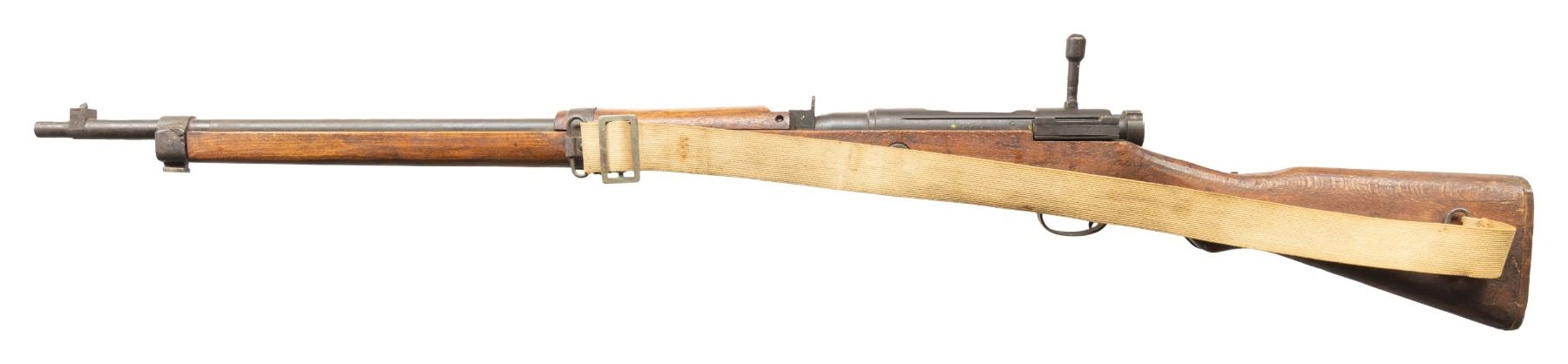 1) Nagoya Last Ditch T99 Arisaka Bolt Action Rifle. Cal. 7.7 Jap. S# 7740. Bbl. 25 1/2". Blade front sight without ears. Fixed aperture rear sight. All matching numbers including firing pin. Left side of receiver has 11th series & Nagoya markings. Receiver top has ground mum. Some markings have added yellow highlight. Blued finish. Asian hardwood stock set with separate forend, left side sling swivels & canvas sling marked "ED WILSON" in black ink. CONDITION: stock set shows some light chipping, scattered dings, handling marks, finish loss & scratches. Metal shows overall fading to gray with strong traces of original blue, some edge wear, a few light dings, screw slot wear & scattered oxidation. Action functions properly when hand cycled. Very good plus bright bore. (25-5954/MJC).