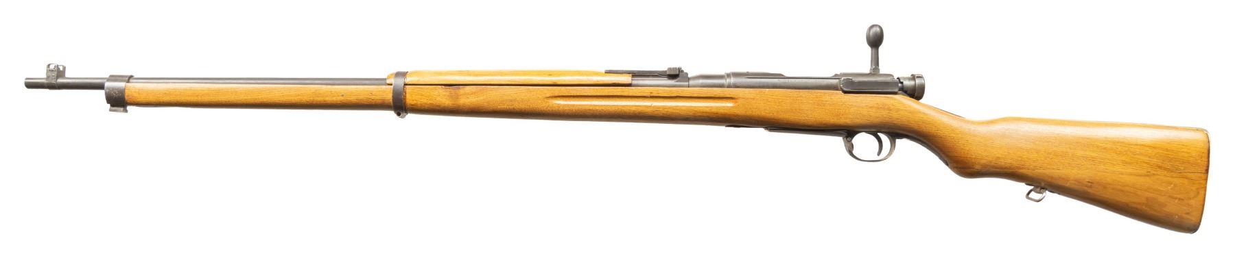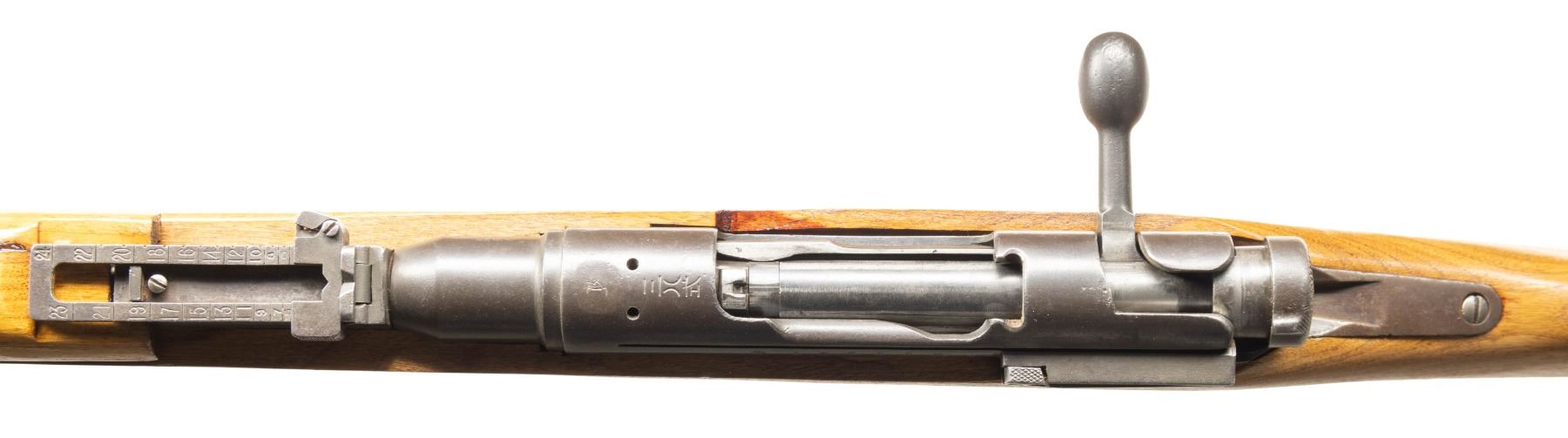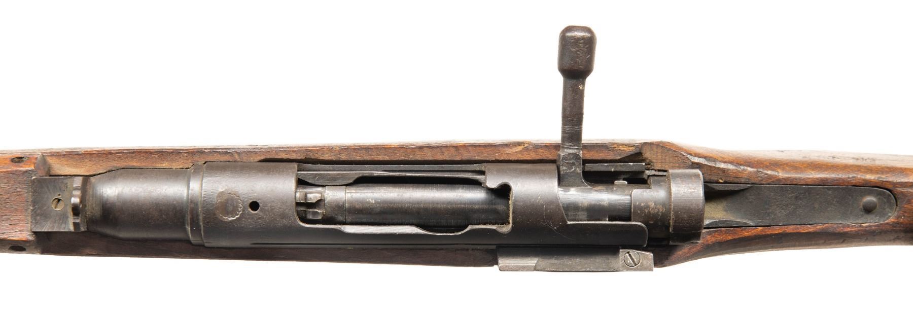 2) Chinese Converted T38 Arisaka Bolt Action Rifle. Cal. 7.62x39. S# 50655. Bbl. 31 1/2" with Navy Arms import marking at rear. Blade front sight with protective ears. Ladder rear graduated to 2400m. Parts have mixed numbers. Rifle appears to be Chinese converted to 7.62x39 with shortened follower. Receiver ring has ground mum with added Chinese character. Left side of receiver has Kokura & 24th series marking. Metal has a matte gray appearance. Chinese replacement hardwood stock set with two-piece butt & rear sling swivel. Action screws, cleaning rod & front sling swivel all missing. CONDITION: stock set has a refinish appearance with a loose handguard fit, a couple light chips, some dings, handling marks & improper band removal wear. Metal has a matte gray appearance with a notable area of pitting on lower tang, scattered blued over pitting, light oxidation, handling marks & edge wear. Trigger & safety not functioning & will require attention to fix. Worn dark poor pitted bore. PROVENANCE: From the PMRB Collection. (25-5984/MJC). BOTH CURIO. $400-700 for lot.