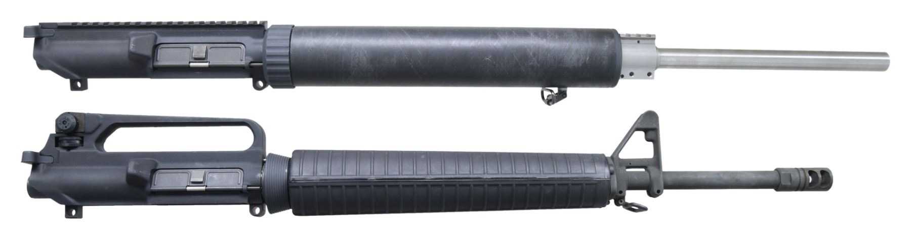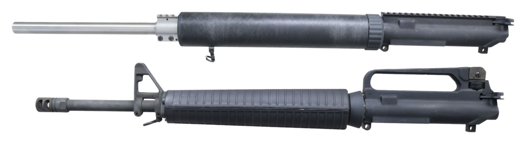 This lot consists of the following 7.62 NATO Armalite AR-10 uppers: 1) A2 style upper. 20" bbl with muzzle. M16A2 style sights & fixed carry handle. Windage adjustment knob marked "ARMALITE". No forward assist. Bolt carrier group, charging handle, ejection cover, handguards & front sling swivels present. CONDITION: metal shows scattered scuffing & handling wear. Bright near excellent bore. 2) Stainless bbl. upper. Bbl. 24" stainless heavy profile. Upper top & gas block have picatinny rails for sight mounting. No sights present. Round free float handguard,, ejection port cover, bolt carrier group, charging handle & front sling swivel all present. CONDITION: upper shows some scattered handling & edge wear. Bright near excellent bore. (02-24616/MJC). $250-500 for pair.