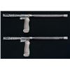 Lot consists of two AUG machine gun bbls. Bbls. are virtually unmarked, save for the cal. designation at the breech, the S#s, as well as a few diminutive proof marks overall. Metal components exhibit a black enamel-type finish with folding OD polymer vertical foregrips. Bbls. measure 16 1/8" (without flash hider) and feature deep bbl. grooves, with bird cage flash hiders. CONDITION: bbls. retain the majority of their original finish, exhibiting some wear, flaking, and scattered marks from handling and storage overall. Mirror bores, exhibiting well-defined rifling throughout. Polymer foregrips are very good overall. PROVENANCE: from the lifelong collection of Terrance McCarty. (02-21800-5/MLW). $600-1,000.
