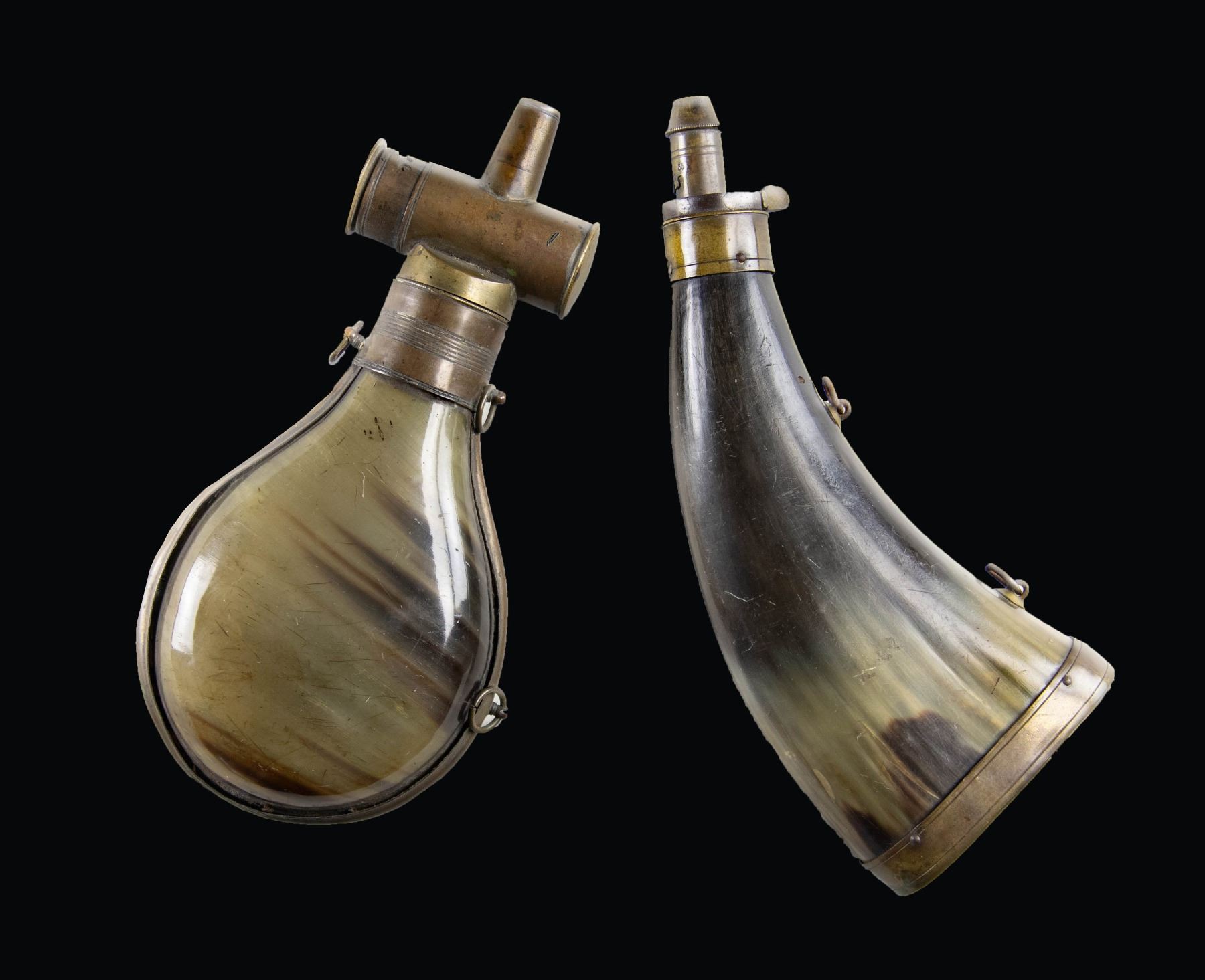 2) British Horn Powder Flask. Appears to be mid 19th century in origin. Curved horn body with brass hardware. Overall length 8" from tip to bottom. CONDITION; body shows some dings, flaking & wear. Brass parts show overall fading to a dull yellow with scattered tarnishing. (02-25350/MJC). $500-700 for pair.