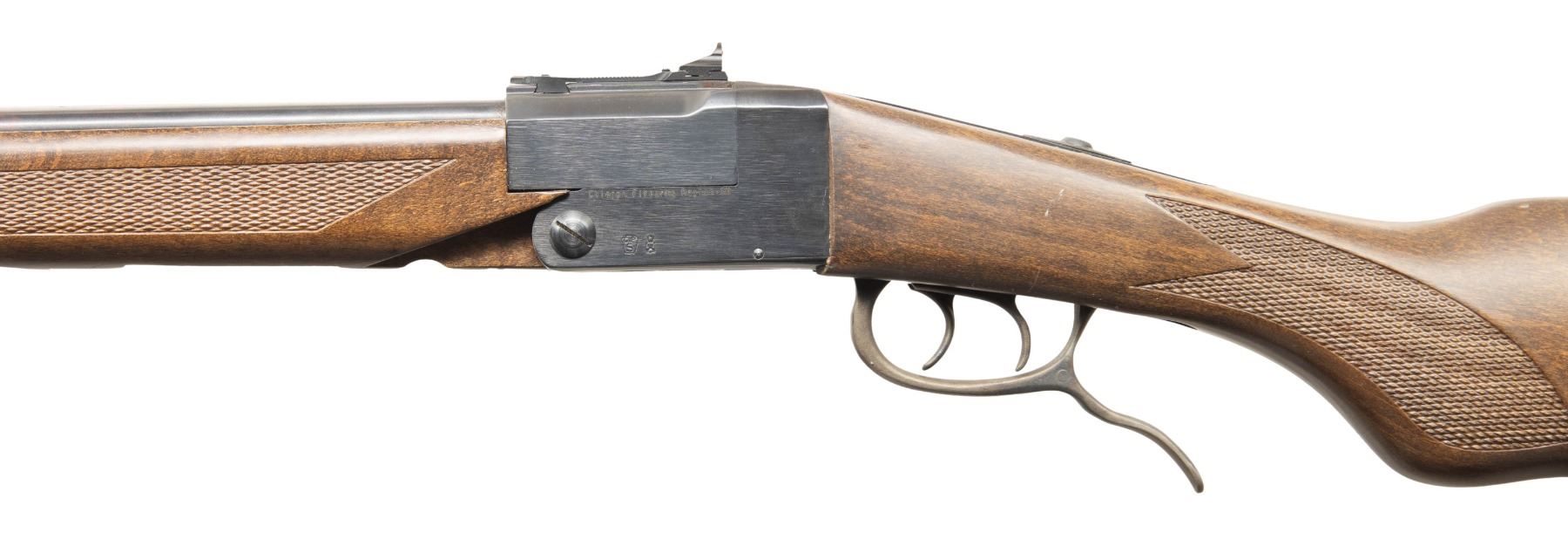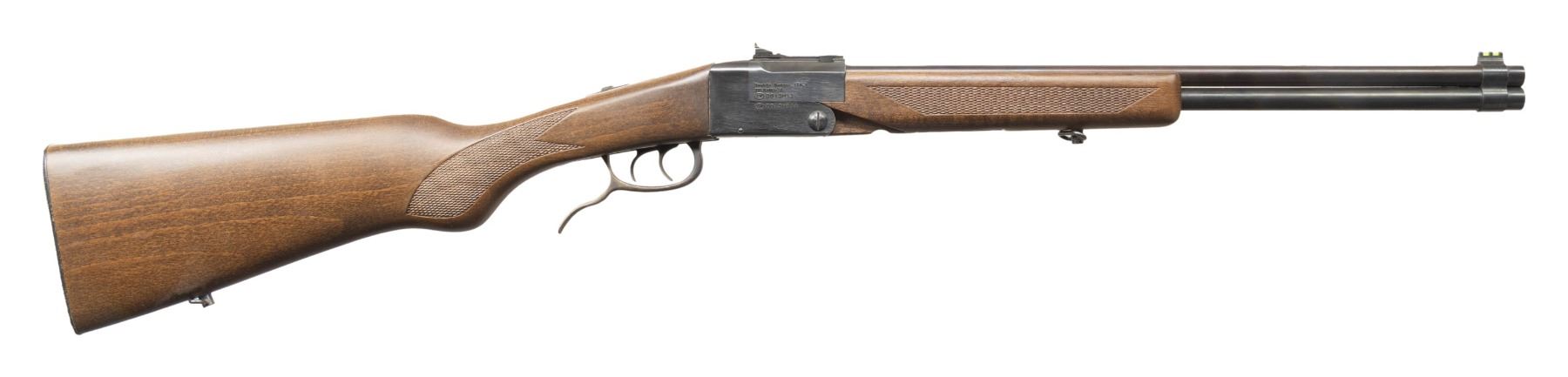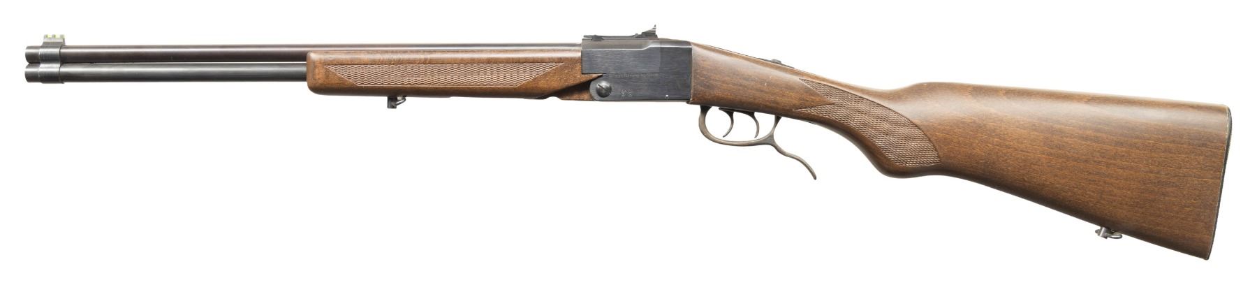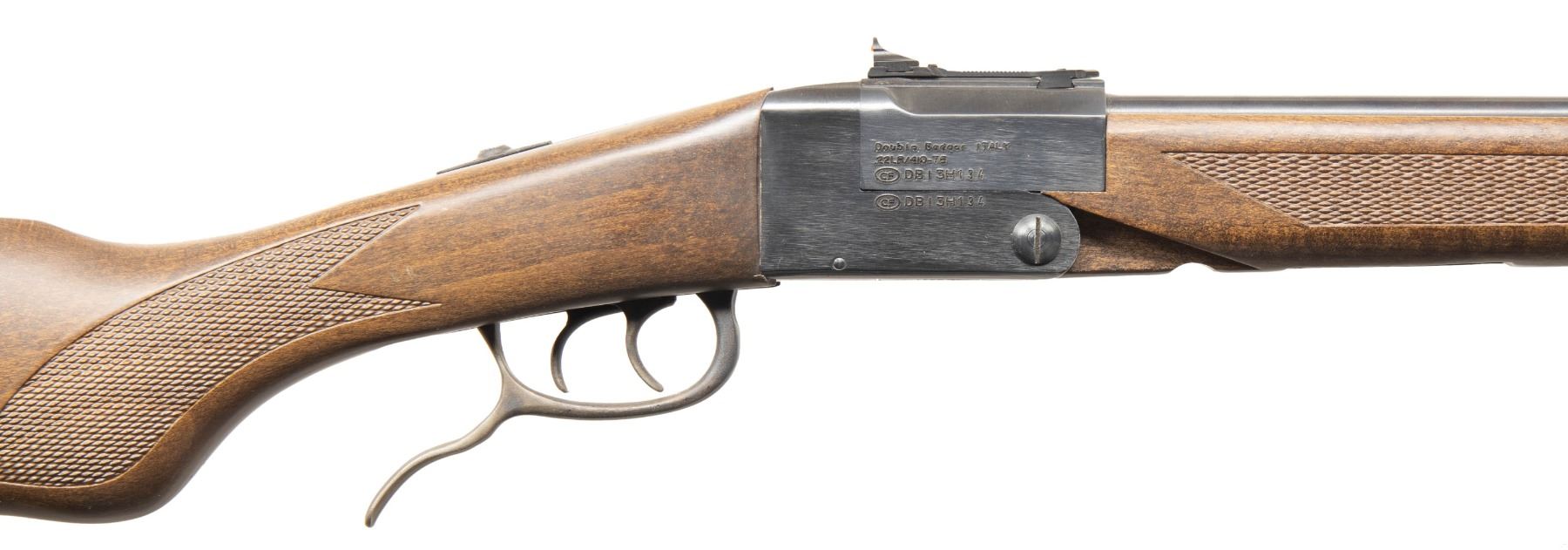 1) Chiappa Double Badger O/U Combo Rifle. Cal. 22/410. S# DB13H134. Bbls. 20". Fiber optic sights. Bbl. has four vacant holes for further sight mounted. Double triggers. Blued finish with case colored trigger guard. Checkered walnut stock with bottom mounted sling swivels. CONDITION: stock set & metal show light handling wear. Action functions properly when hand cycled. Near excellent bores. (25-5883/MJC).