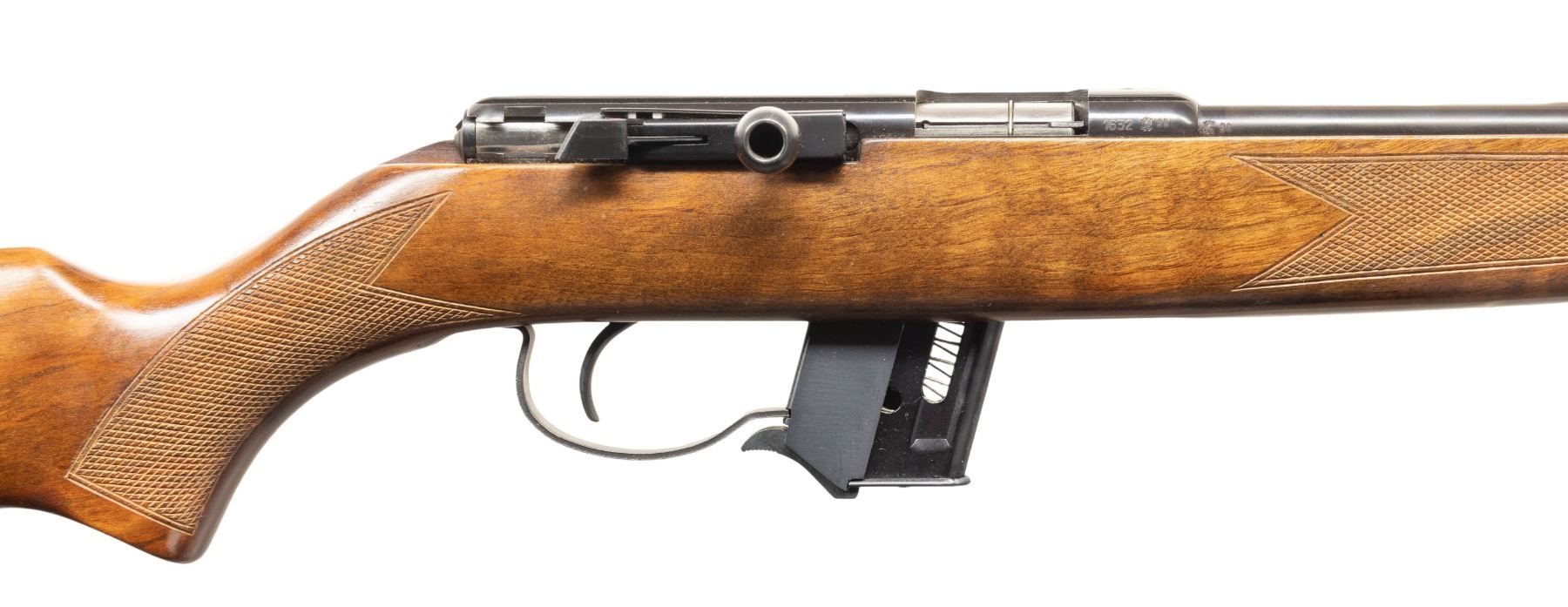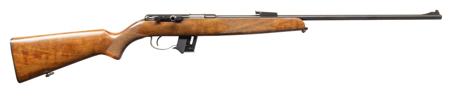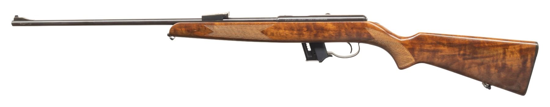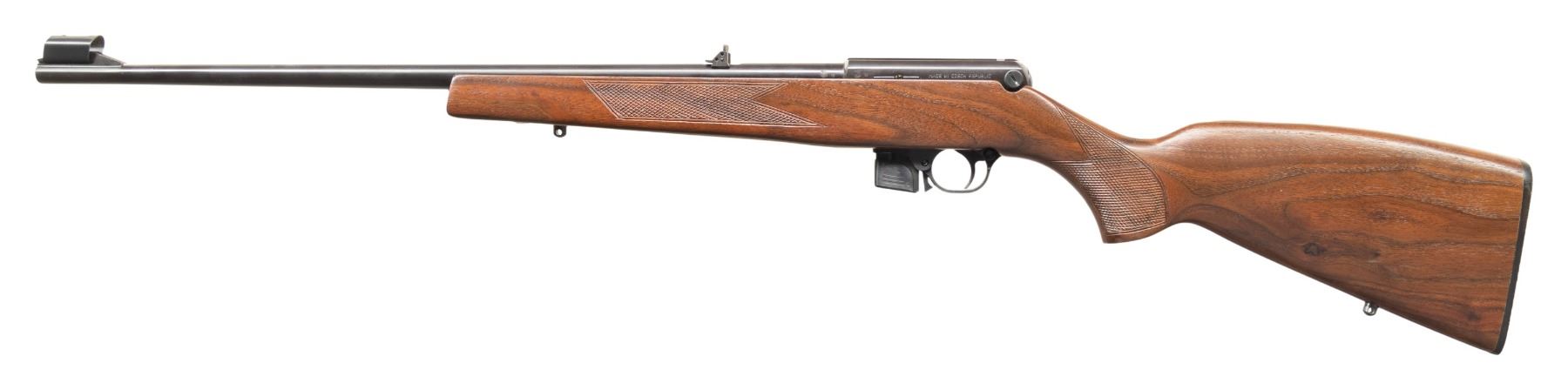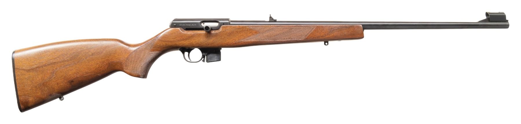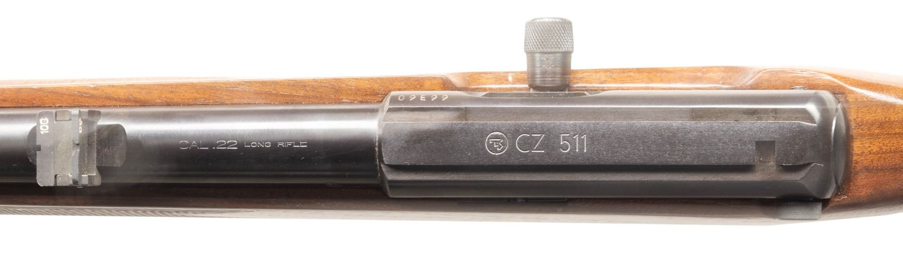 1) CZ 511 Semi Auto Rifle. S# 66360. Bbl. 22". Hooded blade front sight. Flip up rear sight. Receiver is grooved for further sight mounting. Right rear of receiver has CZ Kansas City import marking. Blued finish. Checkered walnut pistol grip stock with bottom mounted sling studs. MAGS: 1-8 rd. CONDITION: stock shows scattered handling marks & light scratches. Metal retains 98% original blue with some light handling & edge wear. Action functions properly when hand cycled. Bright near excellent bore. (25-5886/MJC).