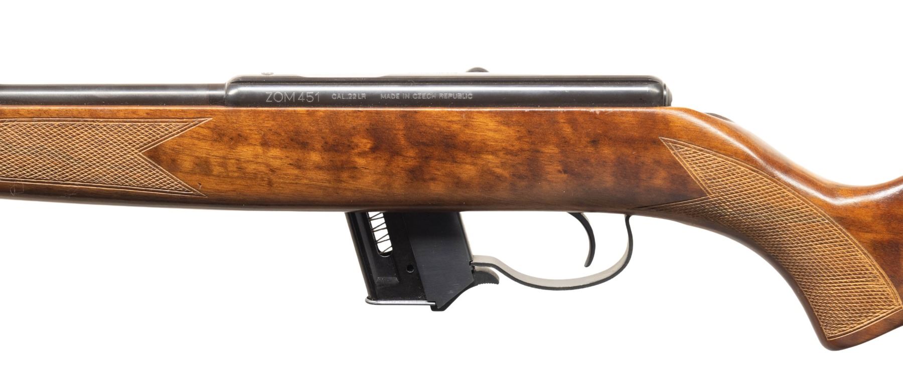 2) CZ Brno ZOM 451 Straight Pull Bolt Action Rifle. S# 1632. Bbl. 23" with Century import marking. Ramped blade front sight. Adjustable rear sight. Receiver is grooved for scope mounting. 1999 dated straight pull rifle. Blued finish. Checkered walnut stock with bottom mounted sling swivels. MAGS: 1-7 rd. CONDITION: stock shows a few light dings & handling marks. Metal retains 98% original blue with some light edge & handling wear. Action functions properly when hand cycled. Bright near excellent bore. PROVENANCE: From the PMRB Collection. (25-5931/MJC). BOTH MODERN. $600-900 for pair.