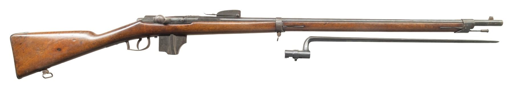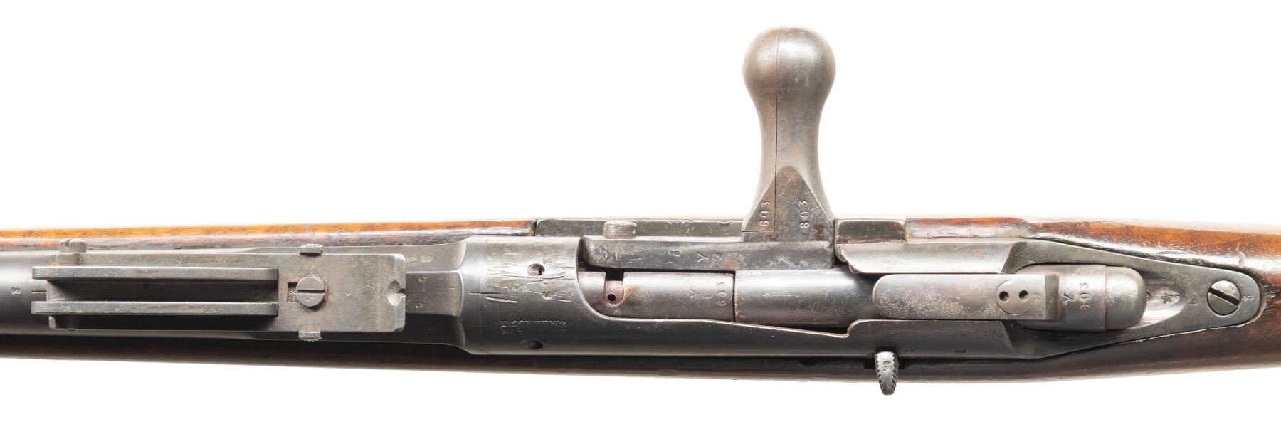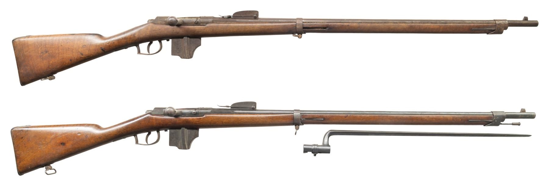 2) Beaumont Vitali 1871/88 Bolt Action Rifle. S# 785. Bbl. 32 1/4". Blade front sight. Tangent rear sight. Balance of parts have separate assembly number that matches each other such as bolt parts, rear sight & follower. Rifle was arsenal updated from single shot to Vitali magazine. Bbl. dated 1874. Receiver has faint Massarchit marking. Reblue finish. Hardwood stock set with bottom mounted sling swivels. Replacement short ramrod present. Right side of butt has partly faded 1875 dated cartouche. UNATTACHED ACCESSORIES: socket bayonet. CONDITION: stock has older added finish with shows some chipping, small cracks, scattered dings, scratches & handling marks. Metal shows some tool marks on receiver & rear of bbl. Metal otherwise retains most of its reblue finish with scattered oxidation, pitting, handling marks & edge wear. Action functions properly when hand cycled. Bore shows some pitting & oxidation but strong rifling. PROVENANCE: From the PMRB Collection. (01-28390/MJC). BOTH ANTIQUE. $600-1,000 for pair.