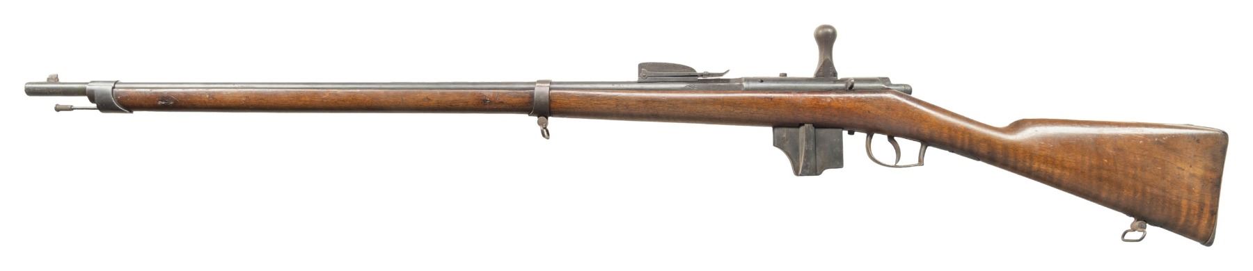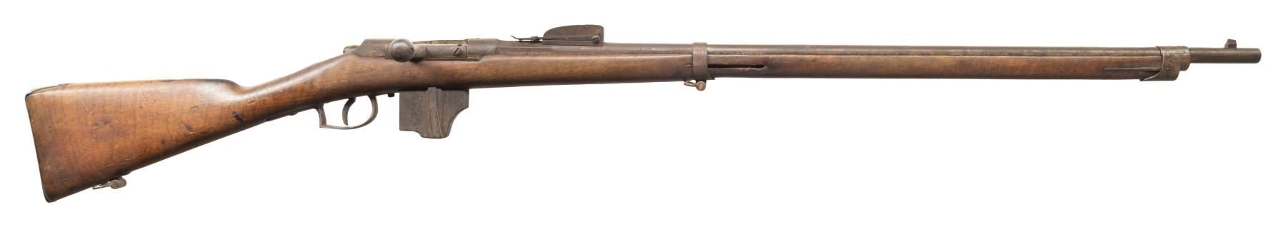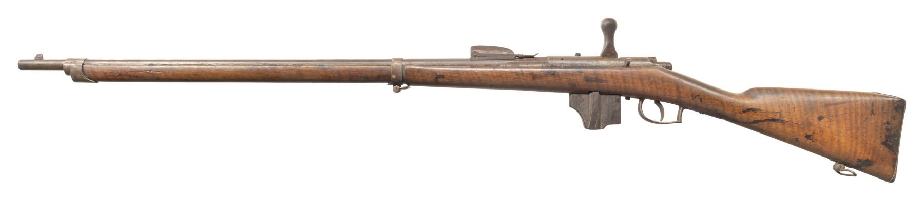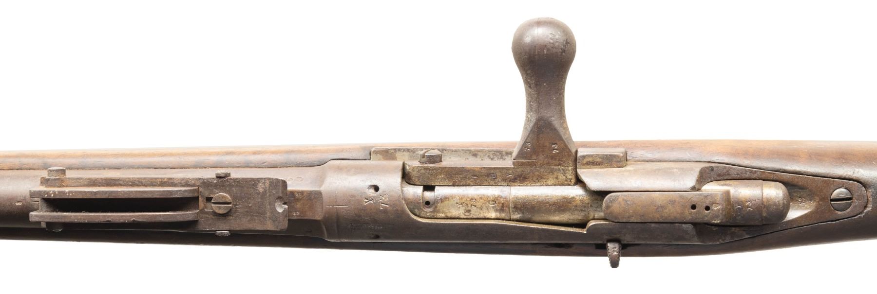1) Beaumont Vitali 1871/88 Bolt Action Rifle. S# 4636. Bbl. 32 1/4". Blade front sight. Tangent rear sight. Rifle was arsenal updated from single shot to Vitali magazine. Receiver, rear sight, follower & bolt parts all bear "73" number, while buttplate & bbl. are numbered "4636". Bbl. dated 1874. Receiver has faint Massarchit marking. Hardwood stock set with bottom mounted sling swivels. Rear band keeper & ramrod are missing. Right side of butt has faint 1875 dated Dutch roundel. CONDITION: sanded stock set shows a couple small cracks, some chipping, dings, handling marks & staining. Metal is a dull gray oxidized patina with some dings & pitting. Action appears functional when hand cycled. Bore shows scattered oxidation & pitting but strong rifling. (01-28389/MJC).