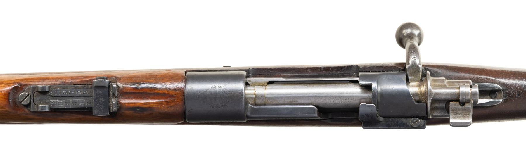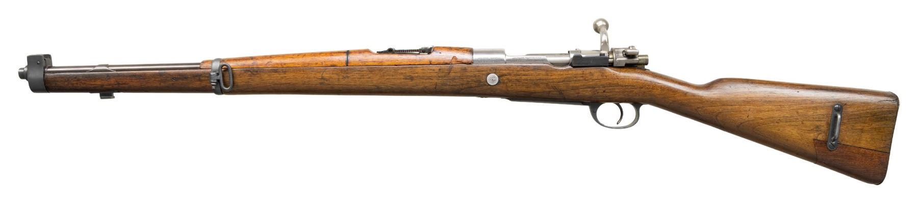 1) S# B7716. Standard Argentine 1909 carbine sights. Matching numbers on bolt & receiver. Other parts appear mismatched or unnumbered. Receiver ring has Argentine crest. Right rear of receiver has import marking. Left side of receiver has DWM markings. Receiver, bolt & buttplate are "In-the-white". Other parts showing varying shades of blue finish. Walnut stock set with left sling provisions & plugged bottom provisions. CONDITION: refinished stock shows a large armorer splice repair at toe, a couple small cracks, some chipping most notable on handguard, some scattered dings & handling marks. Receiver & bolt have been polished with light pitting, handling marks & oxidation. Balance of metal retains 95% reworked blue with some scattered blued over pitting, edge wear, oxidation, light dings & handling marks. Action functions properly when hand cycled. Bore shows scattered light pitting & frosting but strong rifling. (25-5328/MJC).