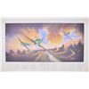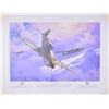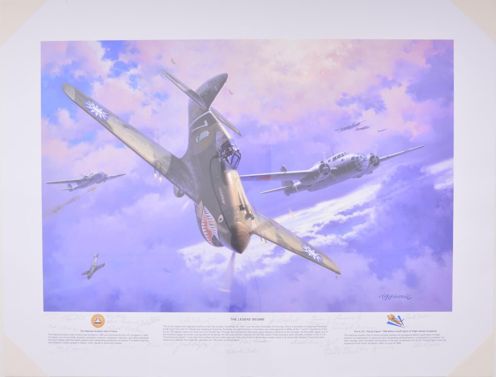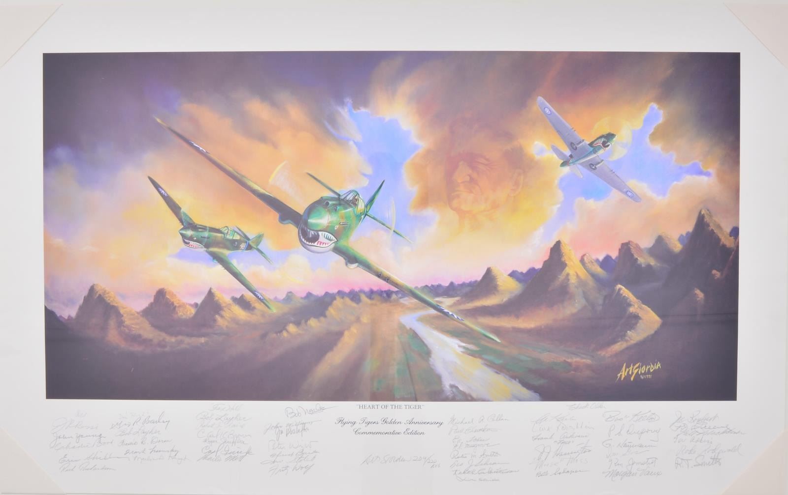 This lot consists of two Flying Tiger themed prints on white cardboard backing. The first print is by Roy Grinelll & titled 'The Legend Begins". It depicts the AVG's first action on December 20th, 1941 in Kunming, China. The print shows P40Bs attacking a formation of Ki-48 Lily bombers. In this action the AVG would shoot down 3 enemy bombers & take no losses. The print is numbered 270/350 & signed by several Flying Tigers including Tex Hill, Red Hanks & Bob Layher. The backing of the print measures 40" x 30" & shows some dents on the edges. The second print is by Art Siordia & titled "Heart Of The Tiger". This print is also labeled "Flying Tigers Golden Anniversary Commemorative Edition" & numbered 204/220. This print depicts three P40's flying over the hills of Kwelin w/ Claire Chennault's face in the clouds. The print is also signed by several Flying Tigers including Tex Hill, Doc Rich & John Young. The backing measures 40" x 30" & show somes denting on the edges. (02-16953-18/MJC). $300-500.
