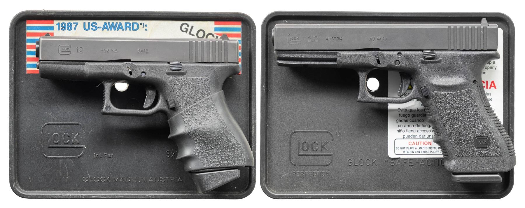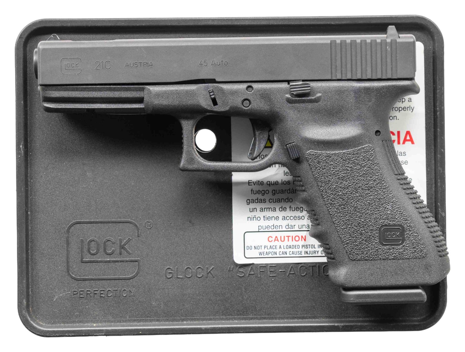 2) Gen 3 Glock 21C Semi Auto Pistol. Cal. 45 ACP. S# ESL728US. Bbl. 4 1/2". Standard white outline Glock sights. Austrian made Glock 21C pistol with ported bbl. & slide. Matte black finish. Polymer frame with accessory rail & finger grooves. MAGS: 2-13 rd. UNATTACHED ACCESSORIES: matching numbered factory "Tupperware" box with two mag loaders, cleaning rod & bore brush. CONDITION: slide shows scattered light edge & carry wear. Frame shows light handling marks. Action functions properly when hand cycled. Bright near excellent bore. (25-5252/MJC). BOTH MODERN. $600-800 for lot.