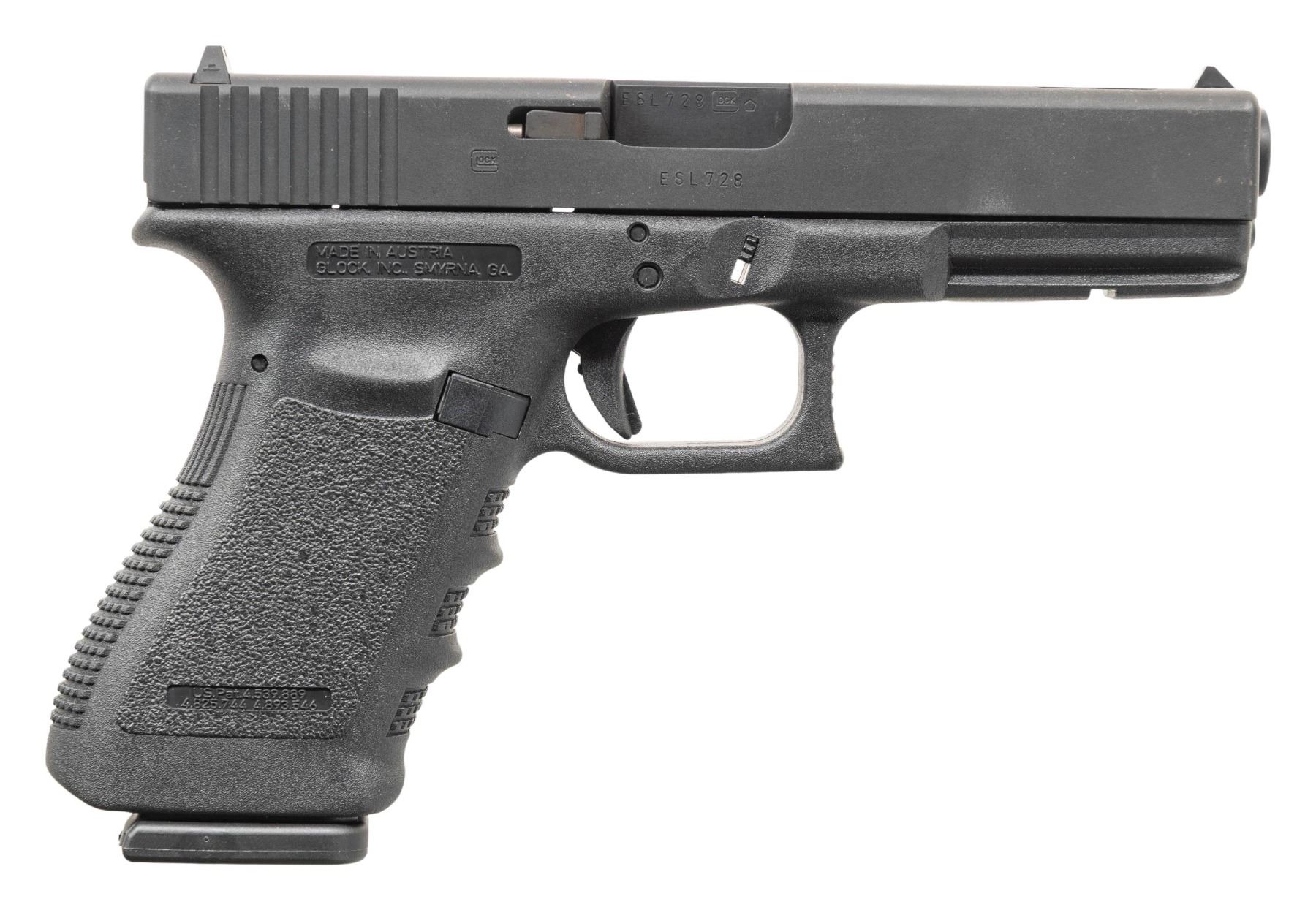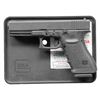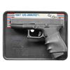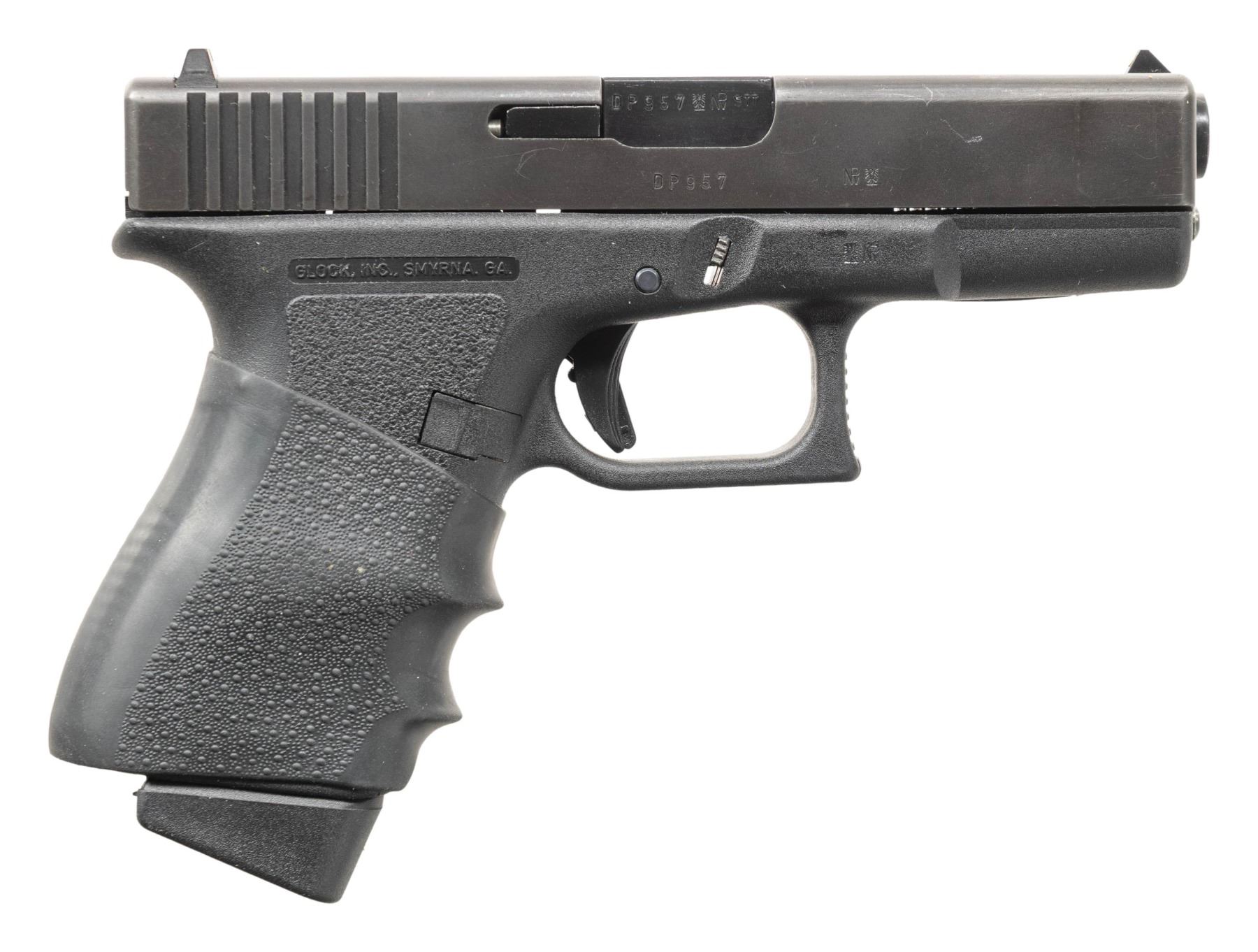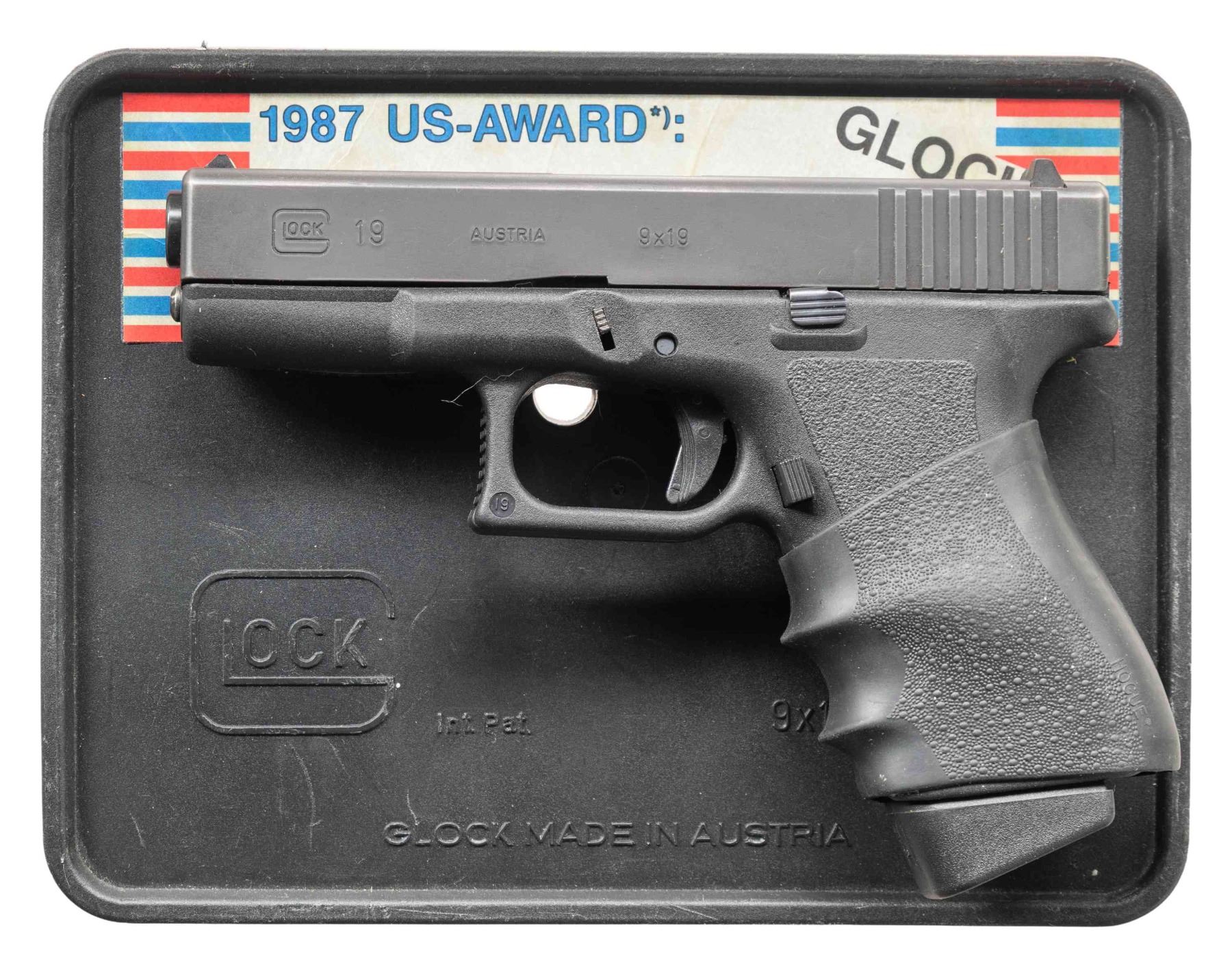 1) Gen 2 Glock 19 Semi Auto Pistol. Cal. 9mm Luger. S# DP957US. Bbl. 4". Standard white outline Glock sights. Gen2 Glock 19 pistol. Slip on rubber finger grooves. Matte black finish. Polymer frame. MAGS: 3-17 rd. Two of the mags are 15 rd. with 2 rd. extensions. UNATTACHED ACCESSORIES: matching numbered factory "Tupperware" box with mag loader, cleaning rod, brush & manual. CONDITION: polymer shows some handling marks & carry wear. Slide shows scattered edge & handling wear. Action functions properly when hand cycled. Very good plus bore with some dried grease. (25-5251/MJC).