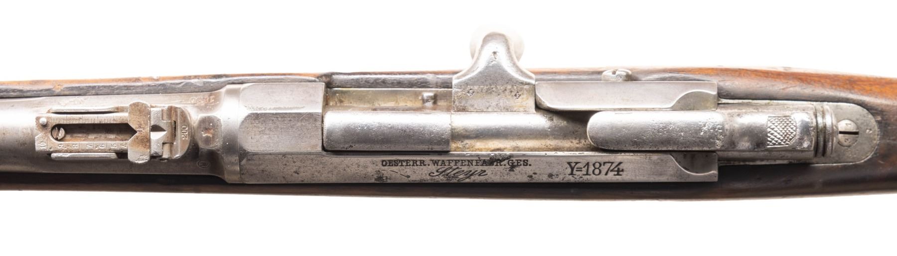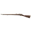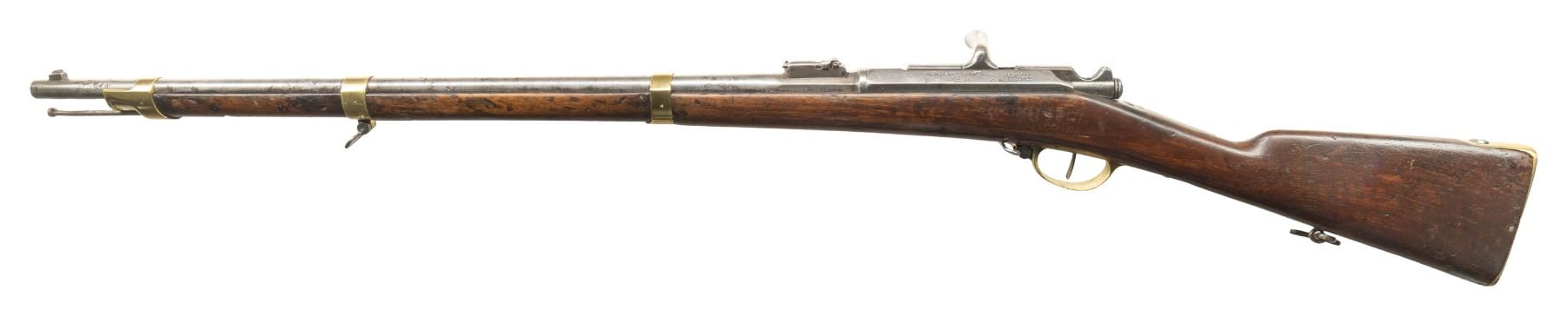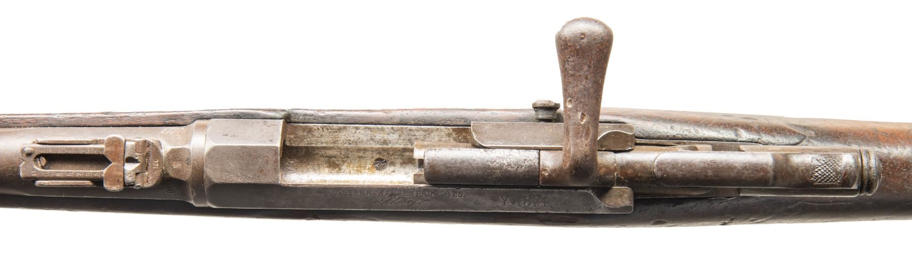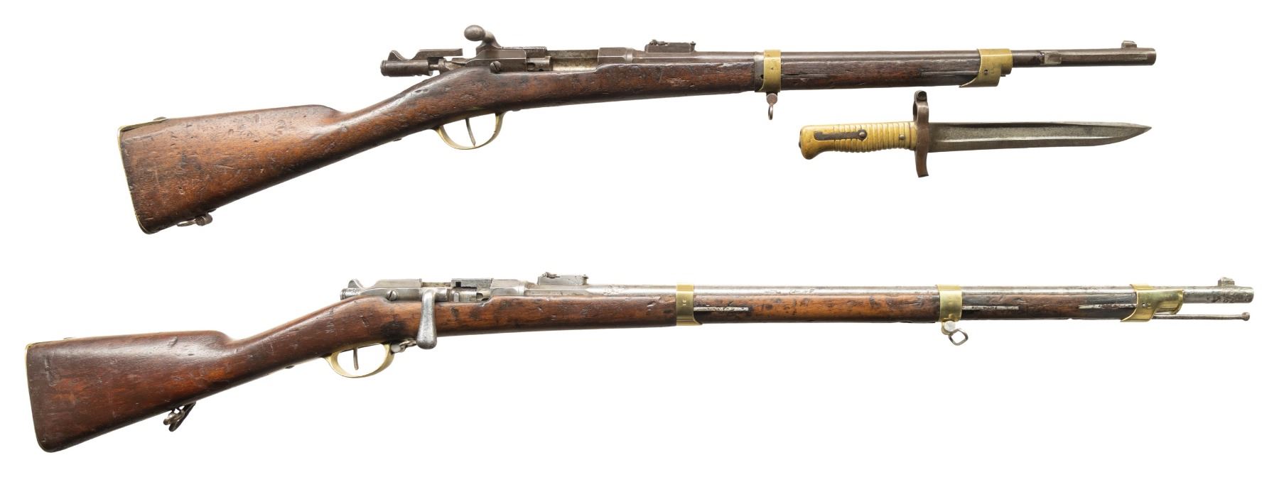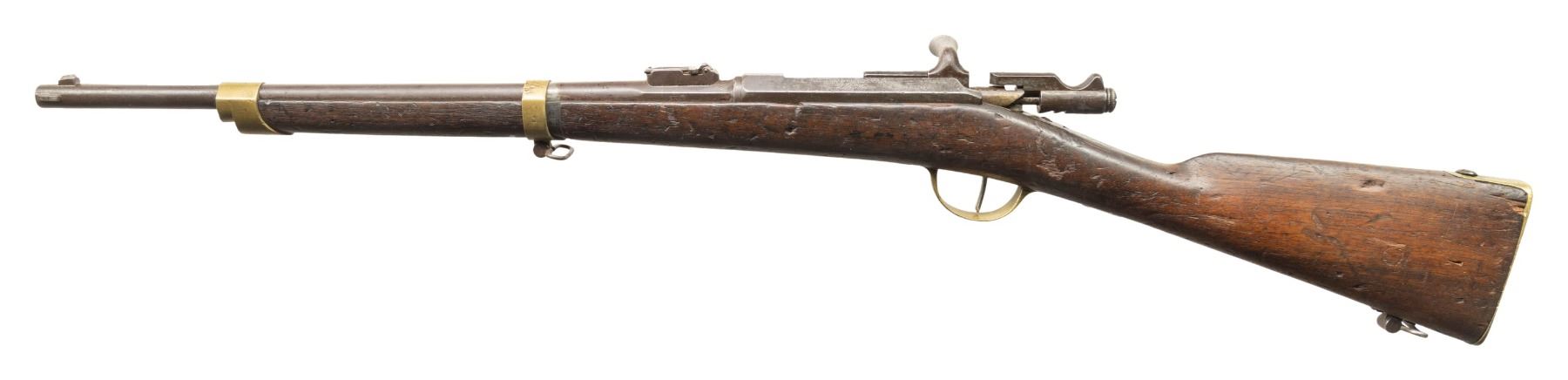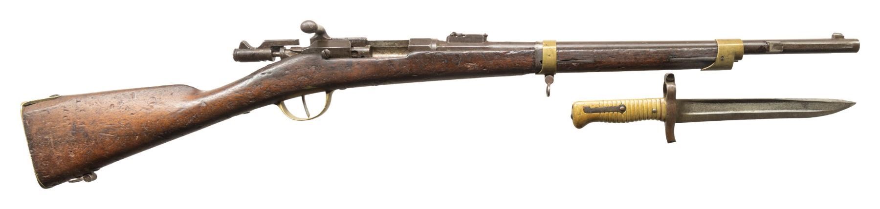 1) Greek 1874 Gras Artillery Musketoon. S# 3372. Bbl. 19". Blade front sight. Ladder rear sight graduated to 1100m. Bolt parts are mismatched, no visible stock number but other visible parts are matching. No extractor assembly present. Greek contract 1874 Gras Artillery Musketoon. Bbl. has 1877 date. Left side of receiver has Steyr markings & Greek "Y1874" model designation. Hardwood stock set with brass hardware & bottom mounted sling swivels that are a bit bent. Rear band is on backwards & loose. No ramrod present. UNATTACHED ACCESSORIES: brass handled Chassepot style bayonet that appears shortened. No scabbard present. CONDITION: stock has a darkened appearance with some faint writing, a large chip behind upper tang, another large chip to right of buttplate, a few other chips, scattered gouges, dings, handling marks & scratches. Brass parts are a dull yellow patina with oxidation, dings & pitting. Balance of metal is a gray oxidized patina with scattered pitting, dings & edge wear. Action is stuck rearward & will require attention to fix. Bore shows notable pitting along its length with visible rifling. (01-28409/MJC).