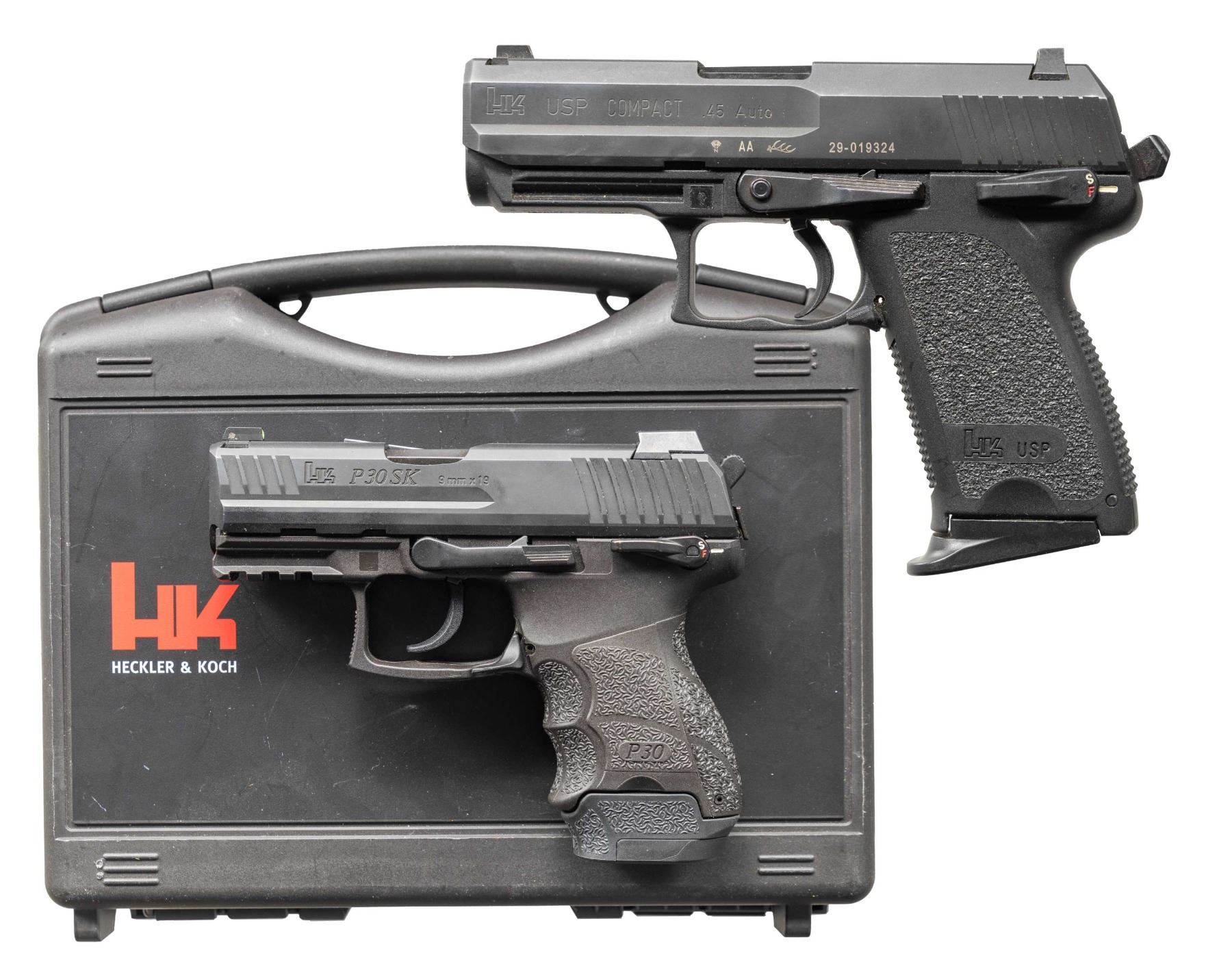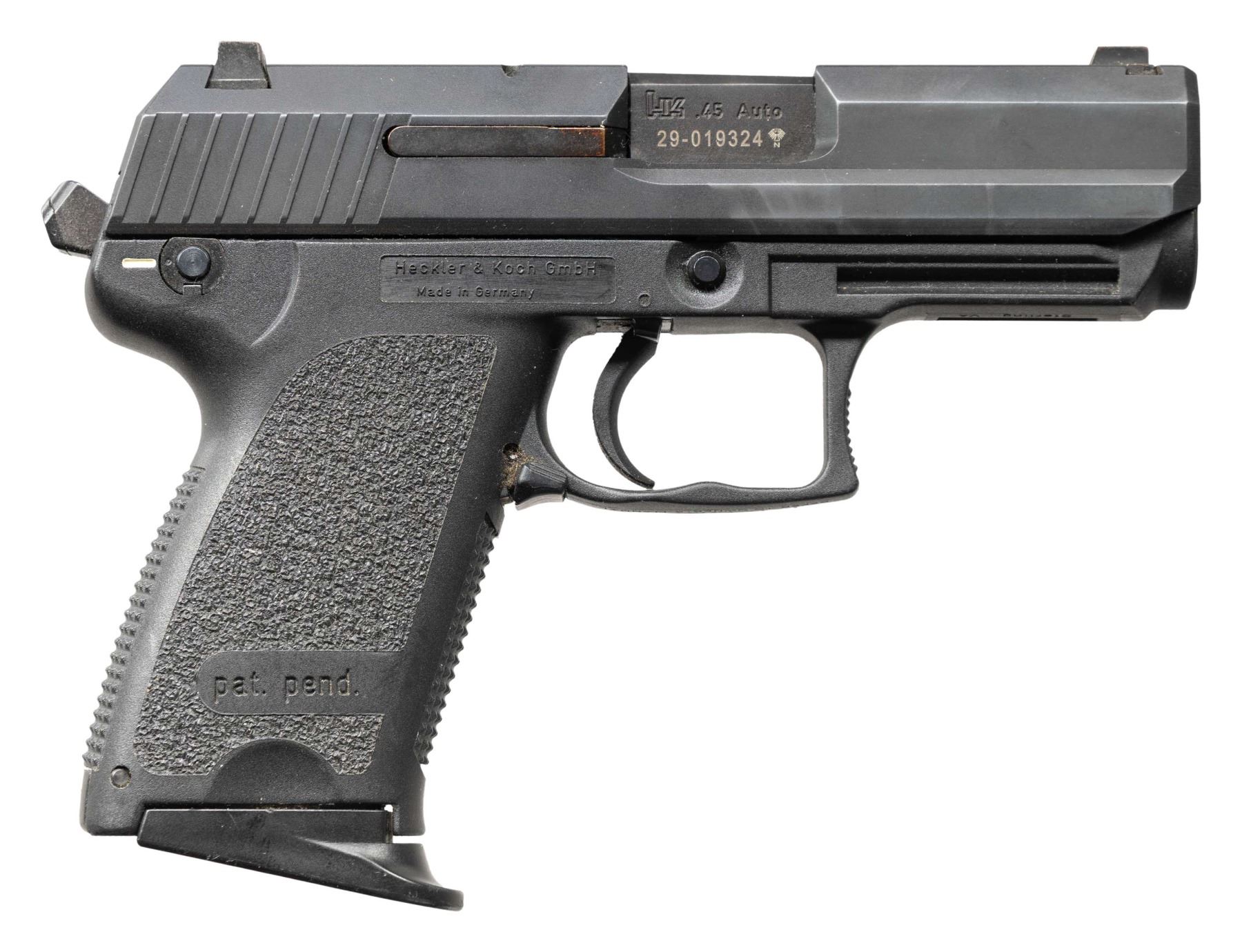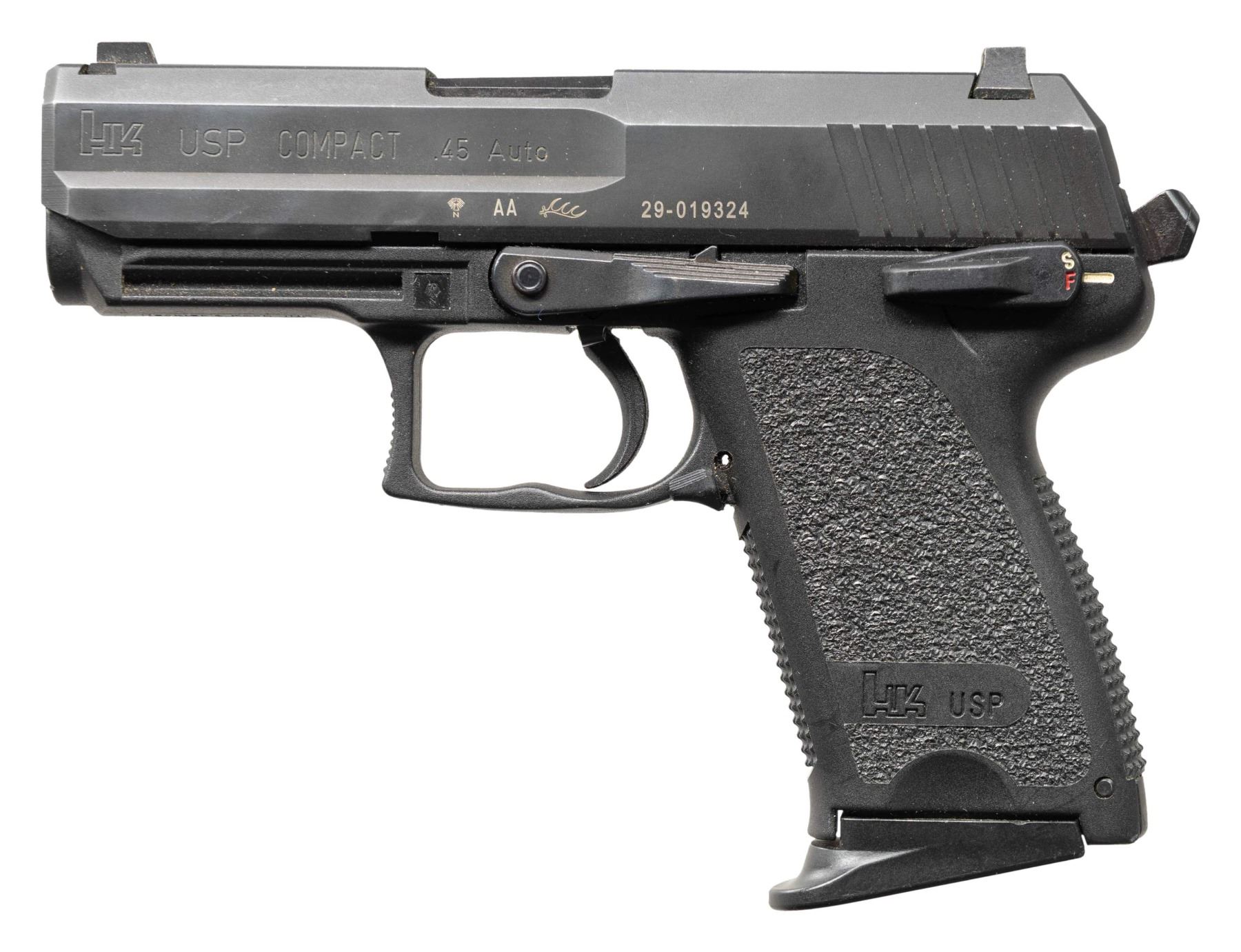 1) USP 45 Compact. Cal. 45 ACP. S# 29-019324. Bbl. 3 3/4". Three dot sights. Shrouded hammer. Manual safety that also acts as a decocker. Matte black finish. Polymer frame with H&K accessory rail. MAGS: 1-8 rd. CONDITION: frame shows light handling wear. Slide retains 97% original finish with some light edge & carry wear. Action functions properly when hand cycled. Near excellent bore. (25-4616/MJC).