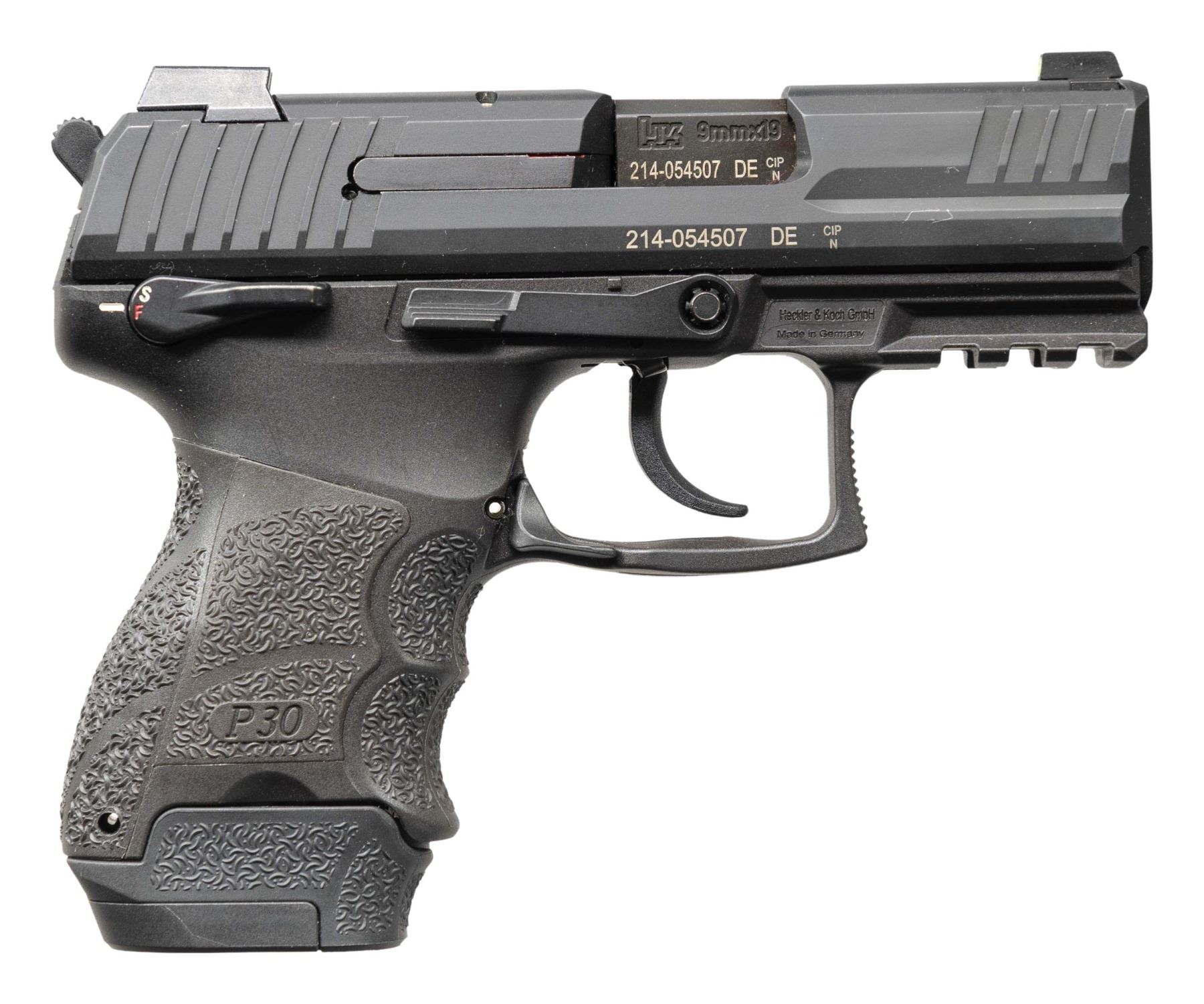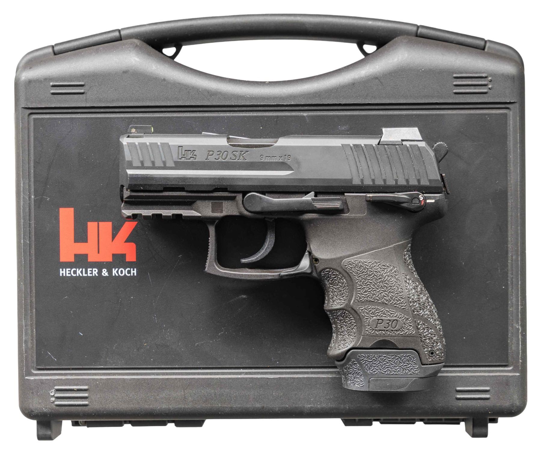 2) P30SK Semi Auto Pistol. Cal 9x19. S# 214-054507. Bbl. 3 1/4". 3-dot sights. Ambi manual safety. Matte black finish. Polymer frame with picatinny accessory rail. MAGS: 1-10 rd., 1-13 rd. & 1-15 rd. Total of 3. UNATTACHED ACCESSORIES: matching numbered factory hardcase with 5 grip straps, trigger lock, manual, spare mag floorplate & mag loader. CONDITION: grip & metal show some handling marks & light edge wear. Action functions properly when hand cycled. Bright near excellent bore. (25-4705/MJC). BOTH MODERN. $900-1,400 for lot.