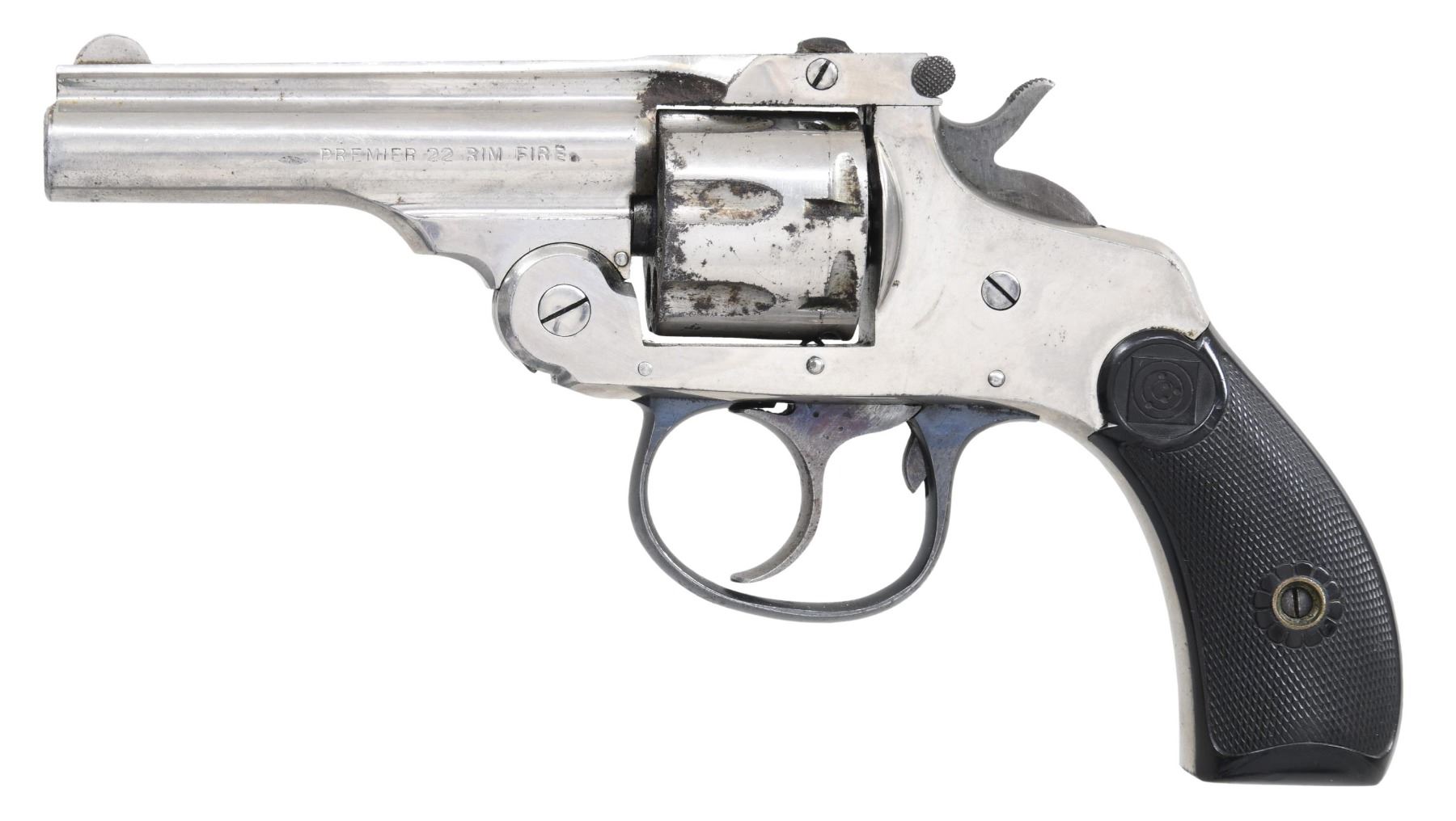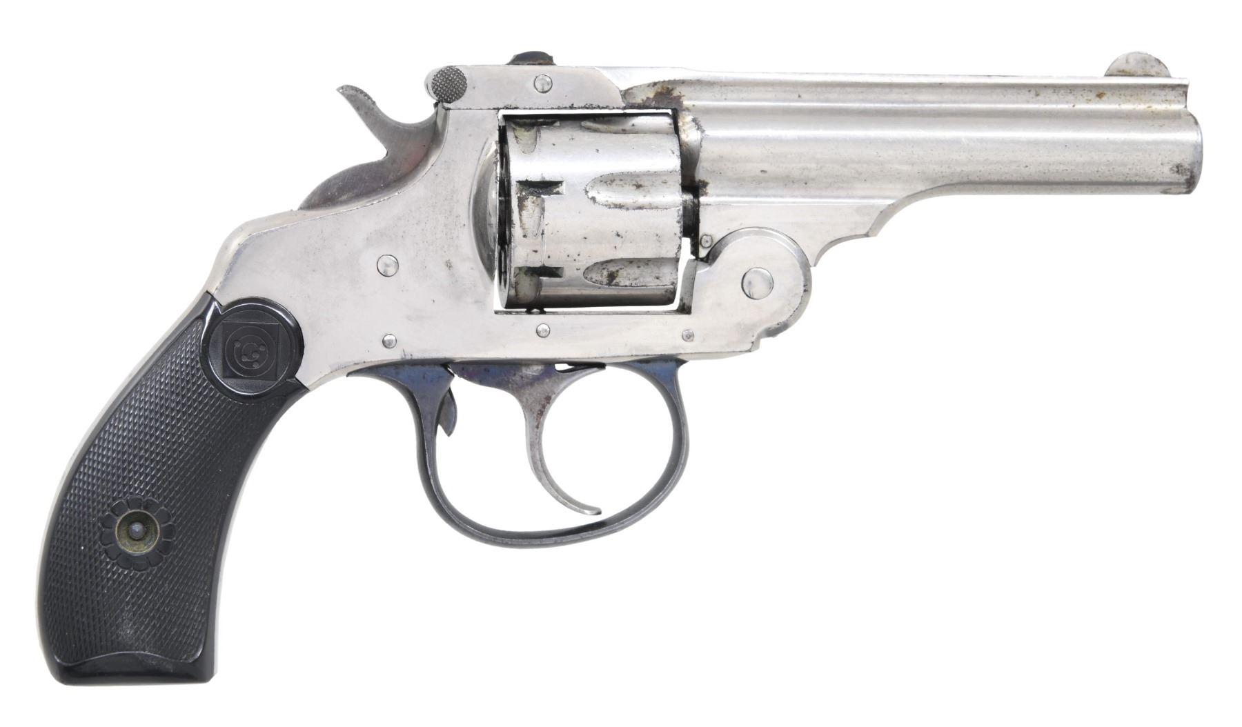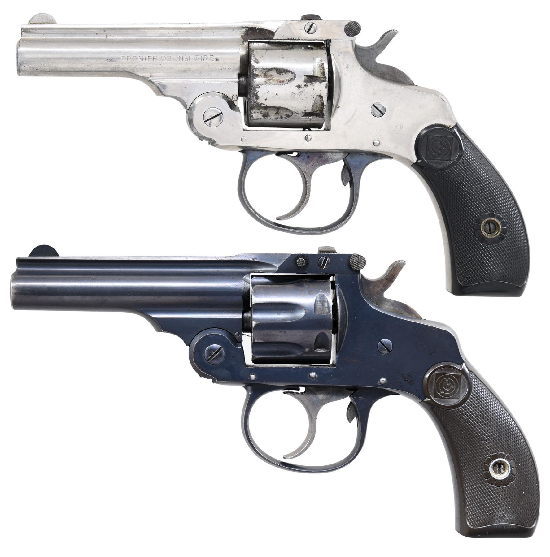 1) H&R TOP BREAK PREMIER DA REVOLVER. Cal. 22 RF. S# 165814. Bbl. 3". Round blade front sight. U-notch rear sight. Nickel finish with blued trigger guard, case colored trigger & hammer. Checkered black hard rubber grips with target logo. CONDITION: grips show scattered worn checkering & handling marks. Metal shows scattered fading, dings, flaking nickel & oxidation. Action cycles but cyl. appears to be slightly out of time & rotates when hammer is cocked. Poor bore with oxidation & pitting. (24-7218/MJC). 2) H&R TOP BREAK DA REVOLVER. Cal. 22 LR. S# 9842 (under grips). Bbl. 3". Round blade front sight. U-notch rear sight. Blued finish with case colored trigger & hammer. Checkered black hard rubber grips with target logo. CONDITION: grips show some checkering & handling wear. Metal shows scattered oxidation, edge wear & fading. Cyl. shows some play when cocked & may have a timing issue. Bore has a few patches of pitting & oxidation but evident rifling. (24-7220/MJC). BOTH CURIO. $300-500 for pair.