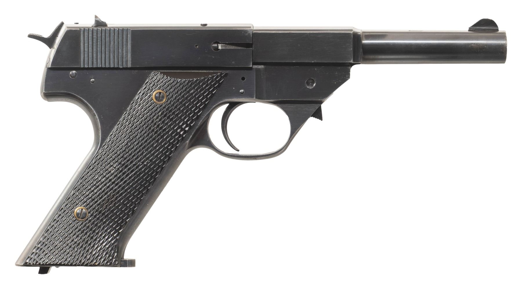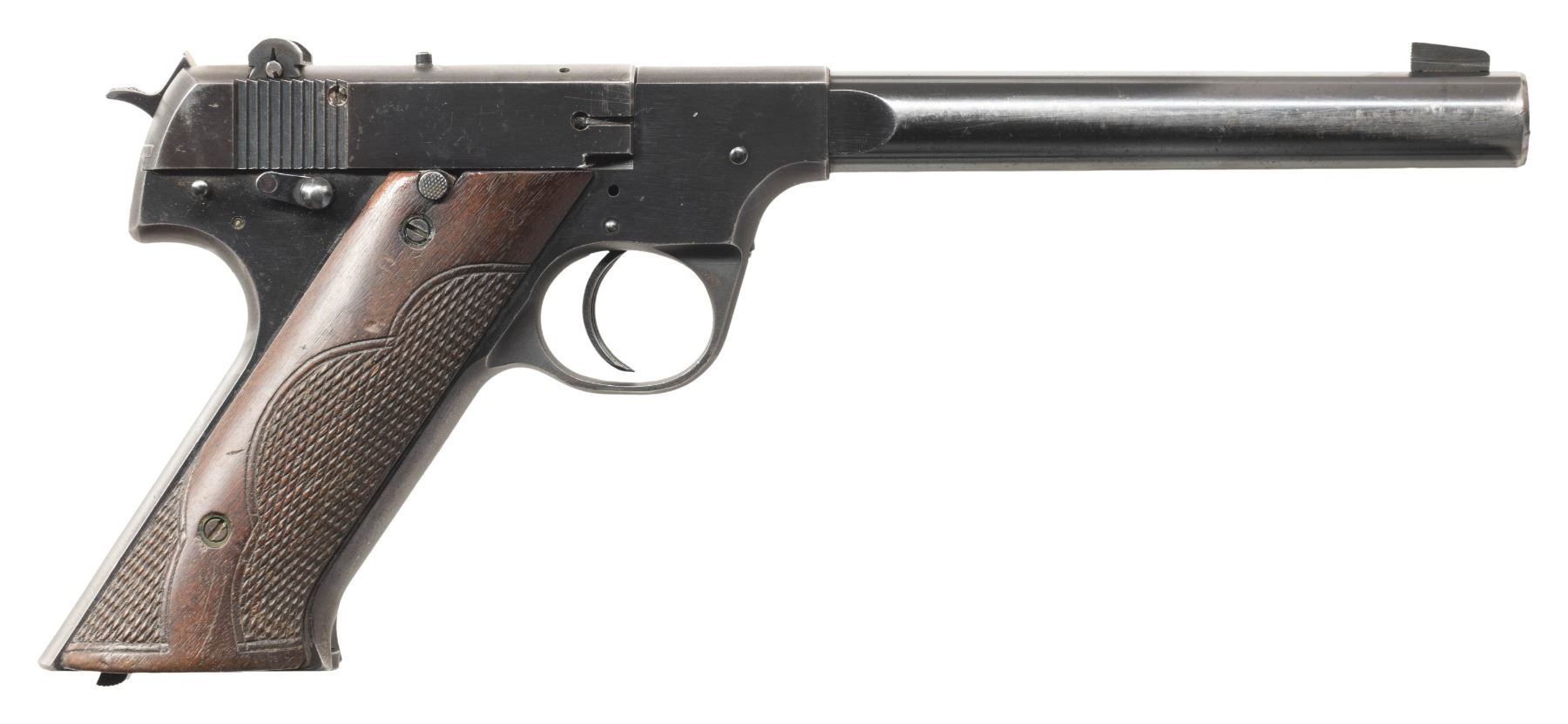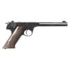 Cal. 22 LR. S# 244470. Bbl. 6 3/4". Blade front sight with added orange paint. Adjustable square notch rear sight. Blued finish. Replacement checkered grips with right handed thumbrest. MAGS: 1-10 rd. CONDITION: grips show scattered dings, scratches & handling marks. Metal retains 50-60% original blue with notable high edge wear, some light oxidation & fading to gray along trigger guard & both grip straps. Action functions properly when hand cycled. Near excellent bright bore. (25-5371/MJC).