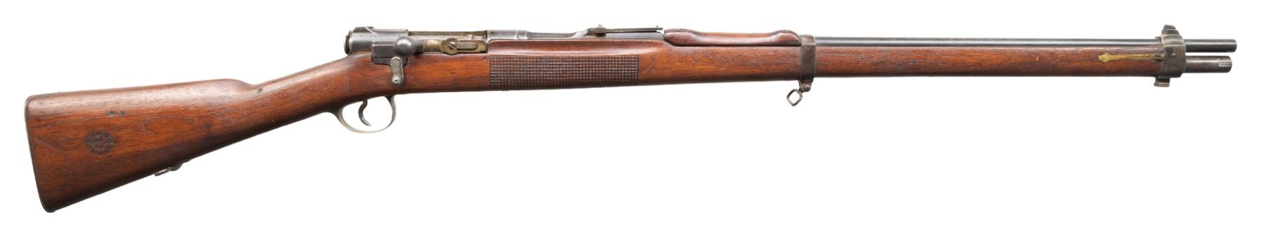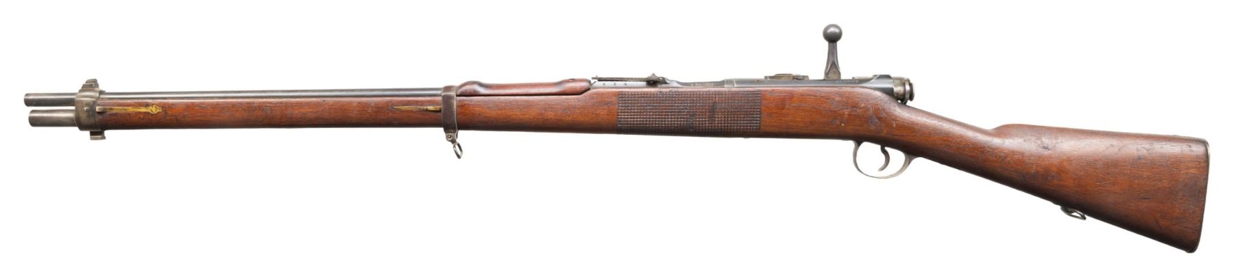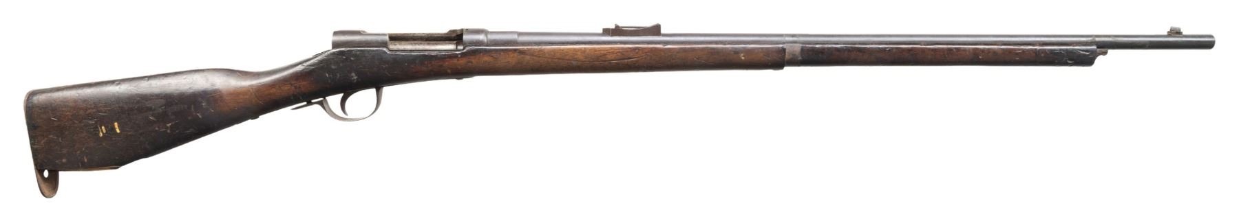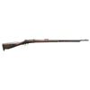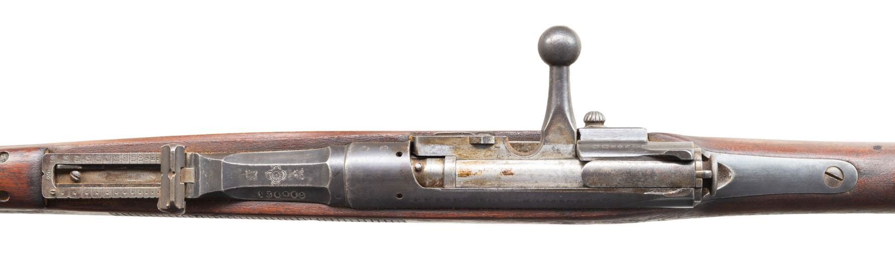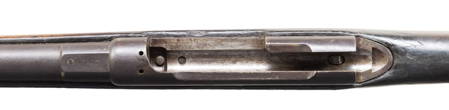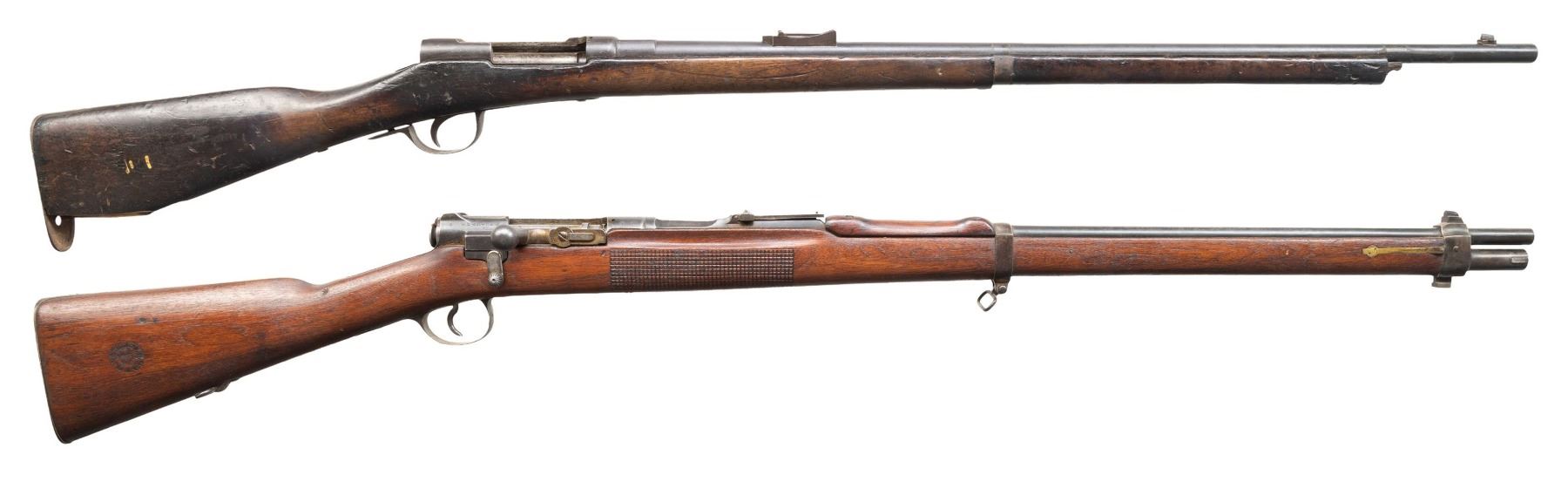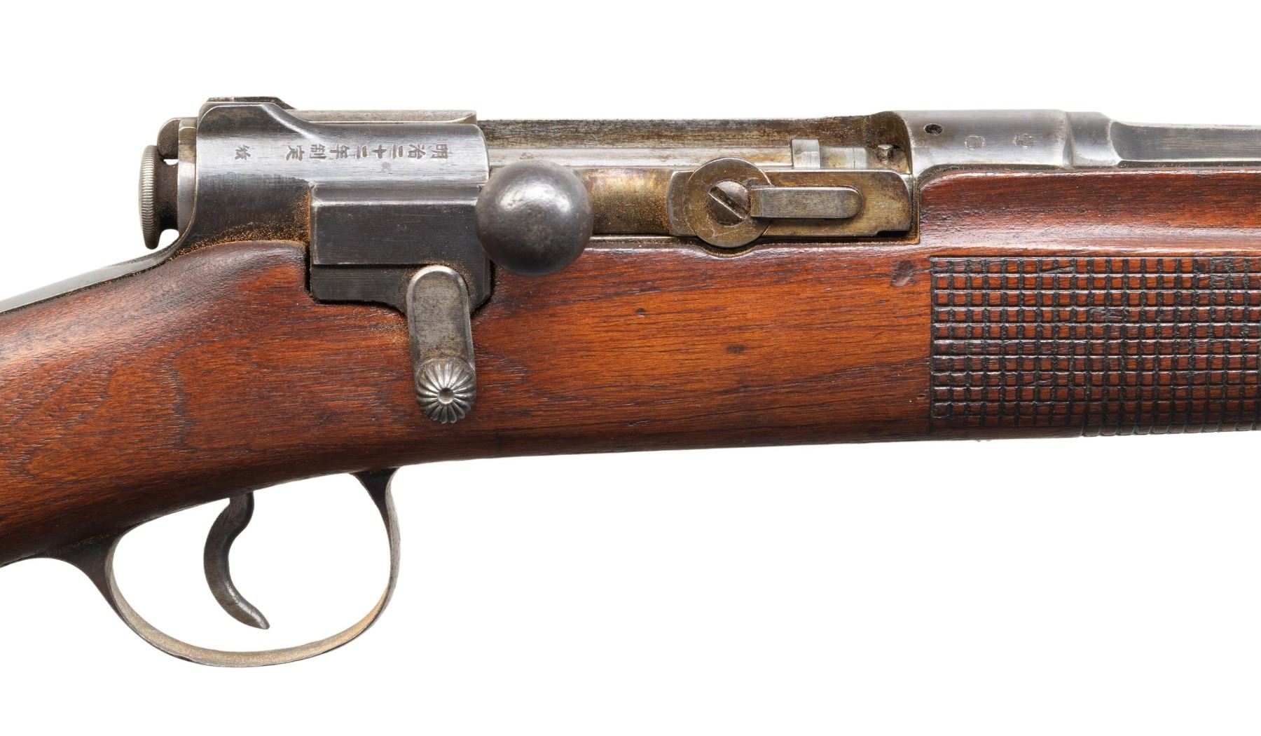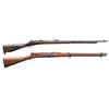 This lot consists of the following Murata rifles:1) Type 22 Murata Bolt Action Rifle. Cal. 8x53R. S# 136965. Bbl. 29". Blade front sight. Ladder rear sight graduated to 2000m. Rear sight, bayonet lug & bolt parts both bear "120" likely an assembly number. Other parts appear unnumbered. Mum has four pedal over stamp. Arsenal blue finish. Checkered Asian hardwood stock set with bottom mounted sling swivels. Right side of butt has Japanese roundel. CONDITION: stock has an older sanded appearance with added finish, some chipping on checkering, some dings, handling marks & scratches. Handguard is loose & will require attention to tighten Metal retains 30% arsenal blue with overall fading to gray, scattered oxidation, edge wear, handling marks & some light dings. Action functions properly when hand cycled. Bore has worn rifling with scattered dried grease & oxidation. (01-28721/MJC). 2) Type 13 Murata Rifle. Cal. 11x60R (11mm Murata). S# 59980. Bbl. 32". Blade front sight. Ladder rear sight graduated to 1300m. Early Murata rifle that is missing several parts including both bands, bolt assembly, front rear sight screw, sling hardware & lower buttplate screw. Visible parts are matching numbered to receiver. Bbl. top has intact mum. Arsenal blue finish. Asian hardwood stock. CONDITION: toe of butt shows a large chunk missing, stock otherwise shows a few cracks around both tangs, a couple other cracks, scattered chipping, dings, worn finish, handling marks & age related wear. Metal is mostly a dull gray patina with overall oxidation & some pitting. Bore shows pitting along its length but evident rifling. PROVENANCE: From the Buckstix Collection. (01-28720/MJC). BOTH ANTIQUE. $1,200-1,800 for pair.
