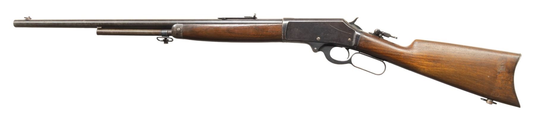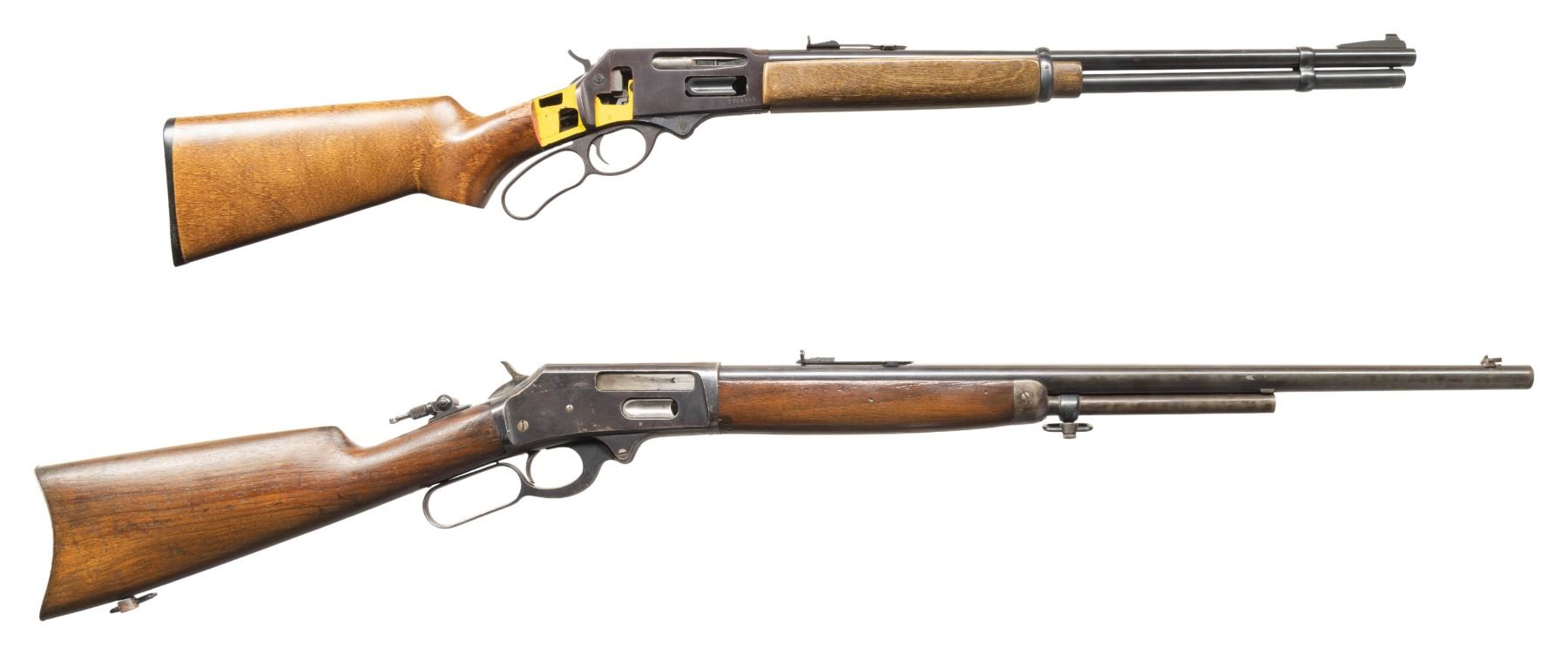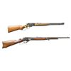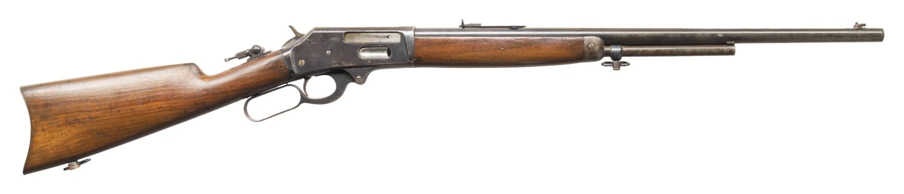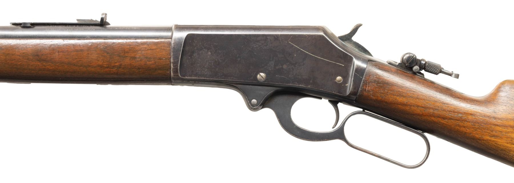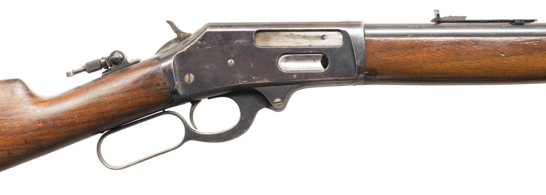 2) Stevens 425 High Power Lever Action Rifle. S# 4594. Bbl. 22". Beach style front sight. Sporting style rear sight on bbl. Additional folding aperture tang sight. Top of receiver has two screw holes for additional sight mounting. Stevens lever rifle made 1911-1917. Blued finish. Walnut stock set with bottom mounted sling swivels. CONDITION: stock set appears lightly sanded with added finish, a couple light chips, some dings & handling marks. Metal retains 60% blue with some areas being a smoky gray color possibly from old touch up, scattered oxidation, edge wear, fading & handling marks. Action functions properly when hand cycled. Bore shows some oxidation but strong rifling. PROVENANCE: From the PMRB Collection. (25-5967/MJC). CURIO. $600-1000 for pair.