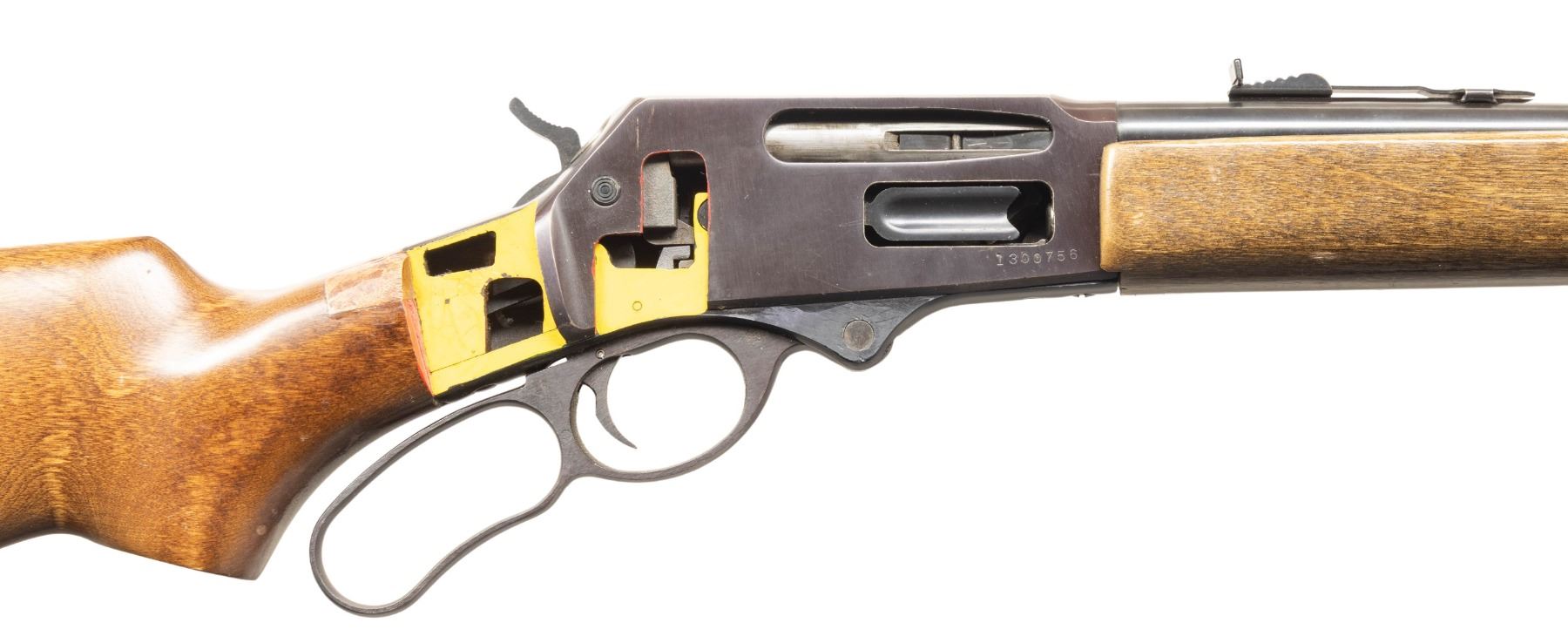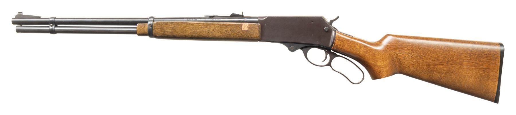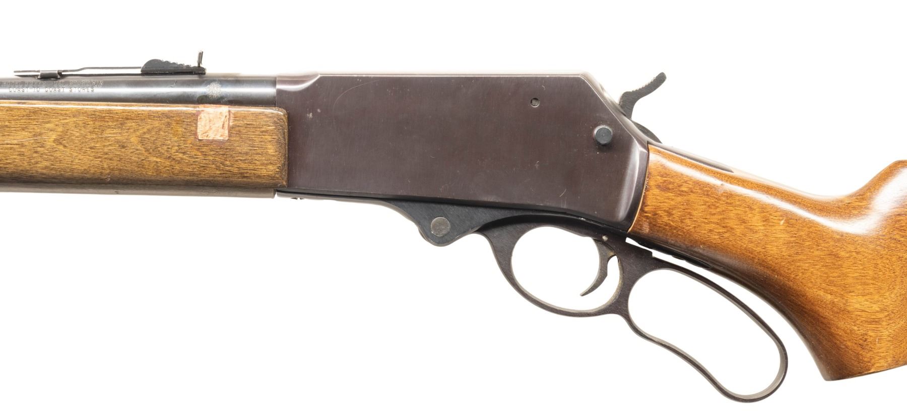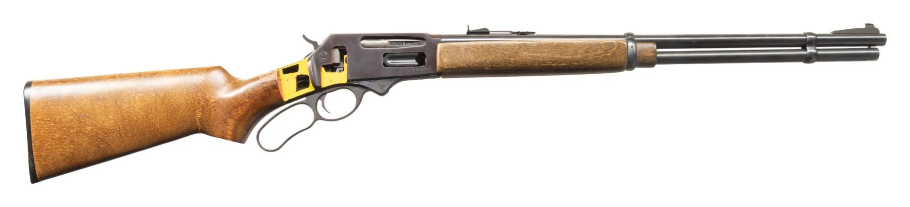 1) Master Mag CC779 Cutaway Lever Action Rifle. S# 1300756. Bbl. 20". Bead front sight. Adjustable sporting style rear sight. Mossberg made lever action rifle sold by Coast to Coast Stores. Rear right of action has two removed sections with yellow highlight to show rifle's inter workings. Blued finish. Hardwood stock set. CONDITION: stock shows a couple patch repairs, some handling marks, light dings & finish wear. Metal retains 95% blue with some edge wear, handling marks & a few specks of light oxidation. Action functions properly when hand cycled. Very good bore with strong rifling. (25-5829/MJC). MODERN.