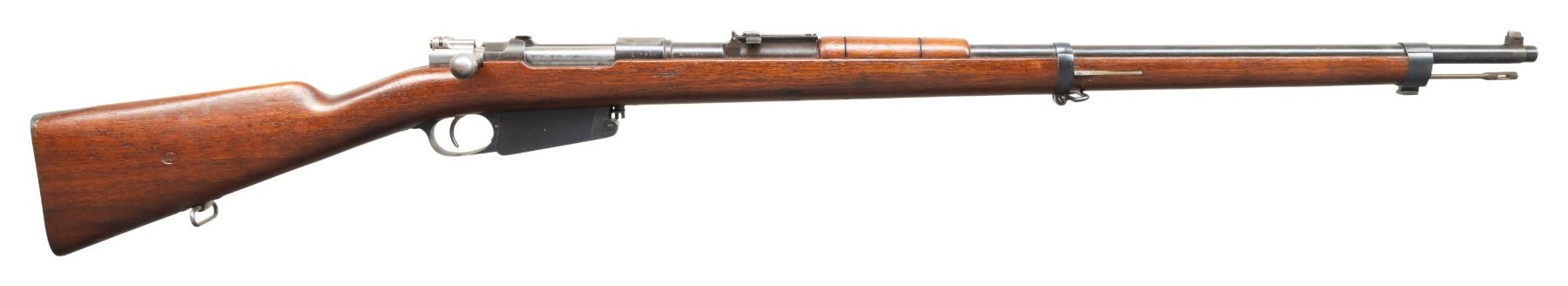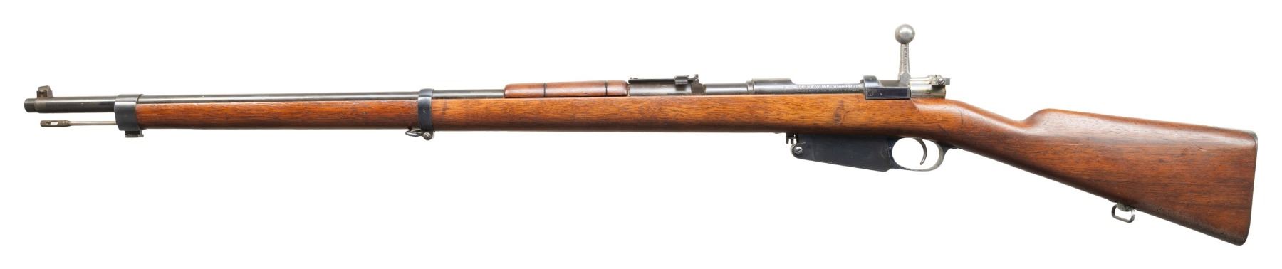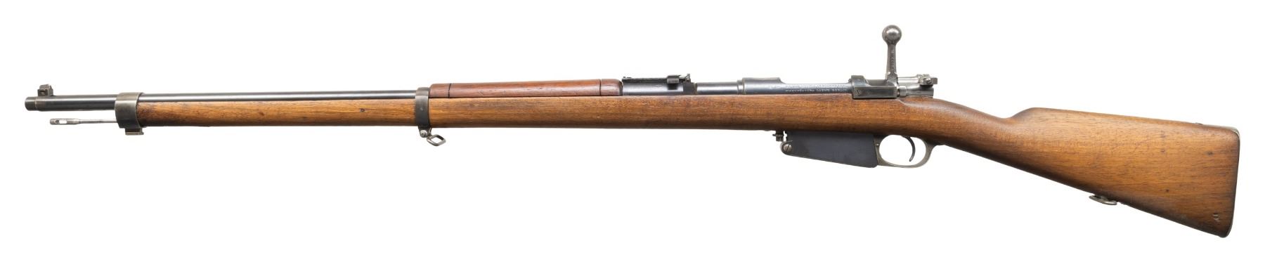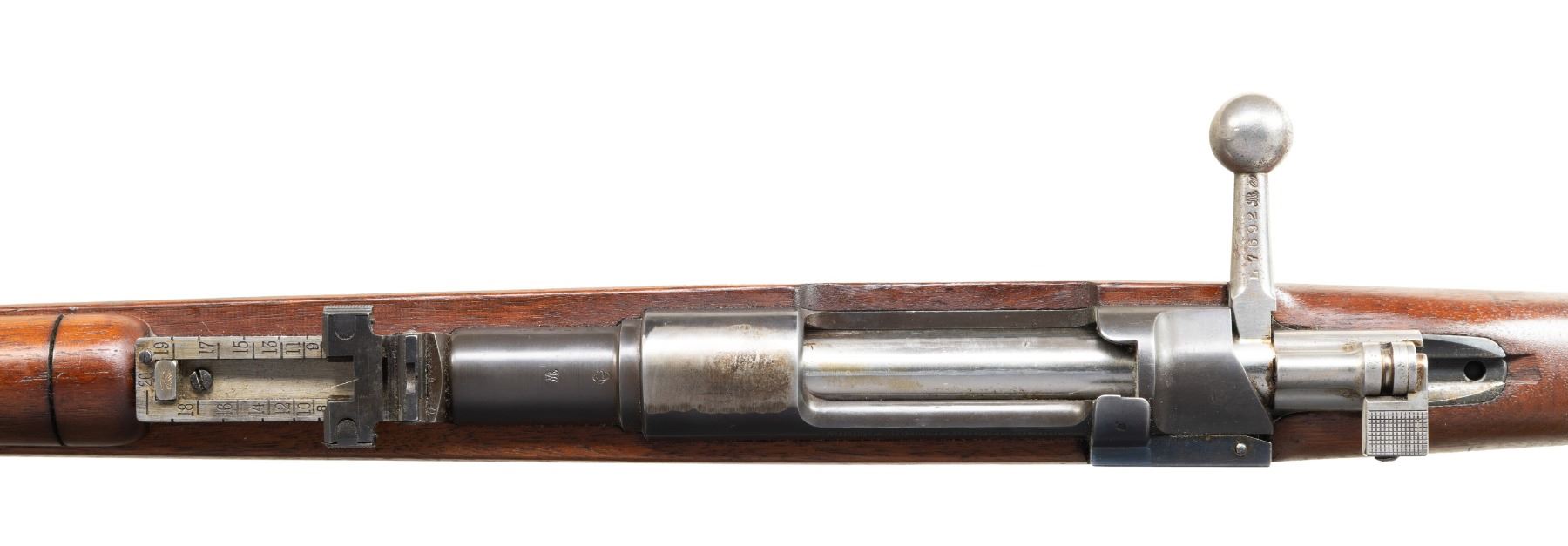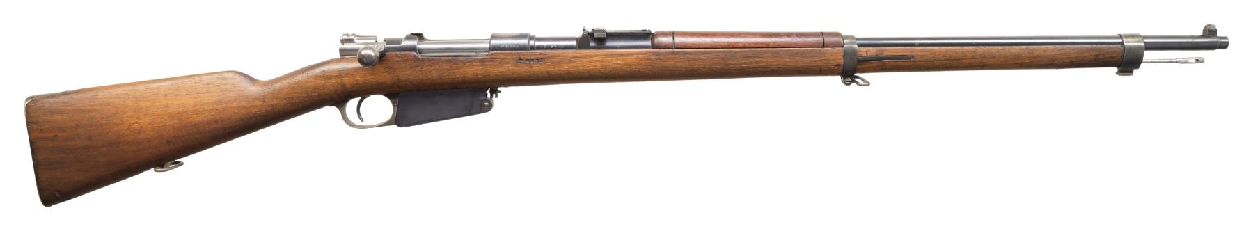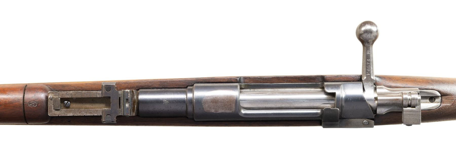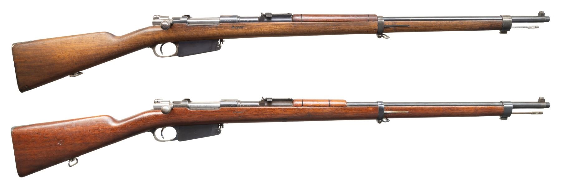 Both Cal. 7.65 Arg. 1) S# P6573. Bbl. 29". Blade front sight that appears altered for a white bead. Later pattern ladder rear sight graduated to 2000m. Rear sight tab is mismatched but other visible parts are matching to receiver. Receiver ring has typical ground crest. Blued finish. Walnut stock set with bottom mounted sling swivels & faint Argentine cartouche on right side of butt. Matching numbered cleaning rod present. CONDITION: sanded stock shows a couple tiny chips, a couple gouges, scattered dings & handling marks. Metal retains 60% arsenal blue with ground crest area on receiver ring, scattered edge wear, a couple spots of light pitting, some oxidation, areas turning gray possibly from old touch up & handling marks. Safety not engaging but action is otherwise functional when hand cycled. Bore shows a couple patches of pitting but strong rifling. (01-28197/MJC).
