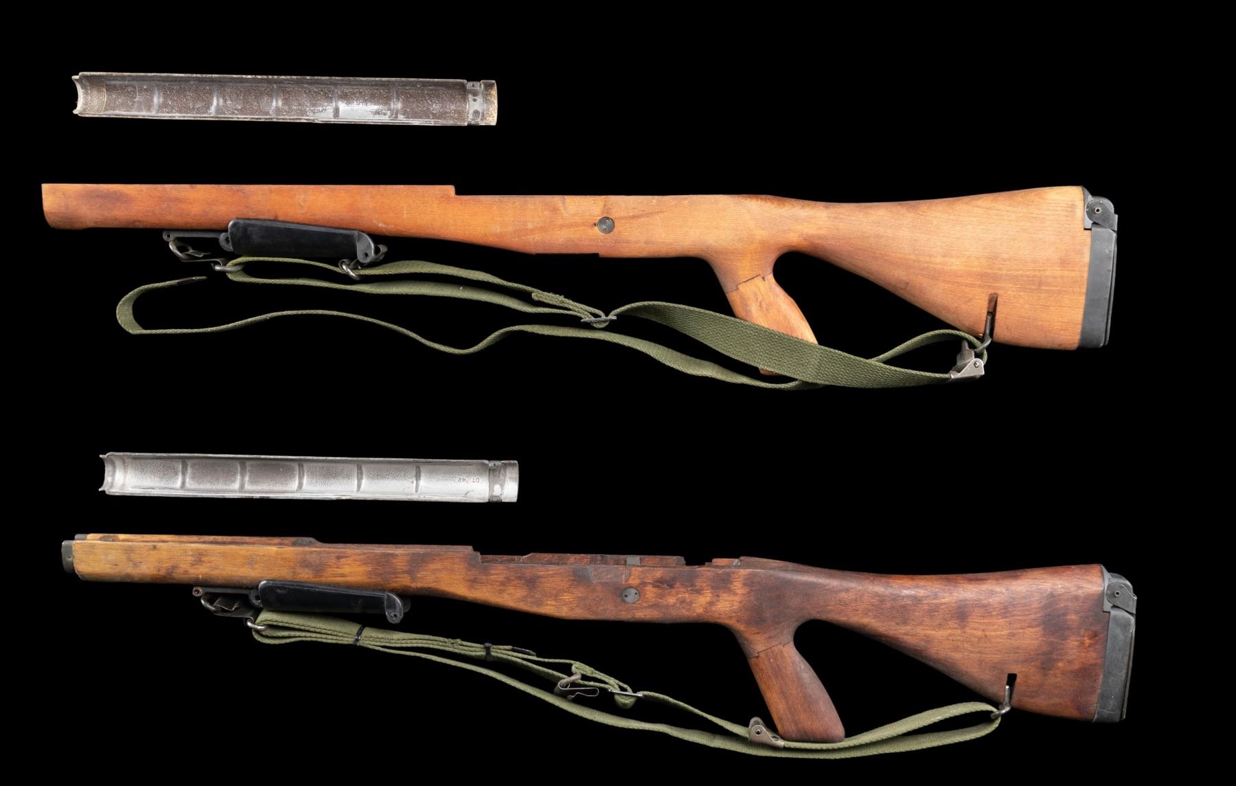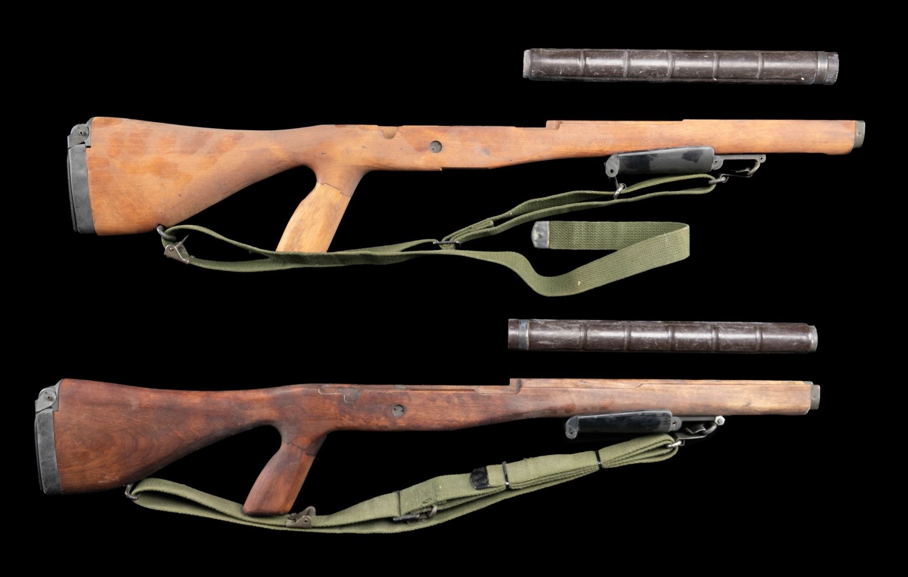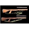 This lot consists of two M14E2 stocks that appear to be USGI but lack "P" or "DOD Eagle" markings. Buttplate assemblies, sling hardware & front grips all present. Front grip assemblies bear proper drawing numbers. Two green canvas slings & green handguards also present. CONDITION: stocks have arsenal refinished appearance with some dings & stroage wear. (02-24590-58/MJC). $500-800.