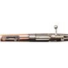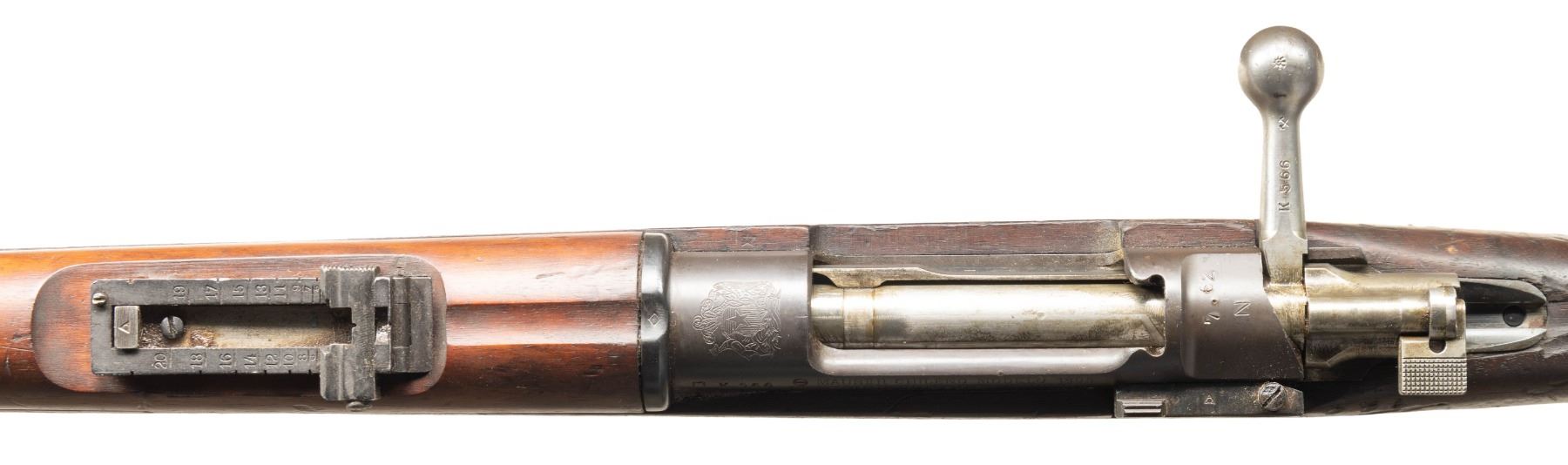1) DWM CHILEAN 1895/61 MAUSER BOLT ACTION RIFLE. Cal. 308 Win. S# K566. Bbl. 29" with Century import marking. Blade front sight that is bent. Matching numbers on bolt parts. Other parts mismatched. Receiver ring has Chilean crest. Left side of reciever has DWM & Chileano markings. Rear of receiver has "7.62 N" marking denoting arsenal upgrade to 7.62 NATO. Arsenal rework blued finish. Walnut stock set with bottom mounted sling swivels. Left side of stock has strong Chilean 1895 dated cartouche. Cleaning rod present. CONDITION: stock set shows a few chips, scattered dings, abrasions, staining & handling wear. Metal is turning gray with strong arsenal blue along the exposed edges, floorplate appears to be a plum color, some light oxidation, dried cosmoline, edge wear & handling marks. Action functions properly when hand cycled. Very good bore with strong rifling. (25-5840/MJC).
