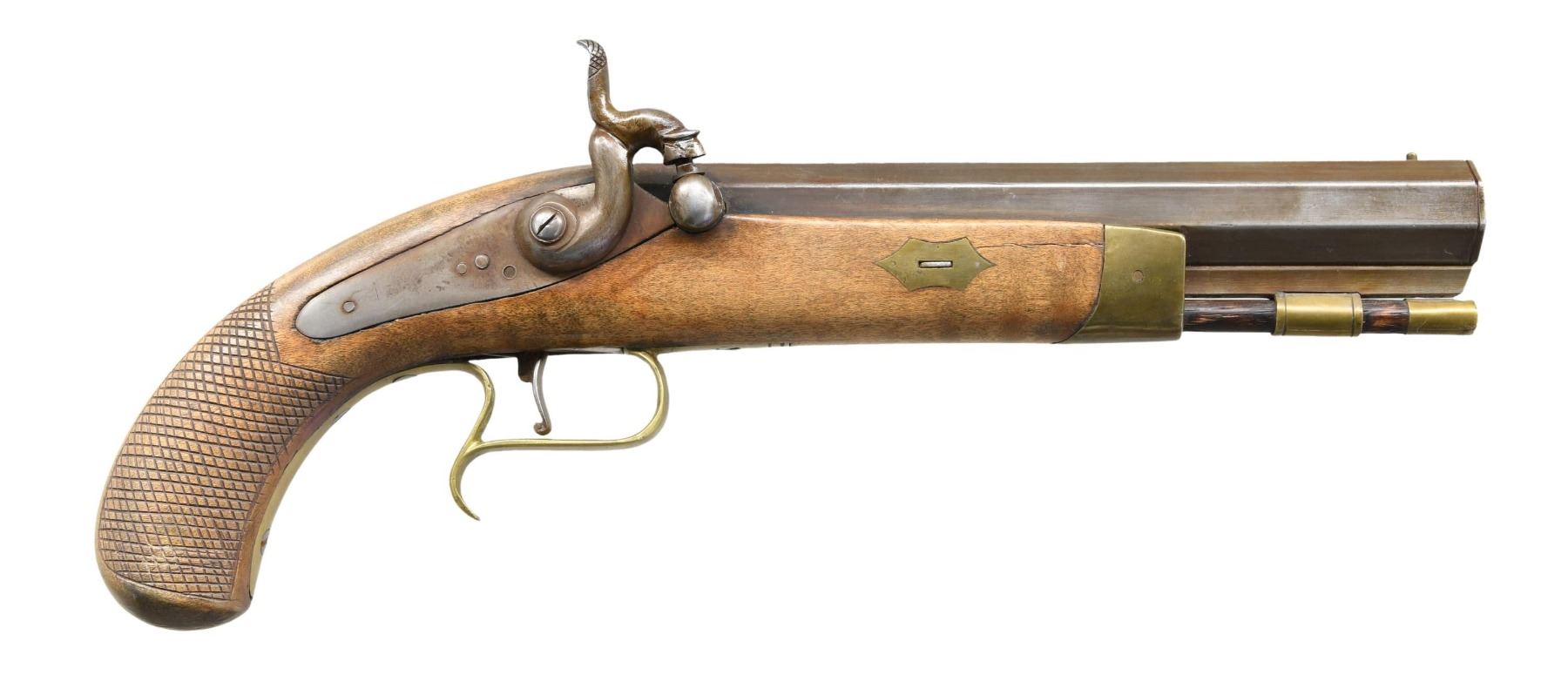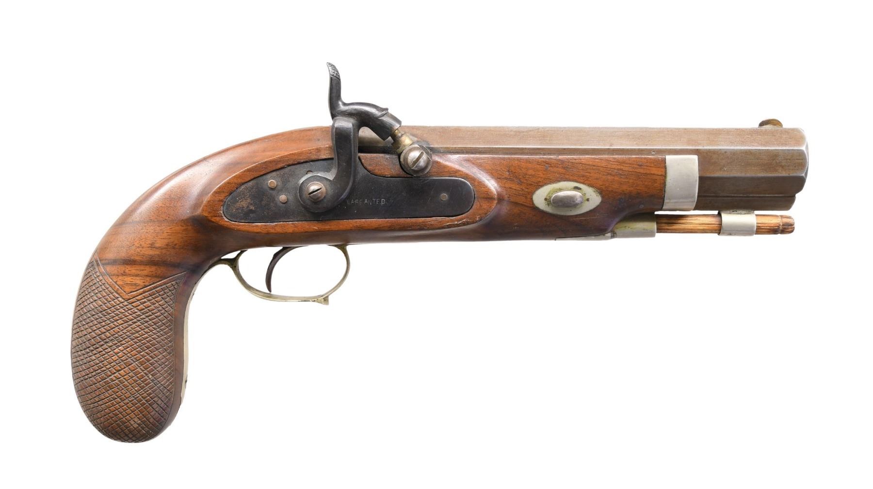 This lot consists of two percussion pistols that appear to be modern production both in Cal. 50: 1) NSN. Bbl. 7 1/2" rifled. Blade front sight. Square notch rear sight. Bbl. top crudely marked "S. HAWKEN ST LOUIS". Lock marked "WARRENTED".Bbl. has bright finish. Lock & hammer appear blued. Furniture has silver finish. Checkered hardwood stock. Hardwood ramrod. CONDITION: stock shows a notable chip ahead of trigger guard, a few other chips, some dings & handling marks. Metal shows scattered light oxidation. Bore shows scattered oxidation w/ strong rifling. (01-25342/MJC). 2) NSN. Bbl. 8" smoothbore. Brass post front sight. Bbl. crudely marked "R.V. GREEVES". Gun otherwise appears unmarked. Balance of metal appears gray. Brass furniture. Checkered hardwood stock. Brass tipped hardwood ramrod secured by brass pipe. Left side of stock has belt clip. CONDITION: right side of stock shows a crack behind nosecap, stock otherwise shows scattered dings & handling wear. Brass parts are a dull yellow patina w/ some oxidation. Metal is mostly a dull gray patina w/ scattered light oxidation. Action is functional when hand cycled. Smoothbore shows scattered oxidation. (01-25343/MJC). BOTH ANTIQUE. $300-500 for lot.
